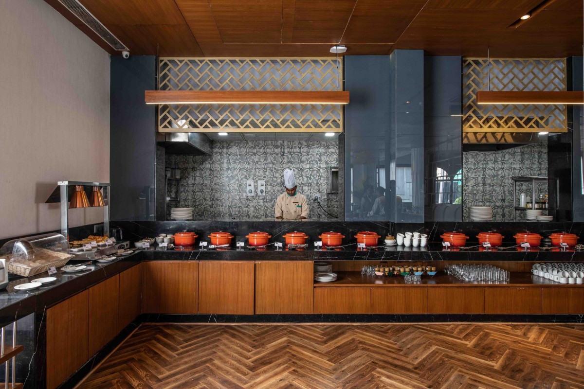 Creepers hanging from the metal crate on the pillar, the wall with metallic texture and glass ribbed lights fixtures emanating a sun-like pattern are some beautiful elements that make the space truly unique. On the other hand, the all-day diner adjoining the lobby has a warm appeal, achieved through the use of wood on both the floor and ceiling. Exuding charm and richness in equal doses, the green and blue furniture here add pop of color while the custom made light fixtures and brass jaali are the well-etched out details that amplify the design quotient of the space.