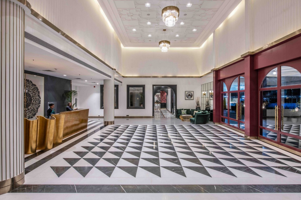 One gets a glimpse of their innate sense of design, eye for detailing and modern refined approach when one enters the hotel itself. The double-height lobby features striking triangular patterned black and white Italian marble flooring, columns latticed with brass strips and a gorgeous gold-toned front desk. Bold, beautiful and oozing with sophistication, this front desk positioned opposite the main door, has been given a fluid wave-like form. Made from wood and flexi ply, it is enveloped in gold leafing giving the table an opulent look. Behind the desk, a huge 10-ft wide painting hangs proudly on a fluted wood panel with black PU and brass edgings.