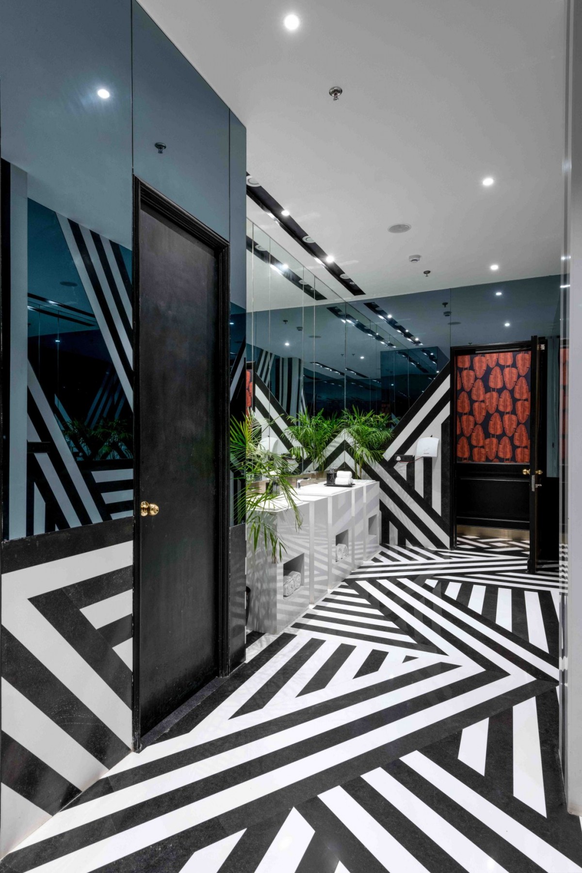 This yin-yang theme is continued in the look and feel of the restrooms on the ground floor as well. Zig-zag stripes adorn the floor and one half of the walls here. The other half gets a back painted glass covering. Green planters and a red leaf painting bring some relief to the monochromatic space. While the thoughtfully planted greenery on the lower floor is for the guests to experience a fresh-outdoorsy atmosphere in an indoor otherwise monotone setting, a dedicated indoor herb room called “SabzBagh” has been created to lay emphasis on the fact that the hotel uses its own freshly-grown herbs in the restaurants.