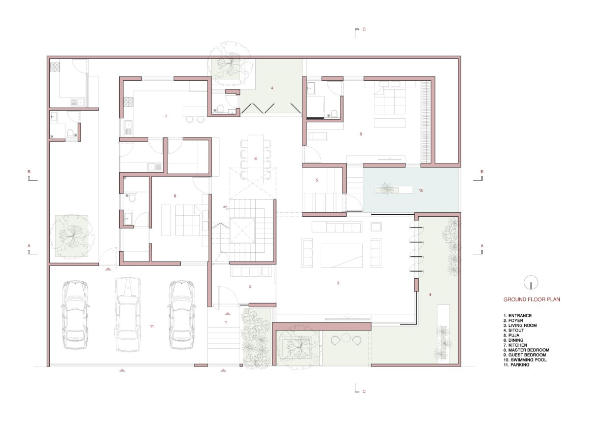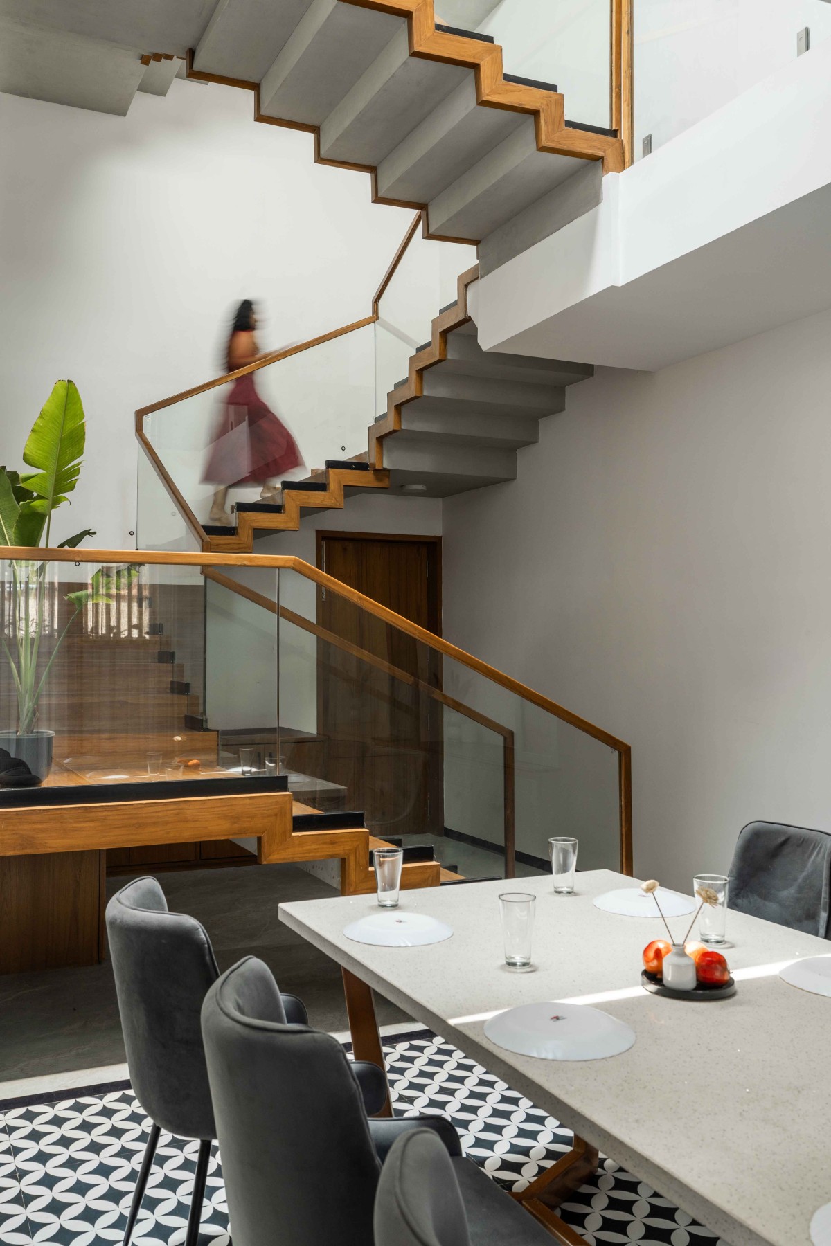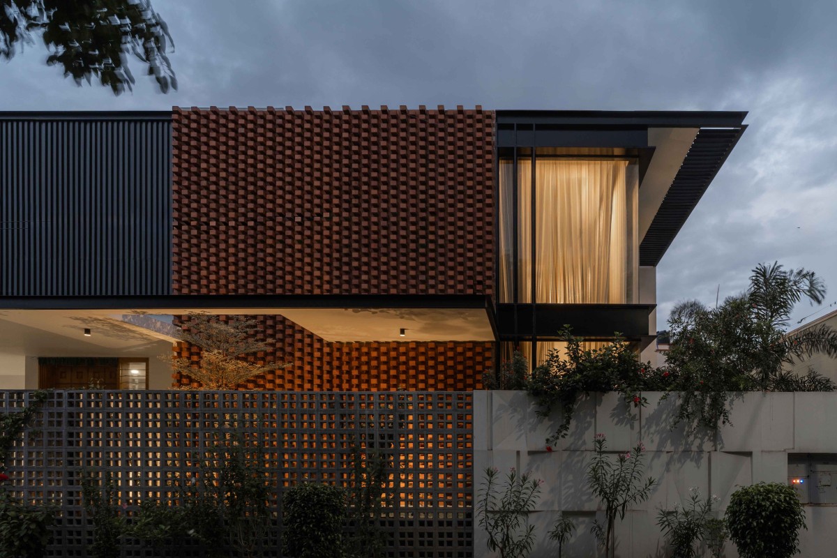 Rooted In Rawness It all begins at the facade. Hand-sized and deeply functional, these tiny terracotta blocks, almost like a veil, bind the entire home. Laid out with calculated gaps, it offers just enough privacy and just enough shadow to cool the interiors. Beyond the terracotta skin, the house reveals its rawness—exposed concrete and slender steel sections that frame the structure together. No flashy forms nor bold gestures. It’s a simple palette, but nothing about it feels plain. Every material has a purpose, and none of it feels like a statement piece.