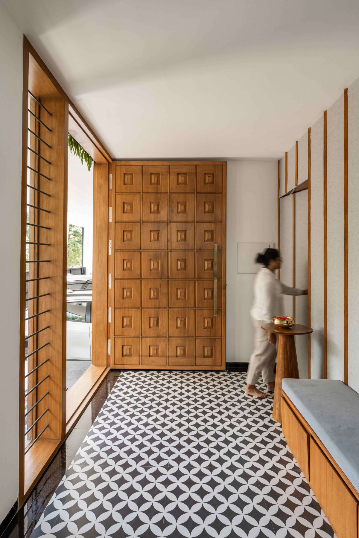 A tall, nine-foot custom-deigned door greets you into a small foyer, from where the tone of the house begins to unfold. Stepping inside, rooms are placed to follow the sun—warm at sunrise, mellow by noon, almost cinematic by dusk. As you enter the living room, daylight pours in from two sides, filtered through the terracotta screen and a long stretch of sliding glass. There’s no ornament here, just well-edited warmth. A muted floor, soft materials, and minimal furniture that highlights the presence of wood. You could sit here in silence and watch shadows shift through the day.