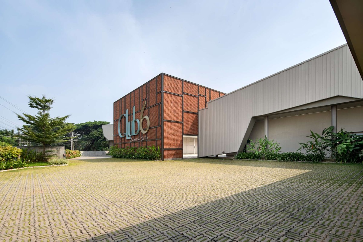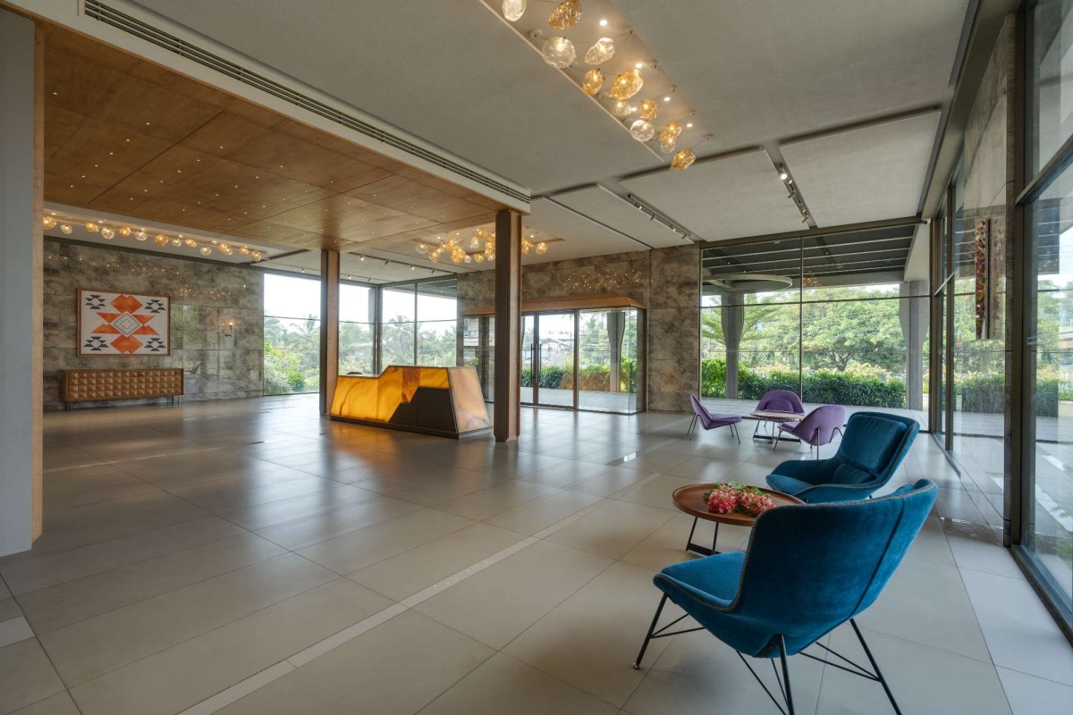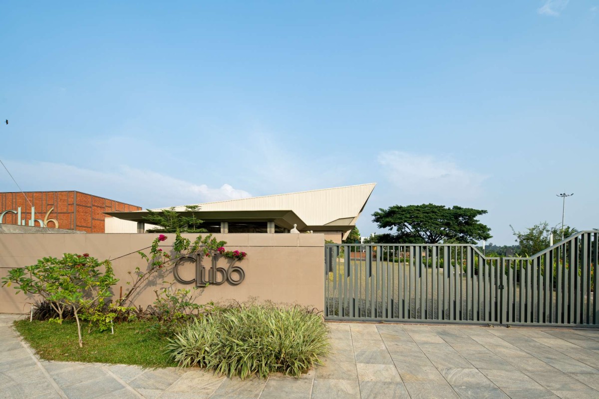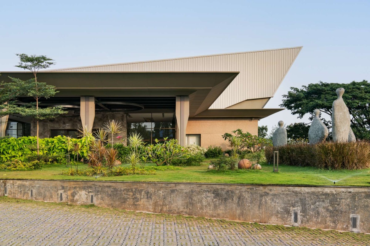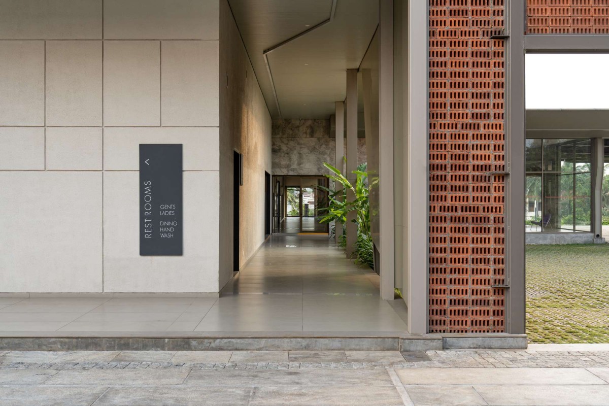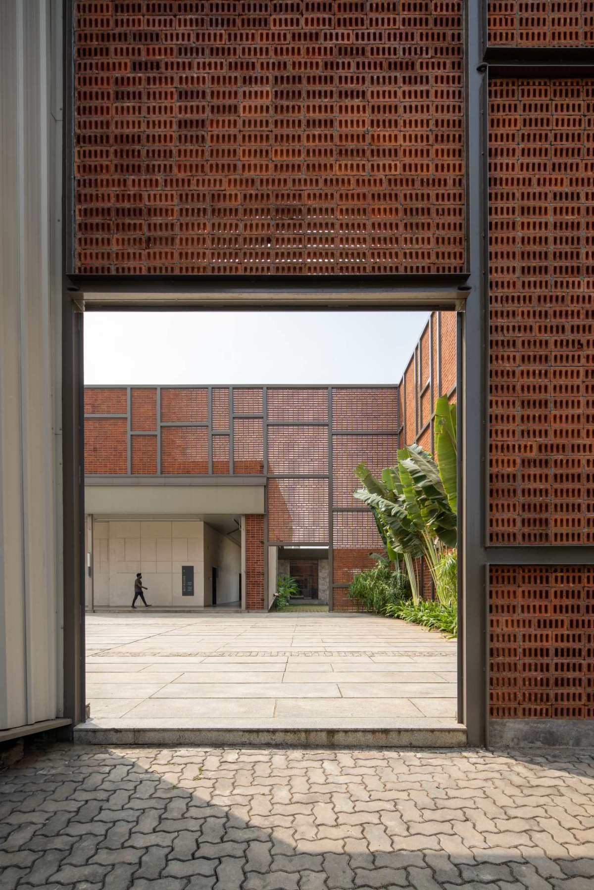 The centrally placed courtyard, a transitional space facing west is contained in a monolithic construction of clay breeze block, that helps reduce the harsh glare and becomes the branding canvas, thus diffusing the two cladded volumes.