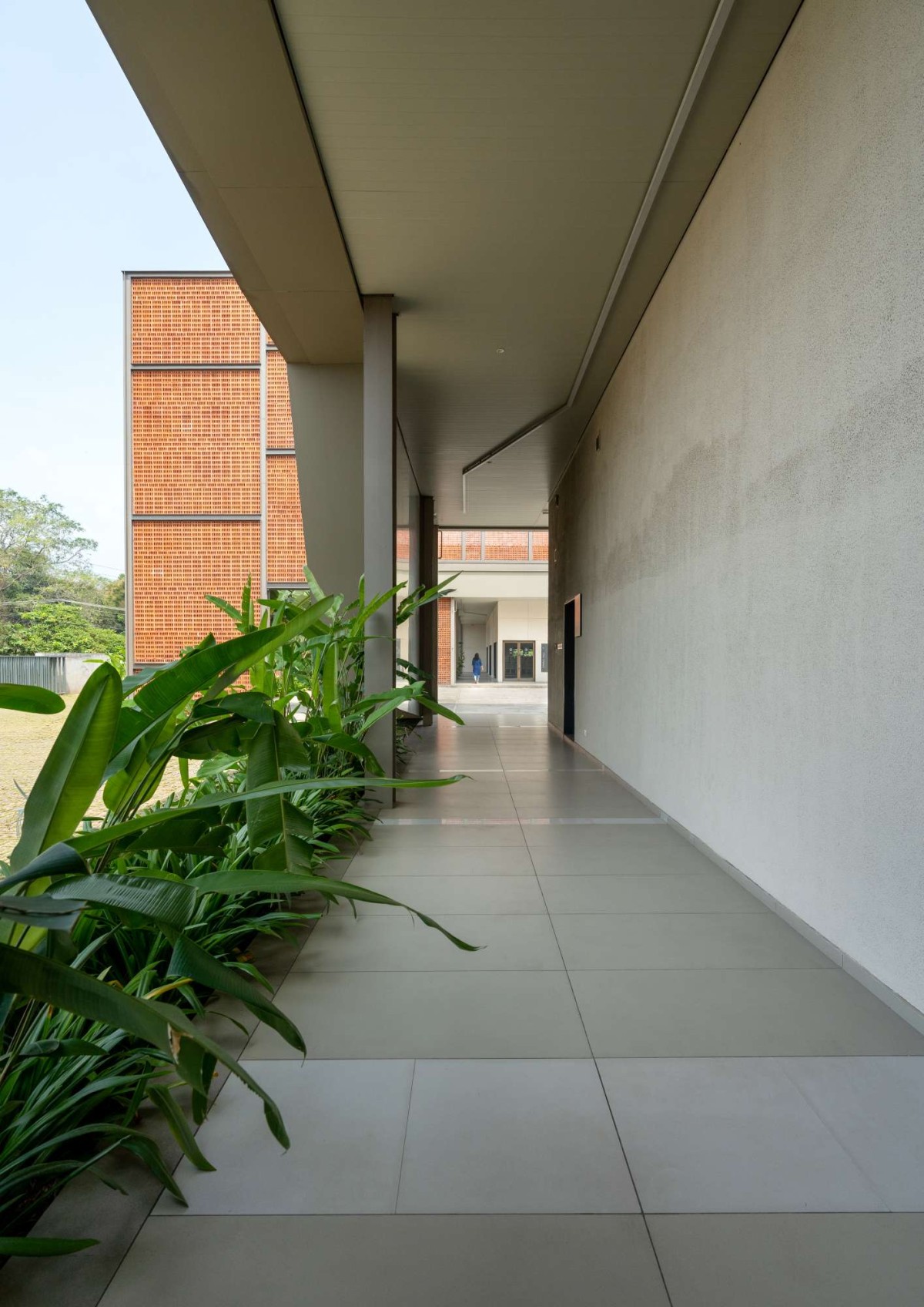 Major facades are aligned East-West, parallel to the access road in a simple construction order and are protected from heat and glare through extended sheet roof cladding protecting the built masonry walls from the harsh climatic conditions. These volumes are topped with sweeping monoslopes and are closed with chiseled edges to keep the structure cost-effective and to manage the rainwater during the monsoons. With respect to the proximity and mass, the main hall extends to form the entrance lobby and porch and stimulates the user flow to the other spatial volumes.