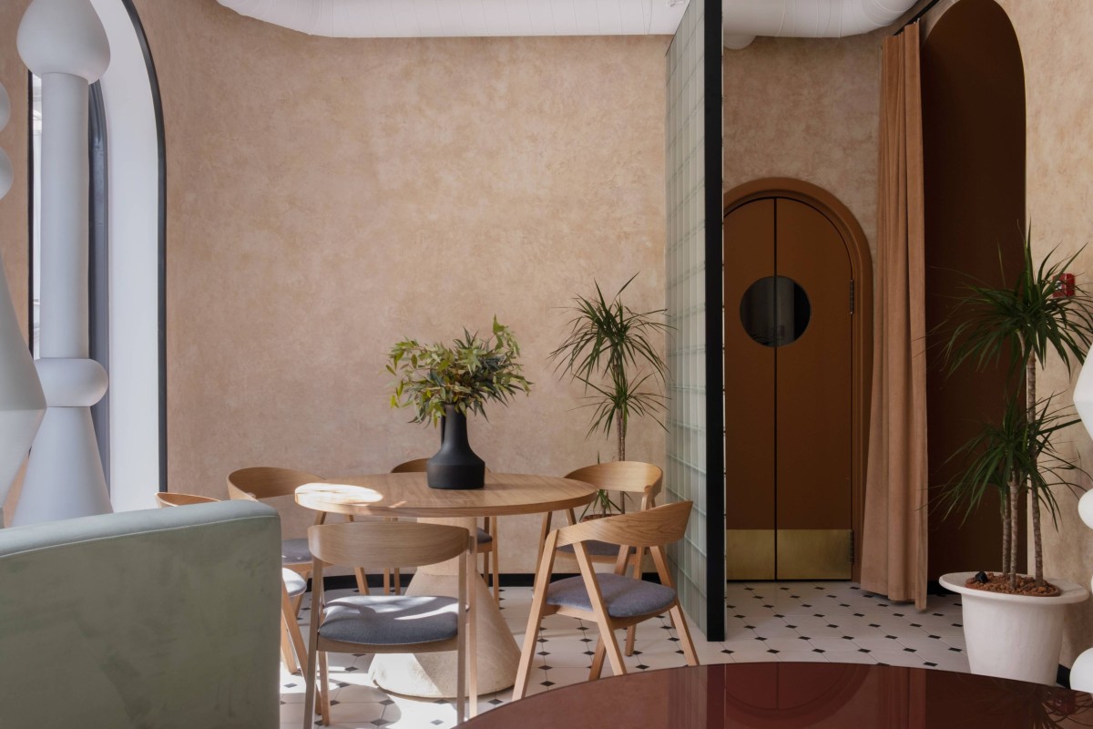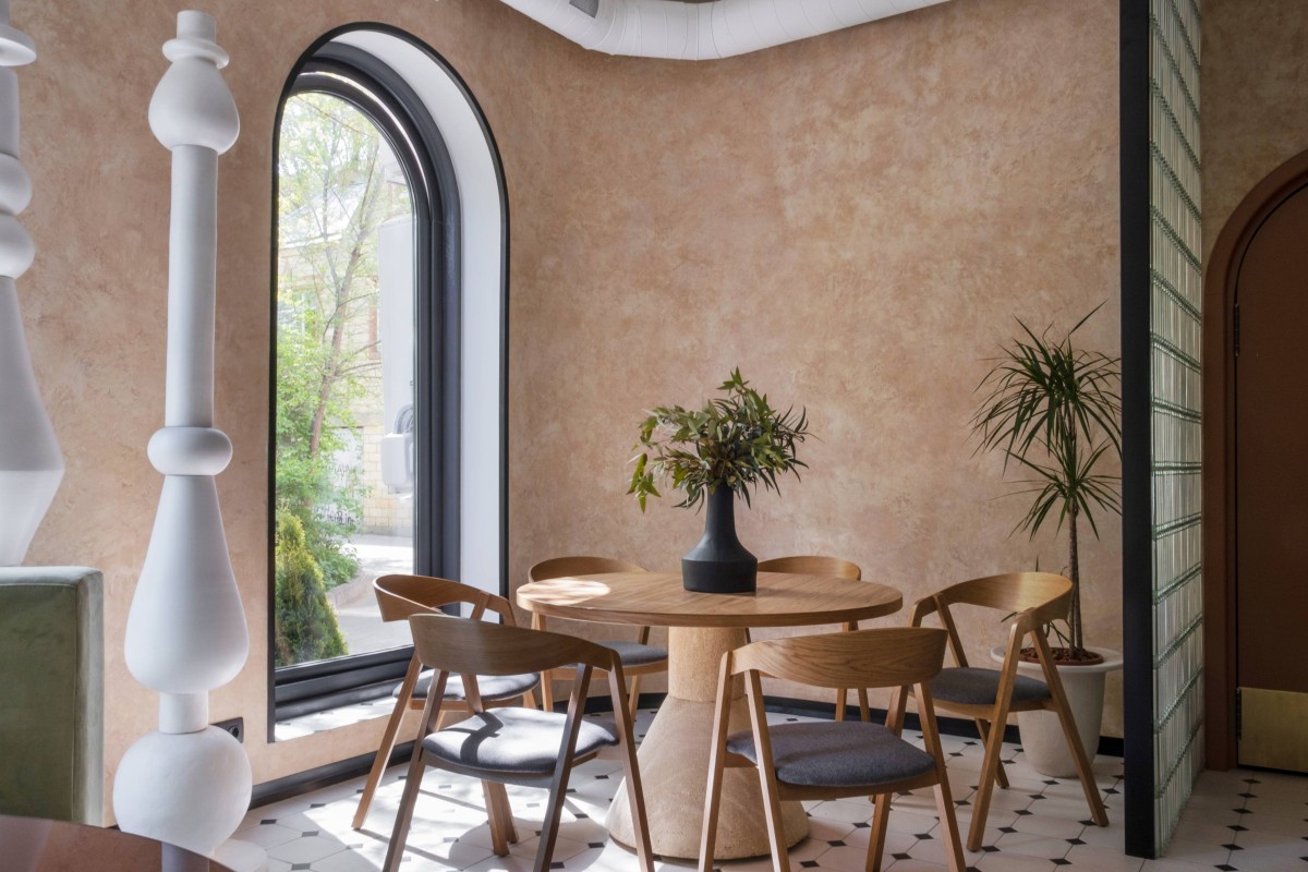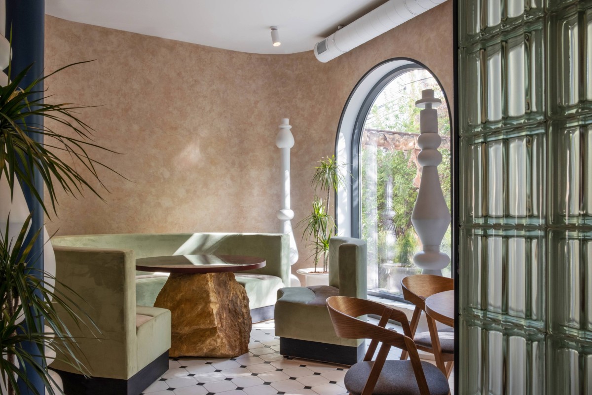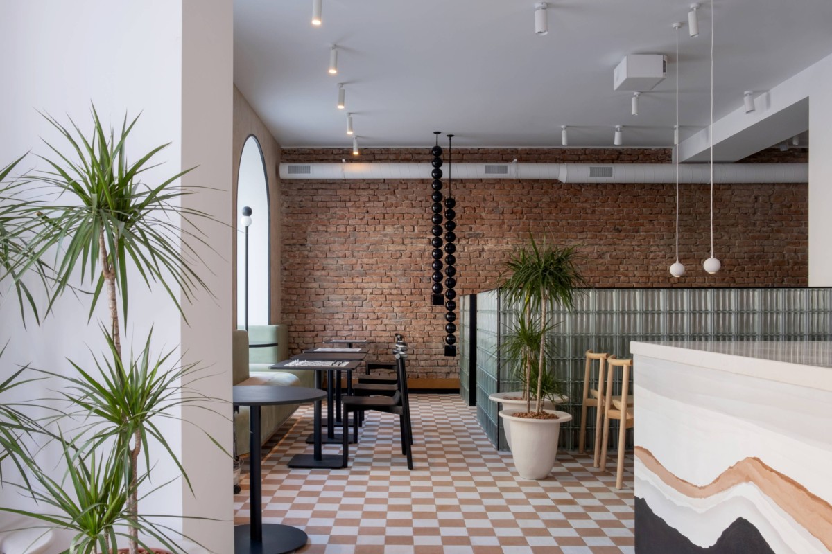 The key goal was to carefully preserve the unique atmosphere inside the historic building. That is the principal reason for the soft and natural colour choice, along with the brick wall and properly fitted to it, chess floor tiles. There are echoing curvilinear sofas, arched doorways in the interior, and a painted wave on the wall and bar counter that links the whole space all together.