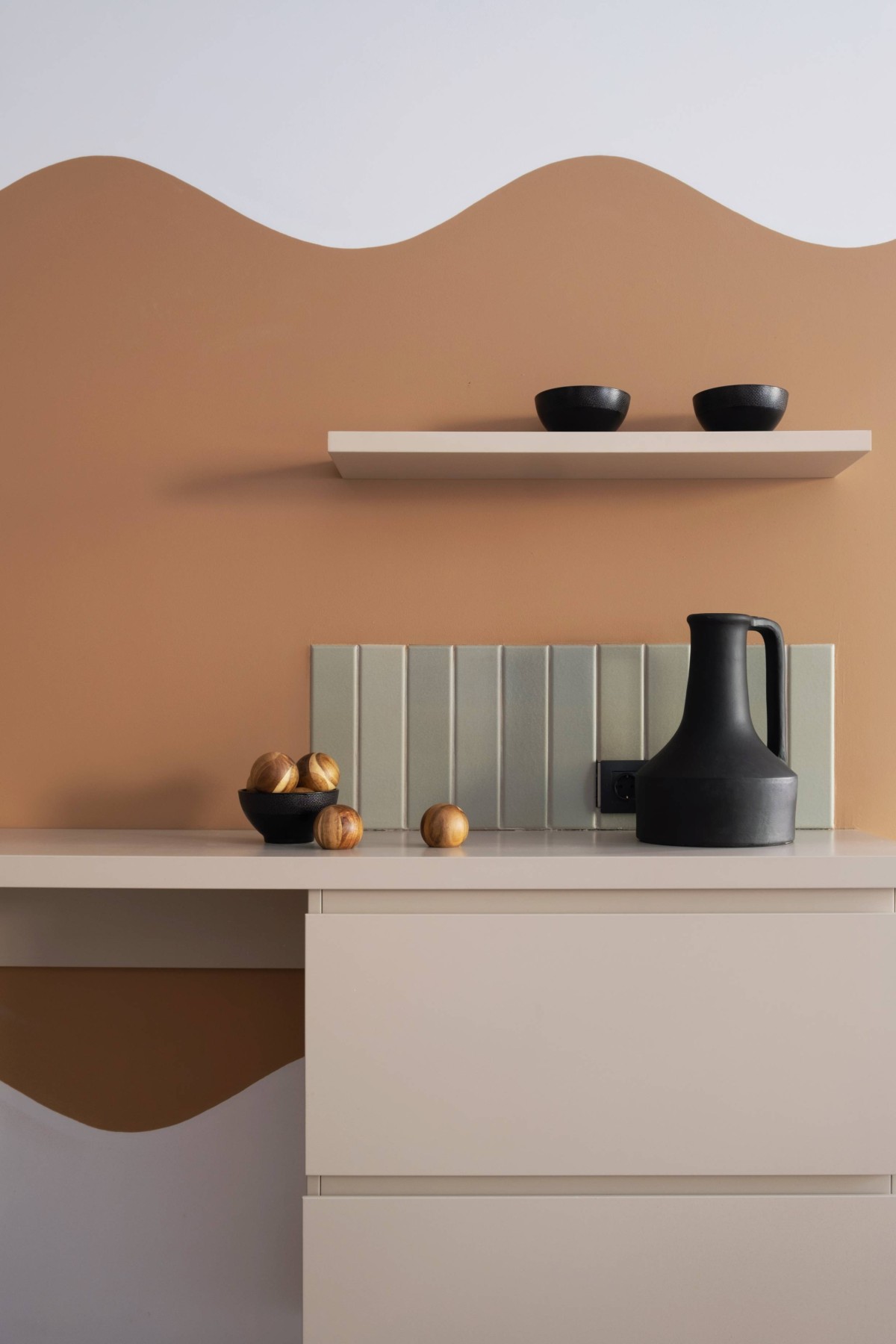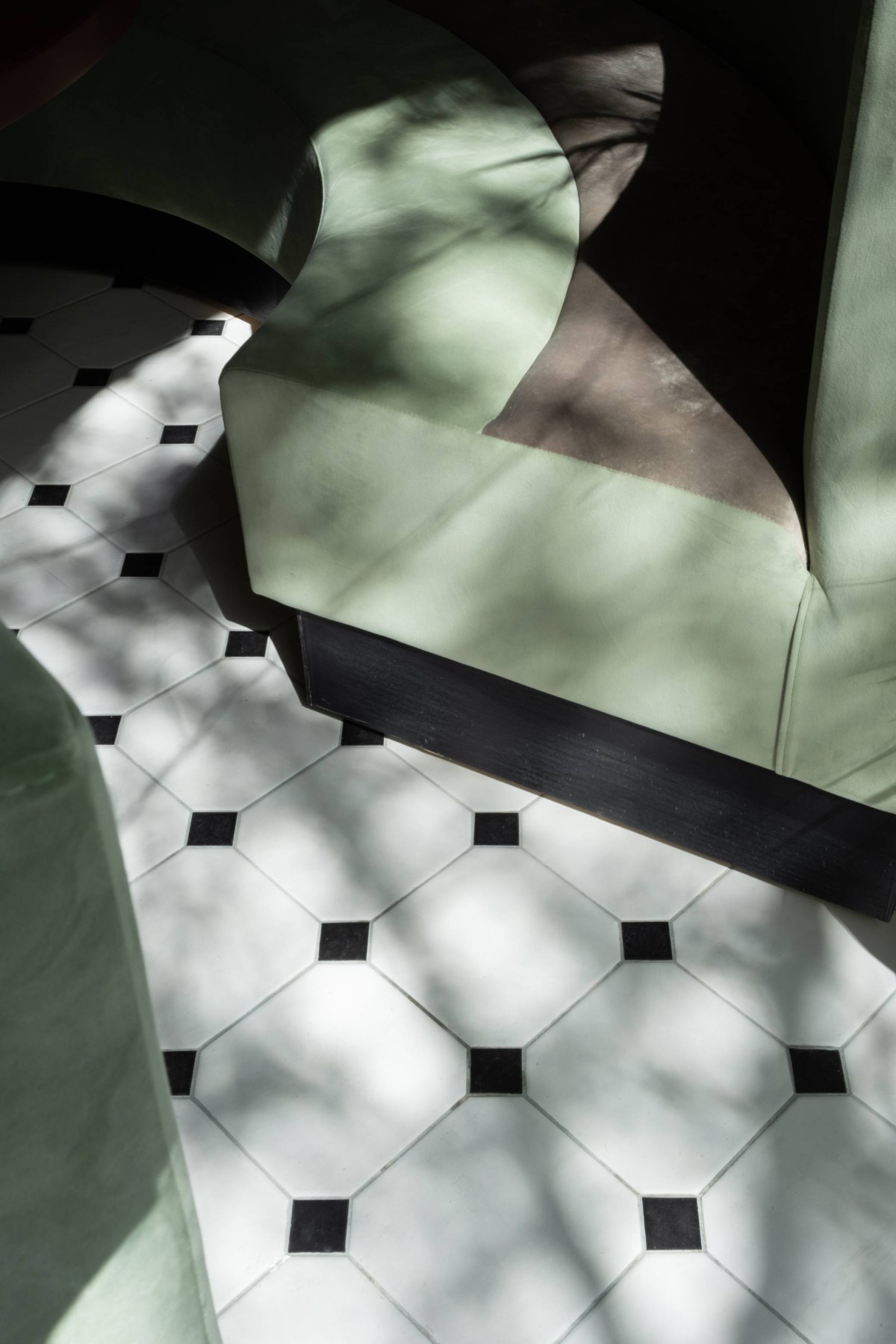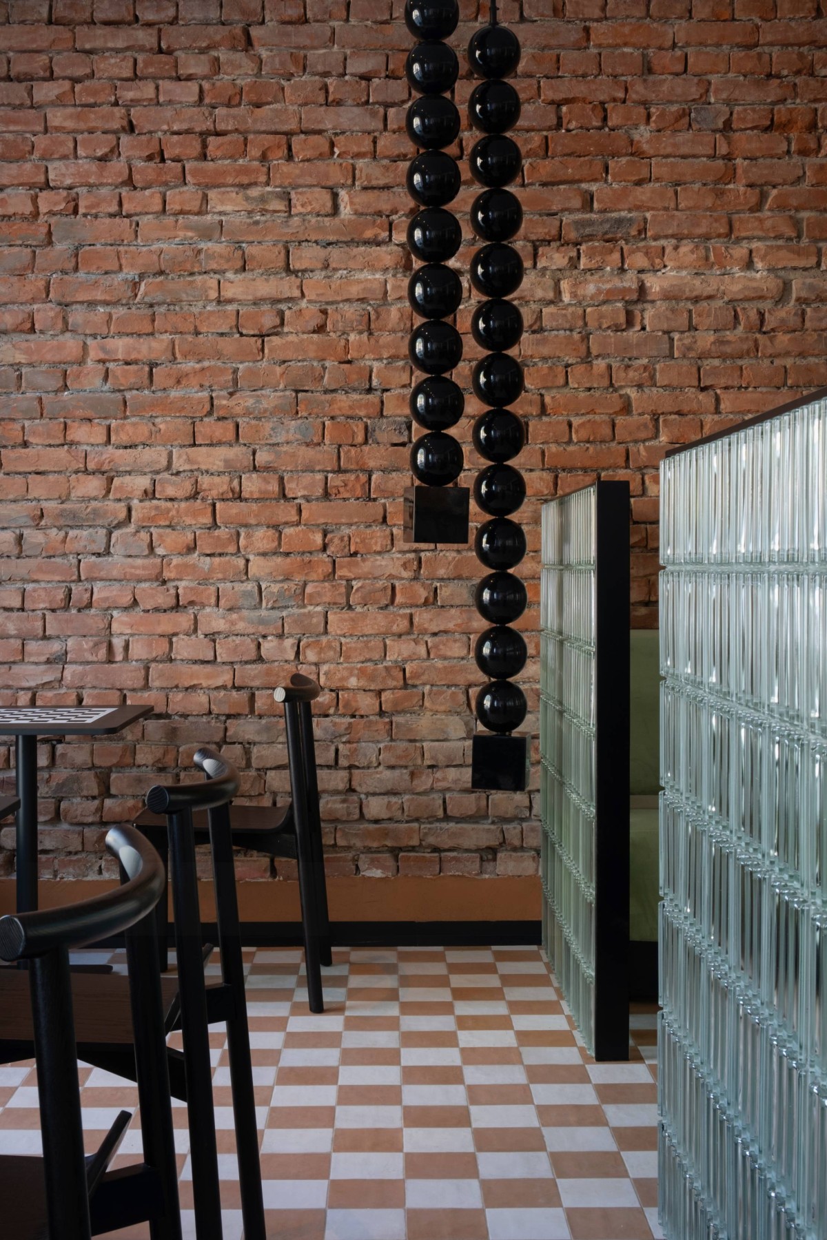 At the entrance, we can instantly notice a bar counter painted by a local artist. The undulating lines and shelves accurately represent the beauty and uniqueness of the coffee-coloured palette. Everything is intentionally designed in delicate characteristic hues that naturally fit the floor tiles, in which there is a hint of a chess board. Pieces of furniture and decorative lights were designed by architects' sketches, made precisely for this project and executed by local craftsmen.