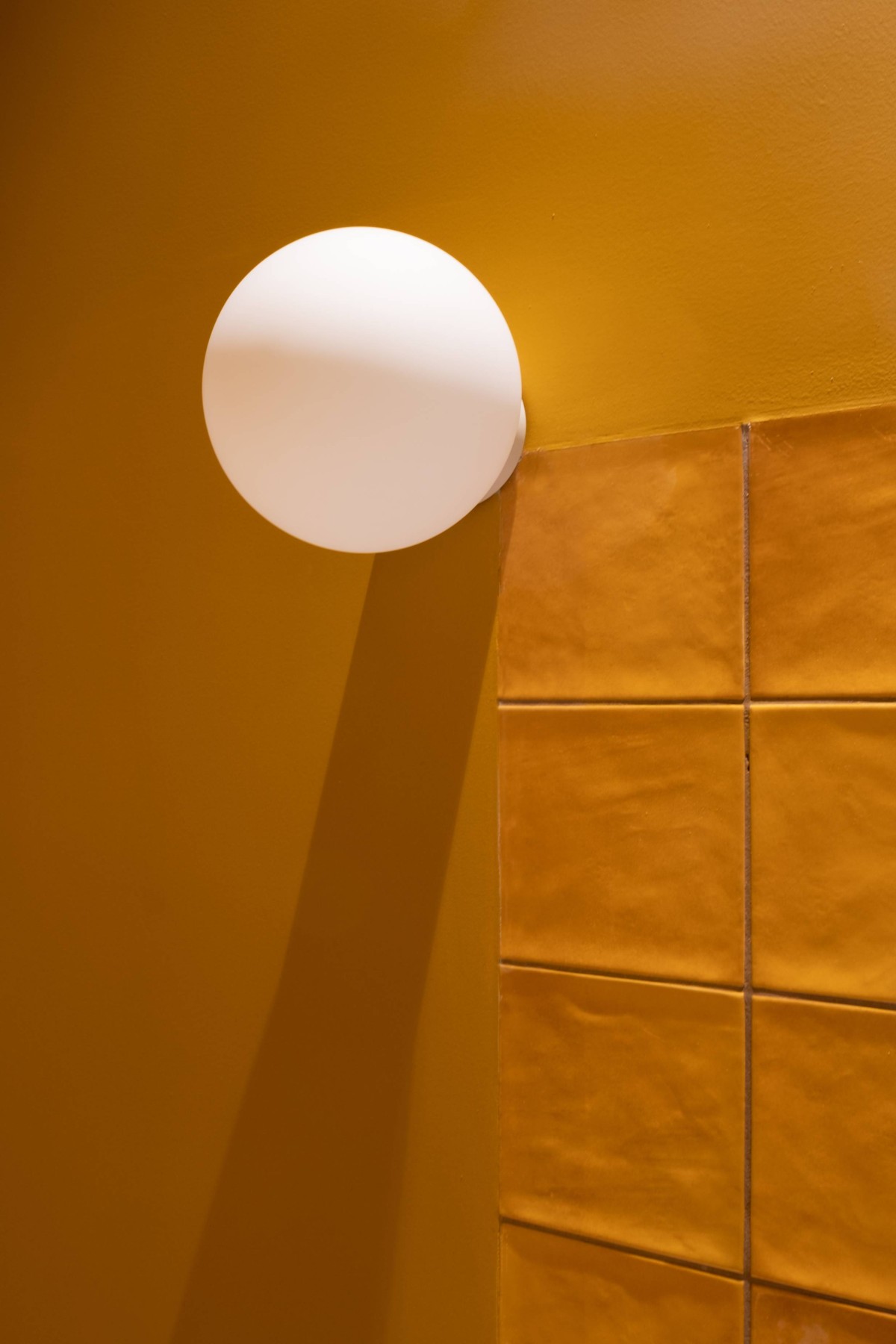 The bathroom area became the brightest accent in the project. The team’s desired result was to positively affect the guests. The space was thoughtfully designed with arch doorways. Radiant ochre-coloured tiles, a round wall sconce, and a custom-made rich blue concrete washbasin — all these essential elements are properly designating this room as the most vivid spot. The washbasin’s simple geometric forms perfectly adapt the flowing and winding lines of the space, naturally creating an ideal balance.