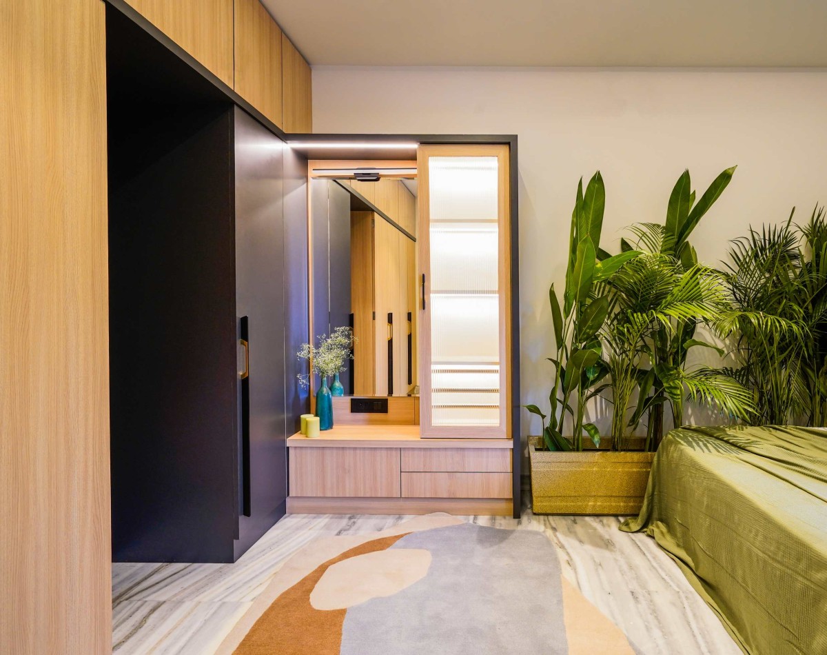 One of the room’s most compelling details is the organic full-length mirror framed within a tall arch. Its fluid silhouette contrasts beautifully against the room’s otherwise linear rhythm, becoming both a design statement and a playful anchor. Placed before it is a shaped Cocoon rug in tones of rust, ivory, and mustard, which enlivens the floor with bold geometry and soft tactility. Alongside, a drop console in solid mango wood adds sculptural depth with its carved legs, completing the vignette with a balance of craft and functionality.