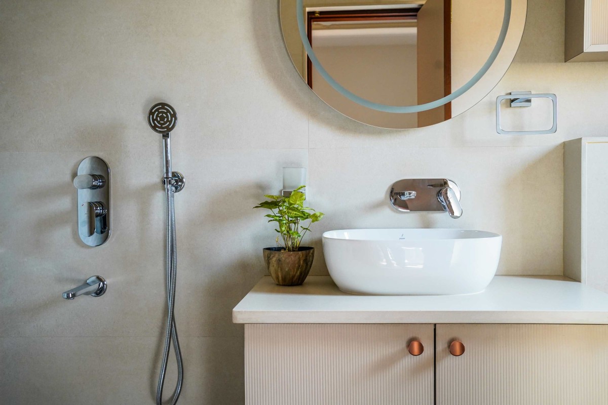 The attached bath continues the dialogue of simplicity and detail—pared-back stone finishes, clean lines, and a frameless round mirror that enhances the sense of calm. Together, these elements make the elder son’s bedroom a true retreat: restful in its palette, inventive in its geometry, and human in its touch.