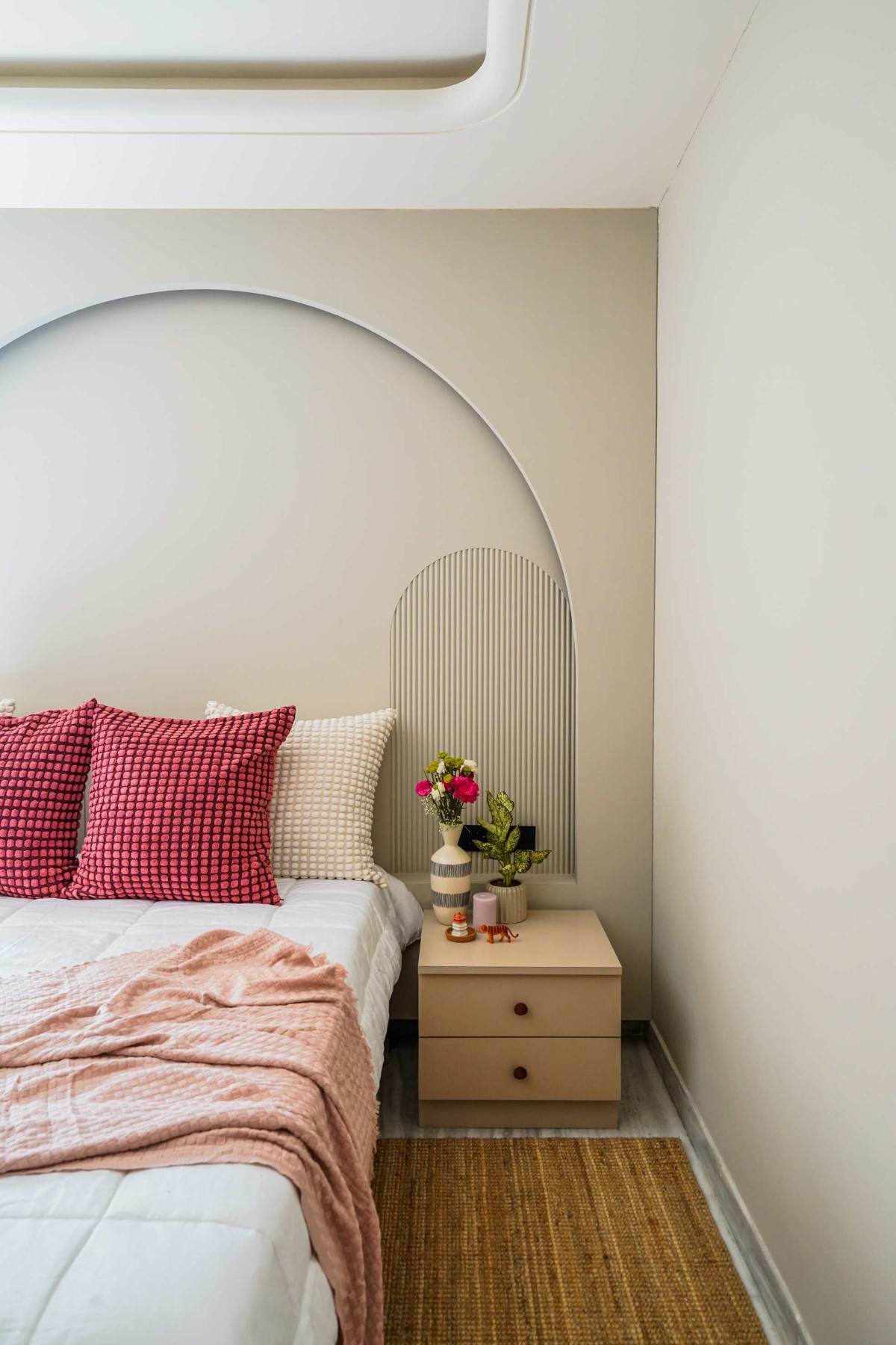 The elder son’s bedroom carries forward Studio Timescape’s ethos of crafting spaces that are as serene as they are striking. Here, geometry becomes both structure and ornament. The bed’s backdrop is defined by a sweeping arched panel with soft grooves, illuminated with concealed lighting that transforms it into a glowing halo. This subtle architectural gesture elevates the room from ordinary to sculptural, allowing the walls themselves to participate in the design.