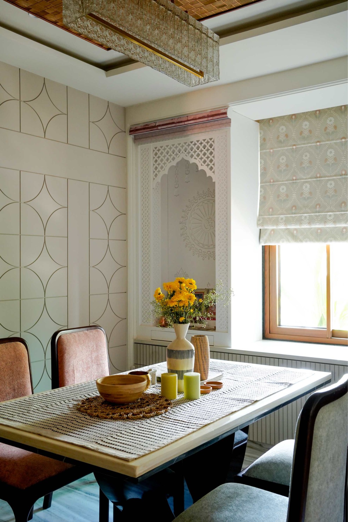 What makes this room remarkable are the thoughtful layers of design. A carved niche with jali-inspired detailing doubles as a prayer corner, grounding the space in cultural resonance. Adjacent to it, the pooja room clad in Onyx stone adds a luminous depth, glowing subtly with natural veining and creating a spiritual anchor within the home. The dining wall also conceals a hidden door seamlessly integrated into the panelling, a detail that exemplifies Studio Timescape’s belief in design that is as functional as it is refined.