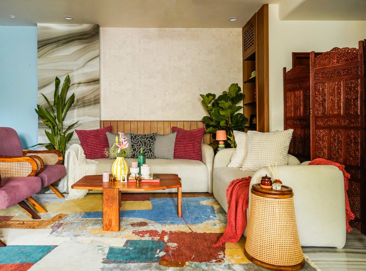 The centrepiece of the room is a striking Cocoon Fine Rug, whose painterly abstraction introduces an artful dynamism underfoot. Its layered hues act as a unifying canvas, holding together the understated walls, the warmth of wood, and the softness of upholstery. Upon it rests a collection of Furnicasa furniture in Babool (Acacia) wood, chosen for its rich grain and durability. The design of each piece balances comfort with craft- rounded sofas upholstered in quiet neutrals, paired with cane-accented lounge chairs that nod to tradition while keeping the form contemporary.