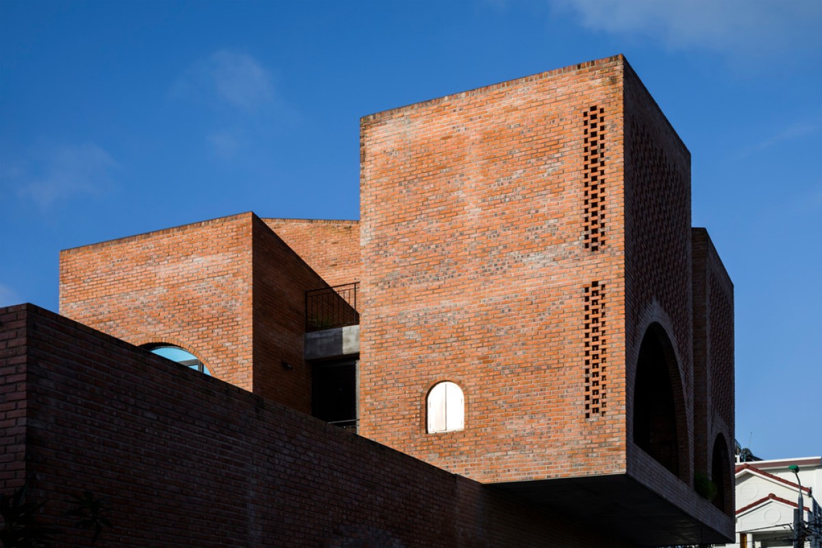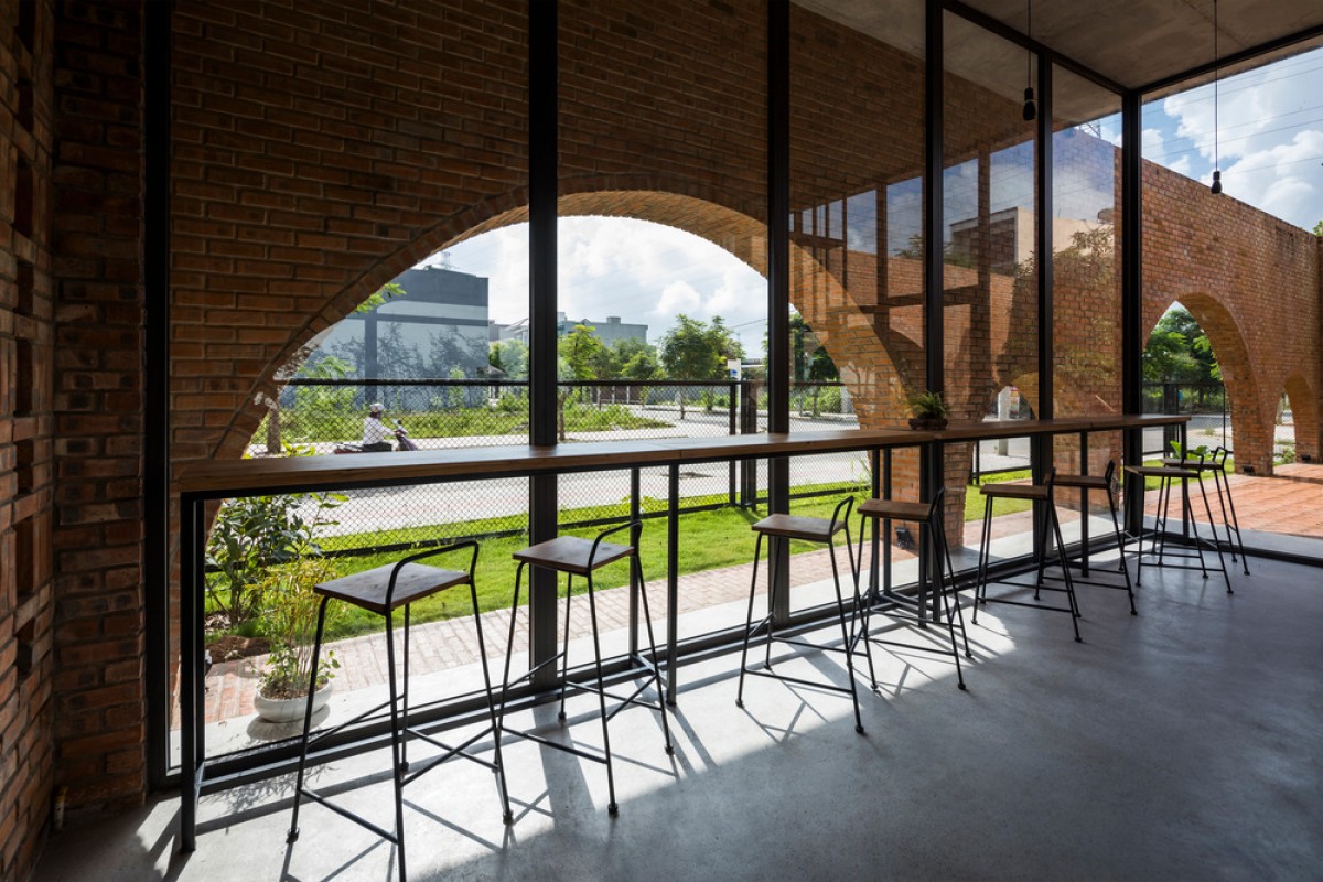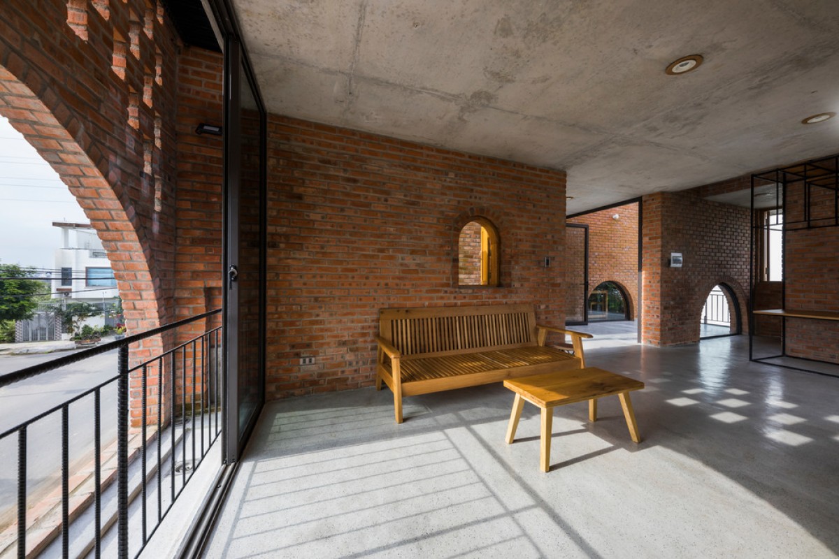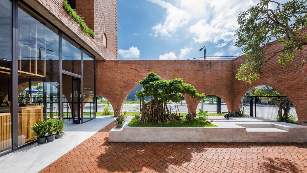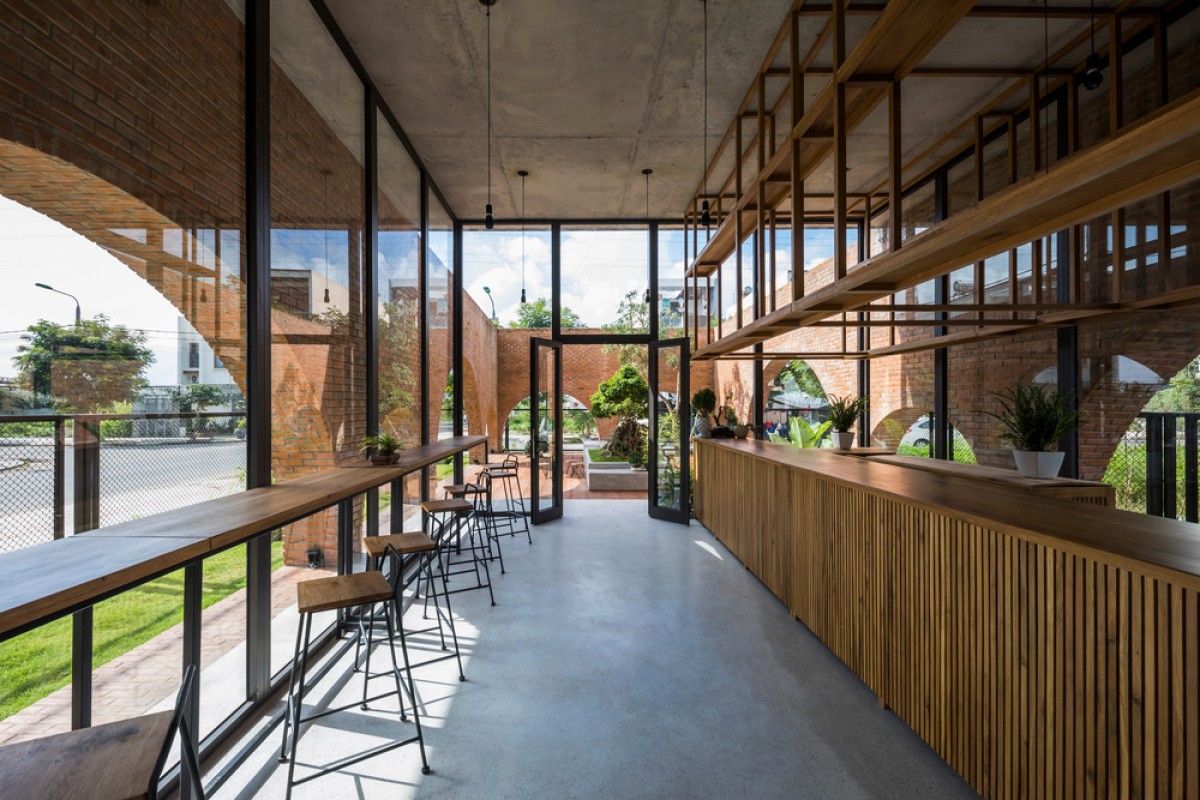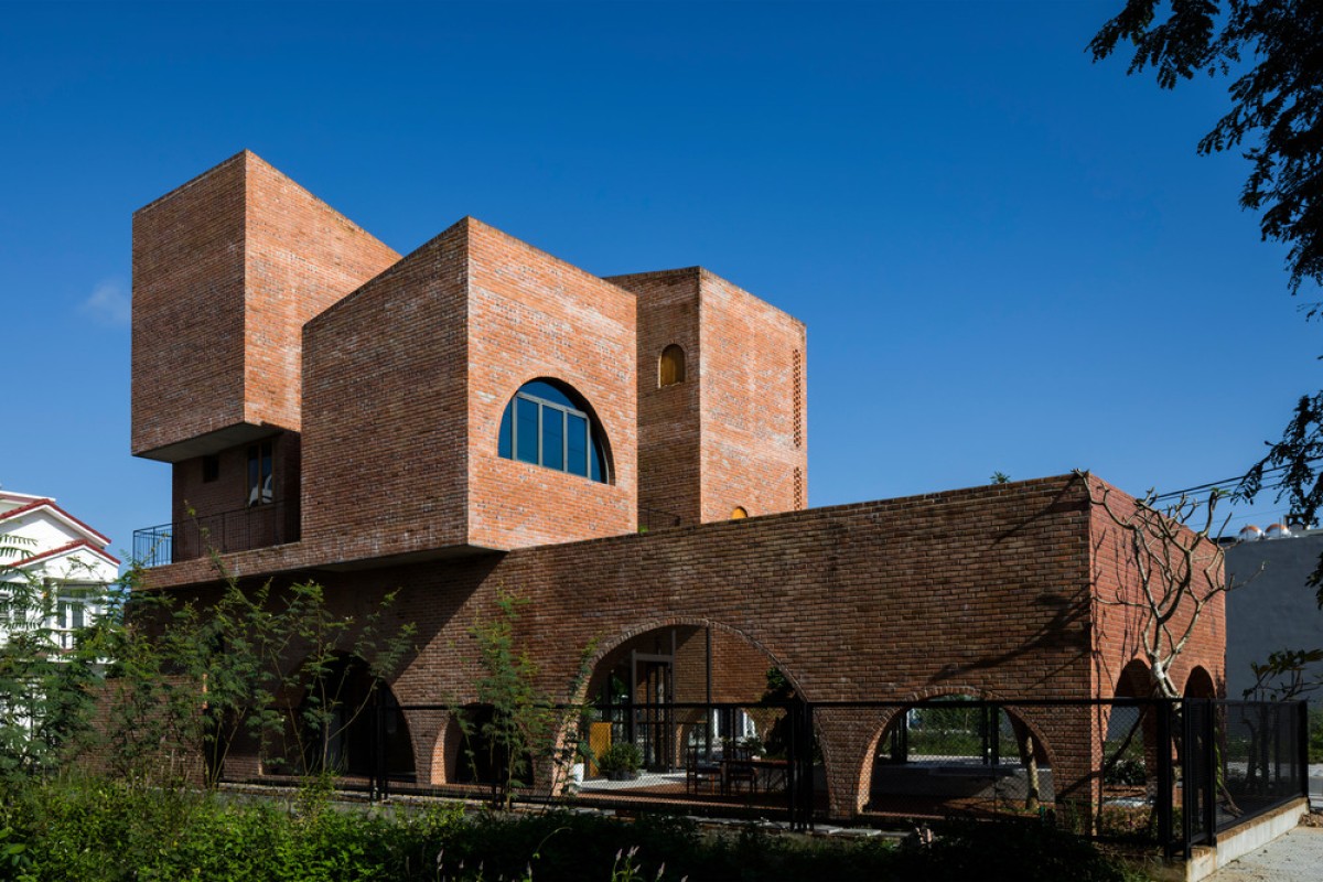 Located in an urban renewal zone by a river in Da Nang, Vietnam, this residential construction uses the ground floor as a small cafe formed by rectangular brick walls, while the upper floor serves as the living space of a nuclear family, which is combined by three different blocks on a square plane.