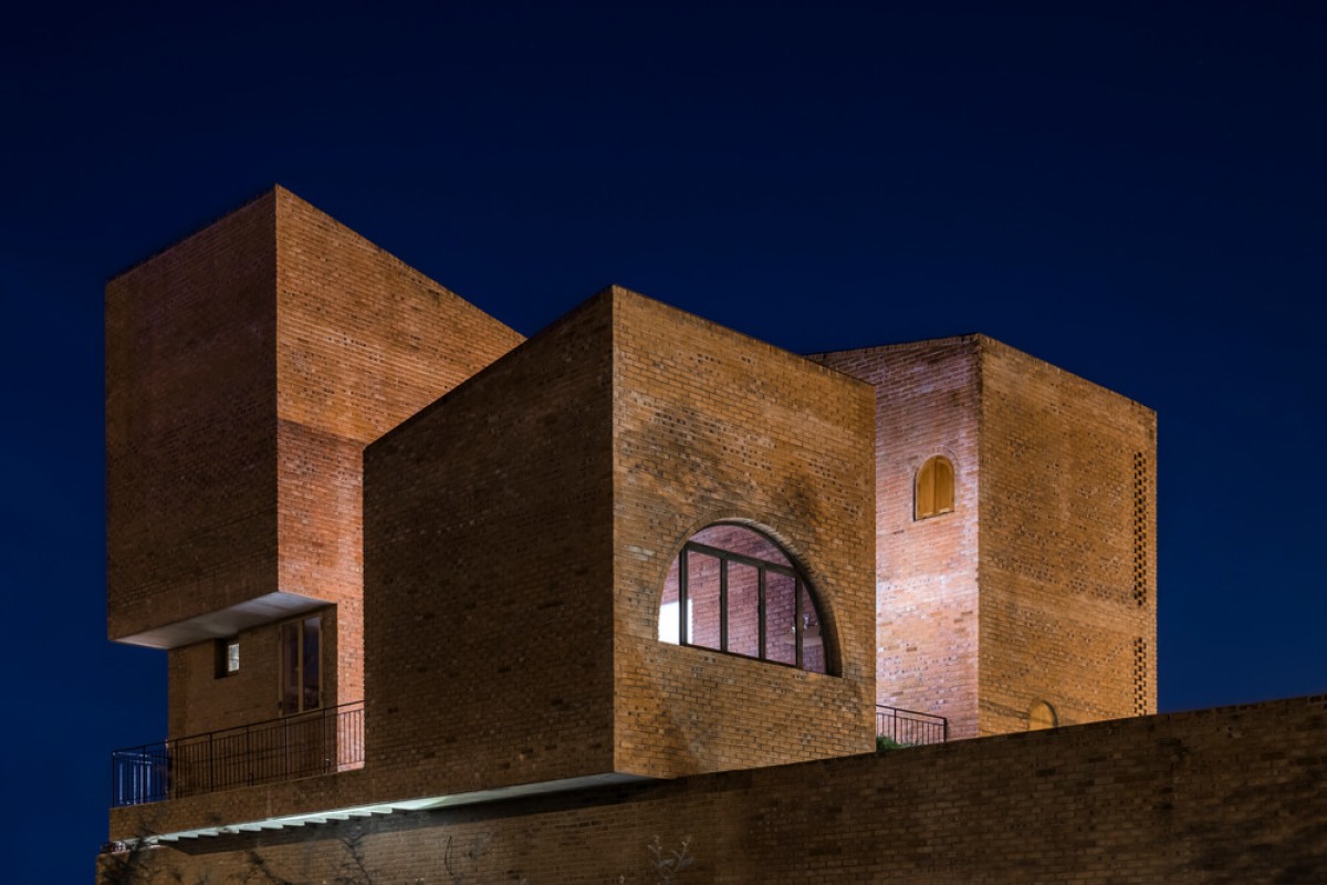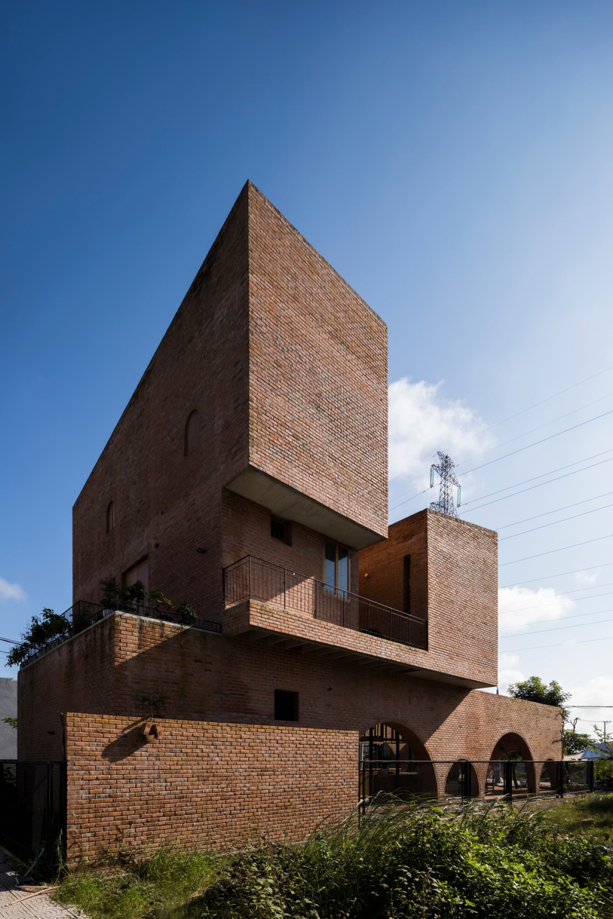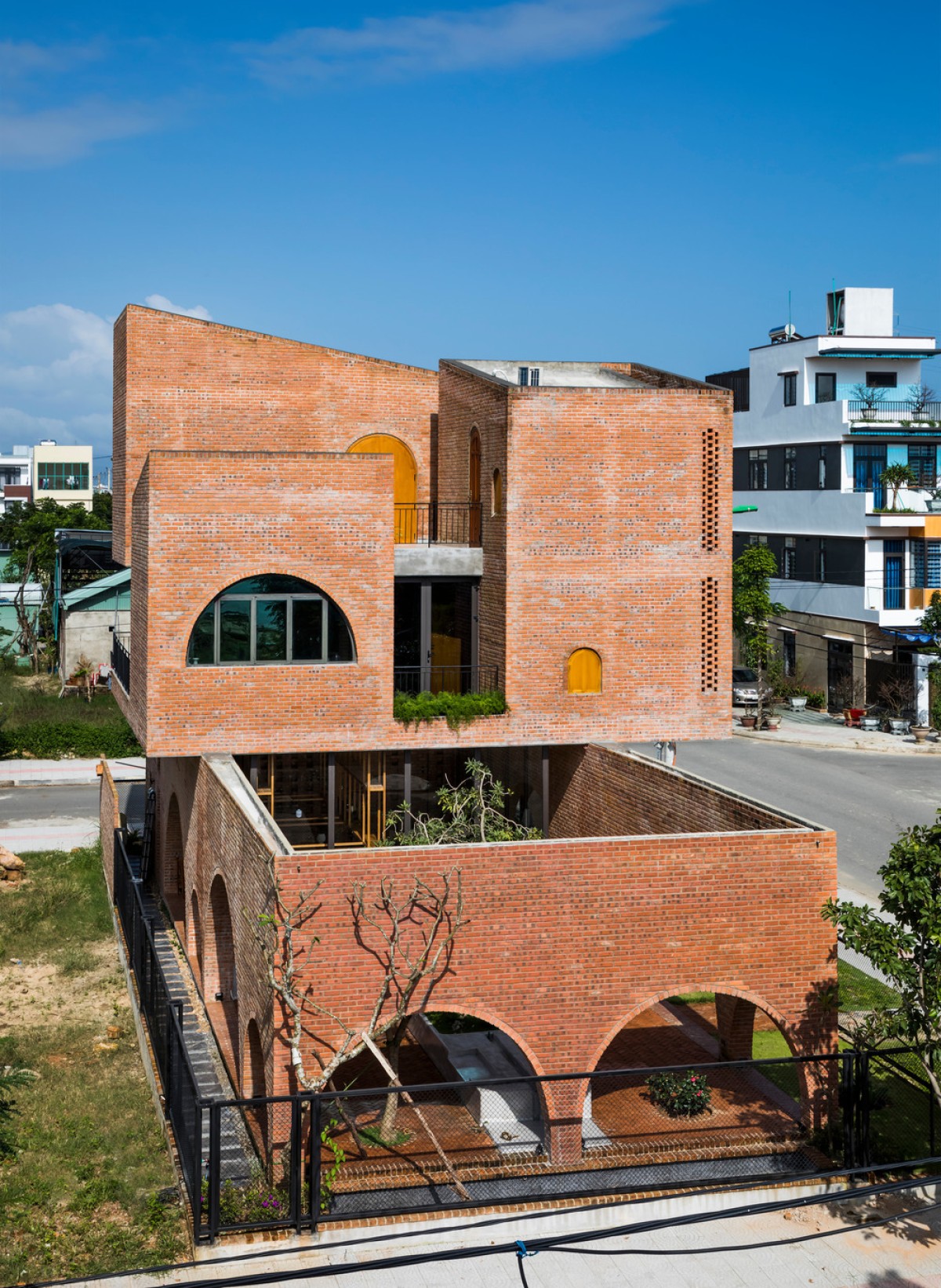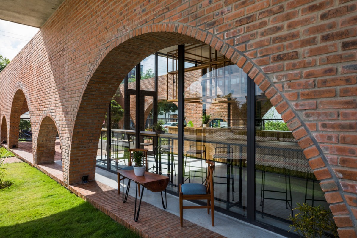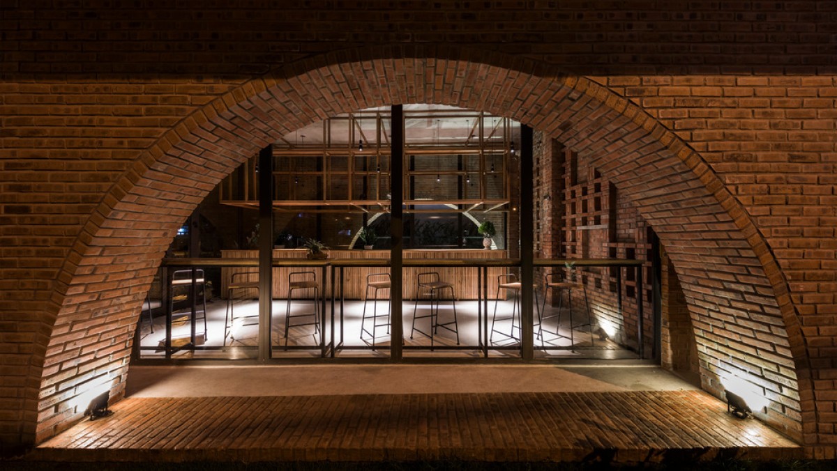 Located in an urban renewal zone by a river in Da Nang, Vietnam, this residential construction uses the ground floor as a small cafe formed by rectangular brick walls, while the upper floor serves as the living space of a nuclear family, which is combined by three different blocks on a square plane.
