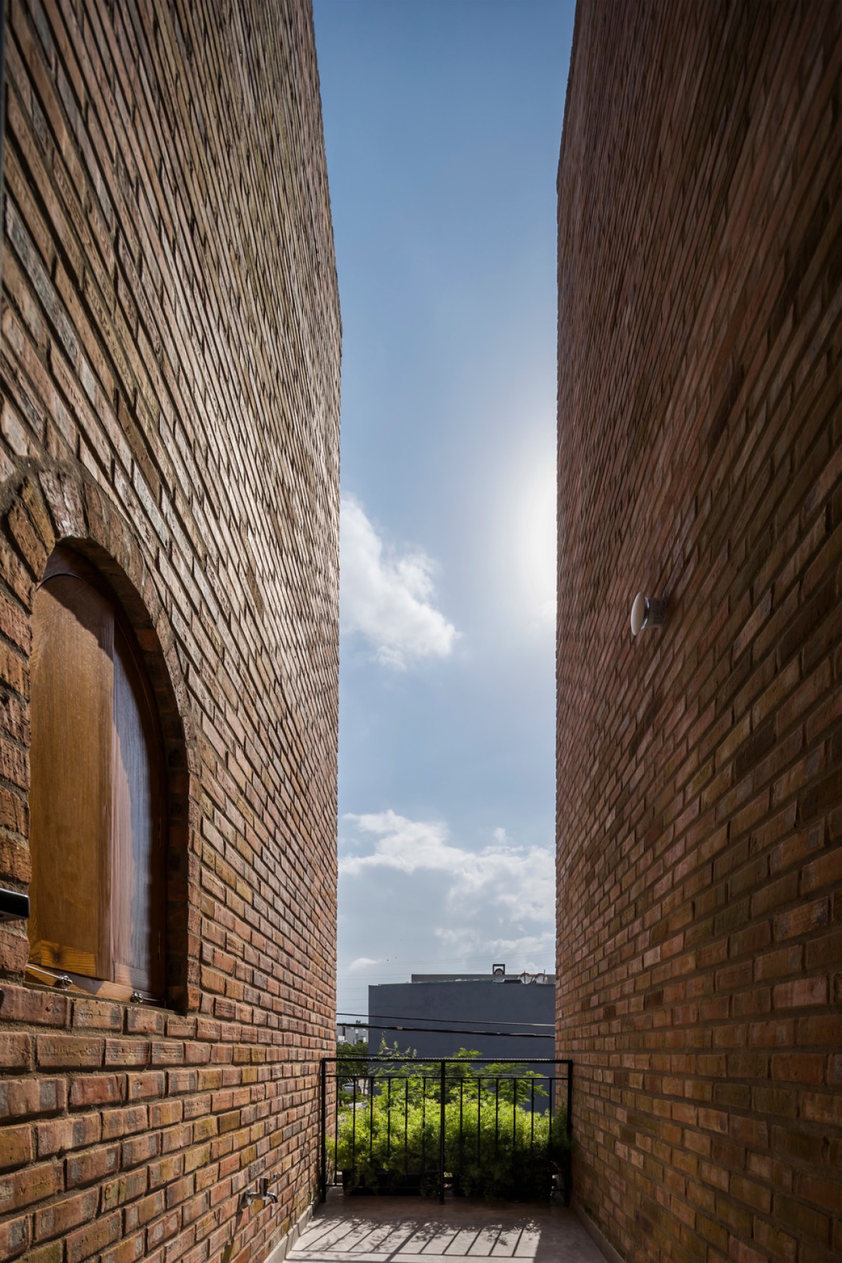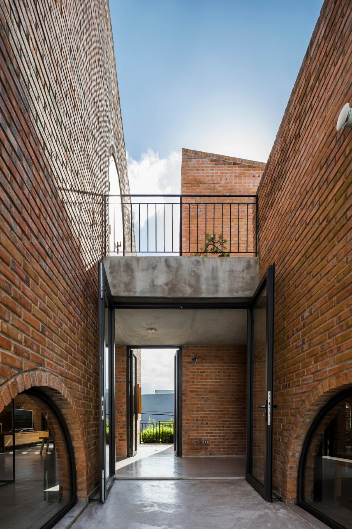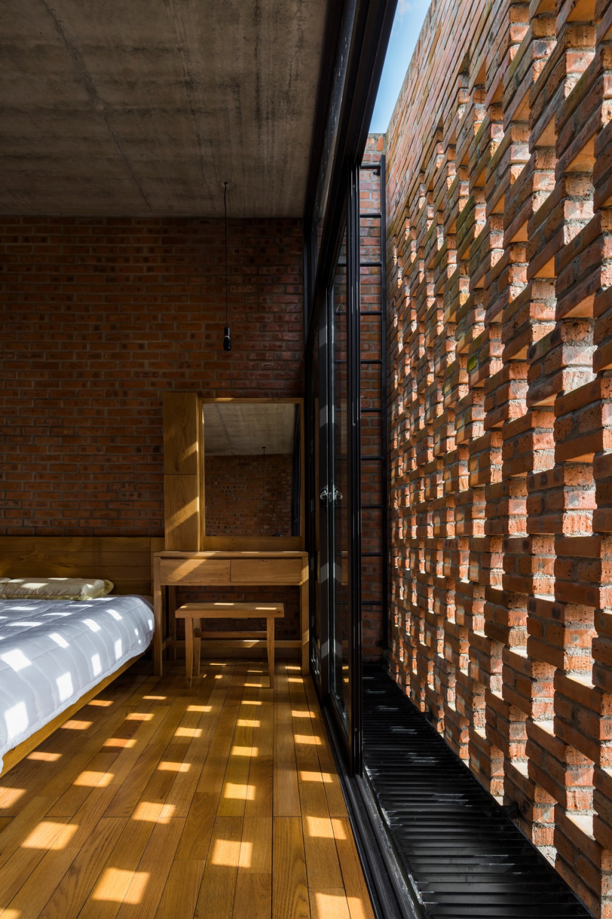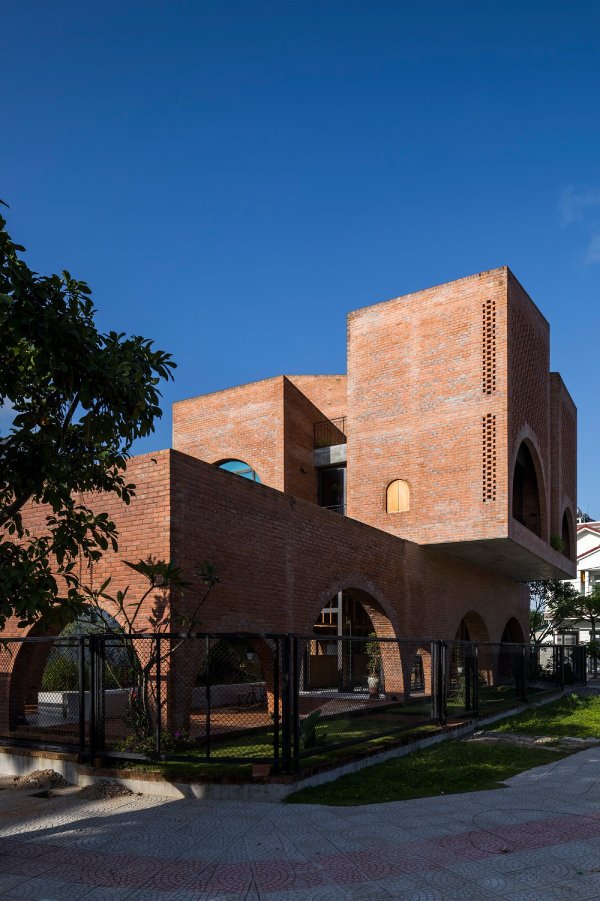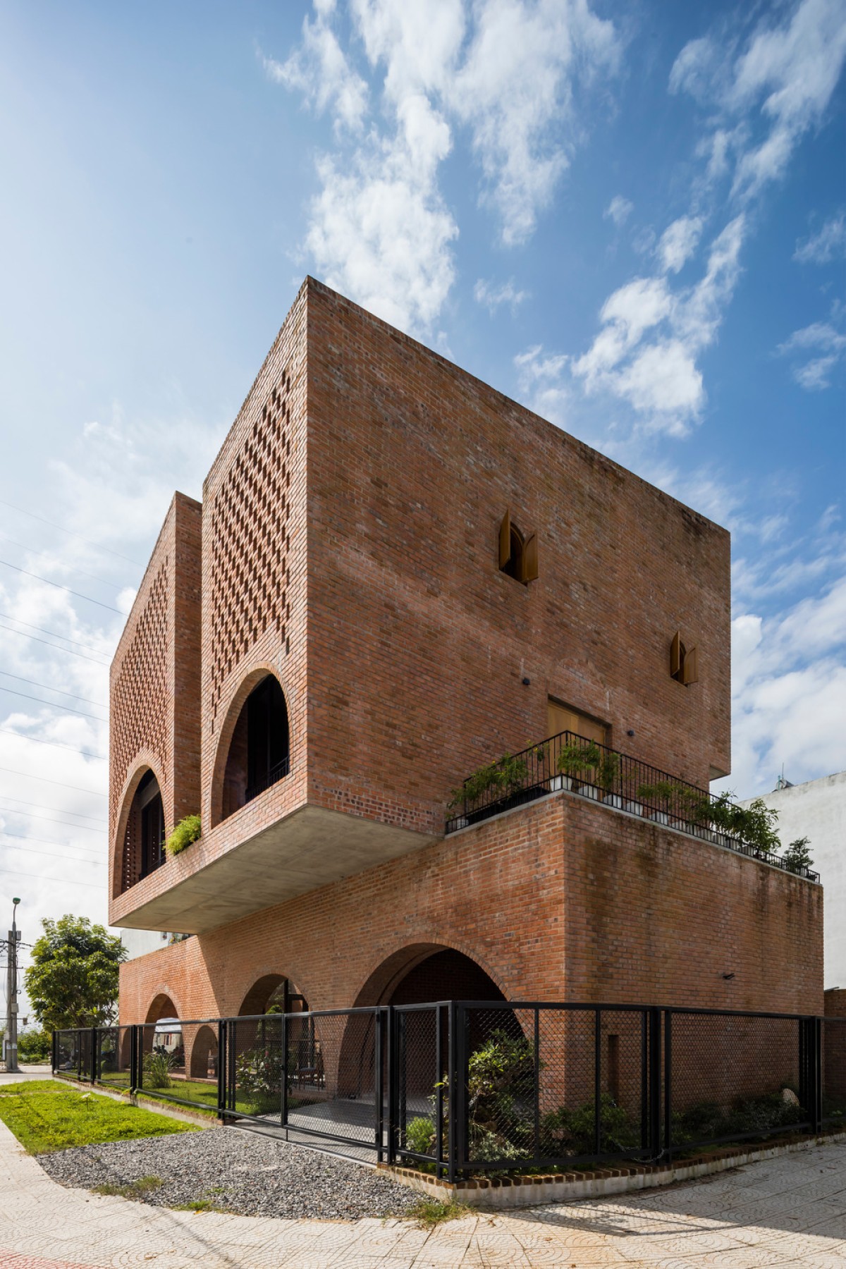 Located in an urban renewal zone by a river in Da Nang, Vietnam, this residential construction uses the ground floor as a small cafe formed by rectangular brick walls, while the upper floor serves as the living space of a nuclear family, which is combined by three different blocks on a square plane.