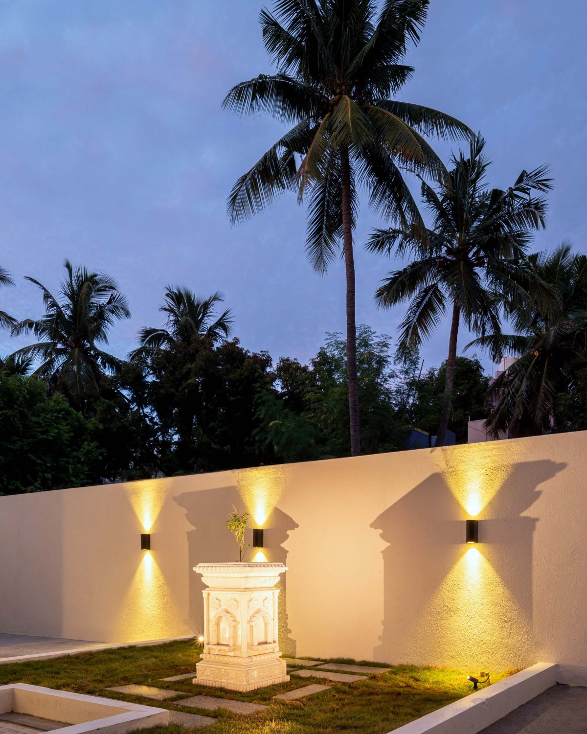 Dusk light exterior view of Deepa Residence by Grid Studio