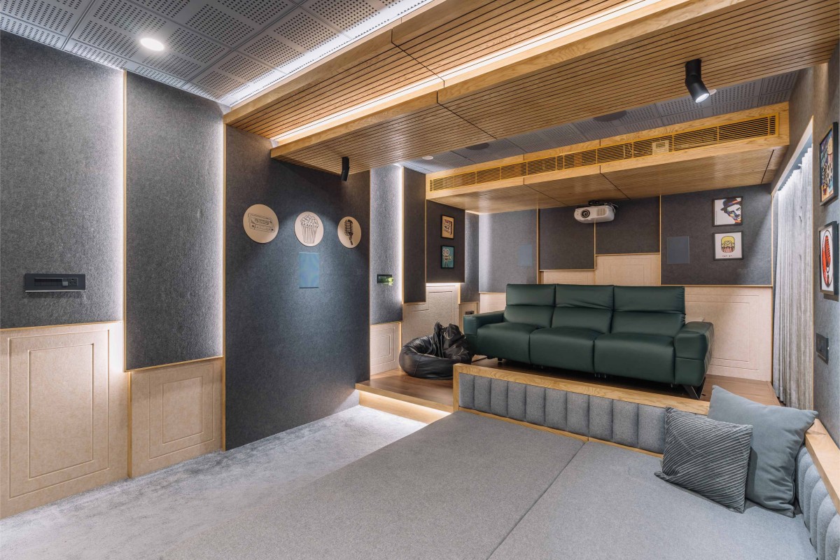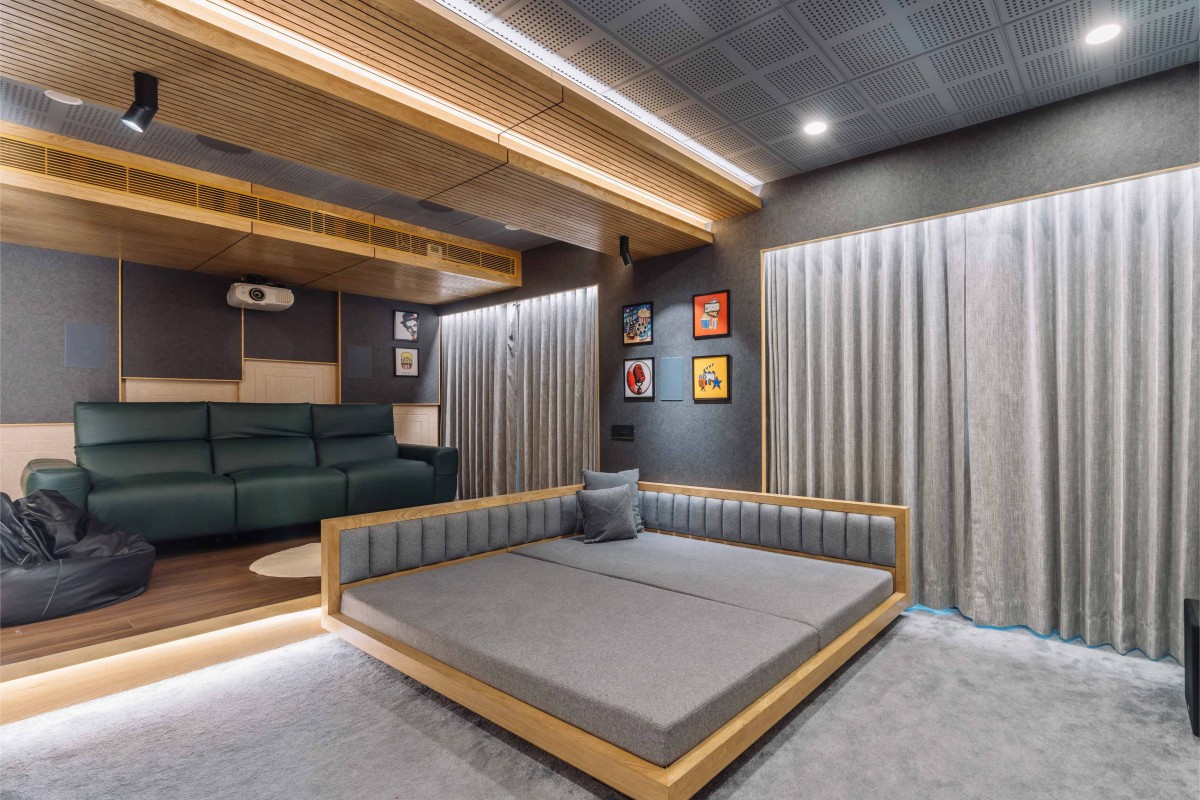 The design embodies a distinct blend of styles. The room features a predominantly dark and moody color scheme with charcoal gray walls and a contrasting ceiling with hues of brown wooden strips. A plush green sofa and low-lying bed with a cozy pouf add comfort to the space. Mixed recessed spotlights and ambient light create an intimate atmosphere, enhancing the wooden textures and fabric. The gray walls are adorned with framed artwork, adding a personal touch and warmth to the space. The lighting being strategically placed creates an overwhelming space by highlighting room furniture. The combination of warm tones and soft lighting creates an immersive experience in the home theater.