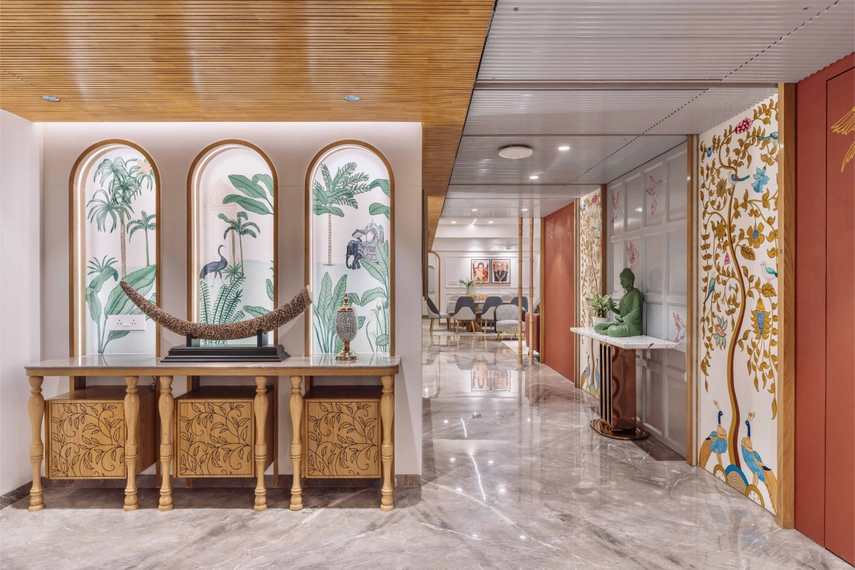 The entry area is imbued with a tranquil and sophisticated atmosphere, achieved through a neutral color scheme featuring shades of beige, brown, and white. The sense of calm and peace begins in the foyer, where visitors are welcomed by arched doorways and hand-painted artwork adorning the walls. To enhance the space, vibrant accents in red and green are incorporated into the wall design. The walls exude a hospitable charm, embellished with exquisite murals that celebrate nature, birds, and trees, fostering a connection to the traditions and rich heritage of India. To provide warmth and texture, natural materials such as marble and wood are utilized, complemented by soft, diffused lighting in the entry foyer. Decorative elements instill to a narrative of history and culture within the space.