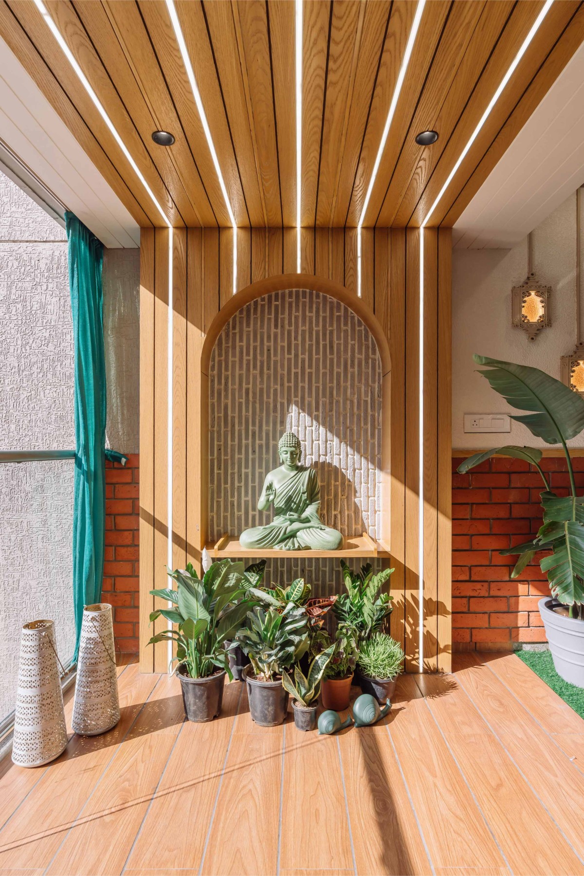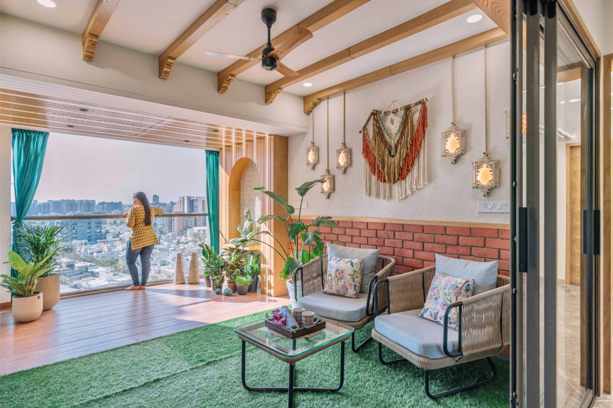 The space is crafted with a Bohemian flair, incorporating a brick wall, draped tapestries, and inviting seating arrangements, complemented by a modest garden featuring artificial grass. The corridor linking the balcony to the primary living space is embellished with wooden details and soft lighting, fostering a warm ambiance. The residence exemplifies a modern Indian style, harmoniously merging contemporary design features with traditional Indian aesthetics.