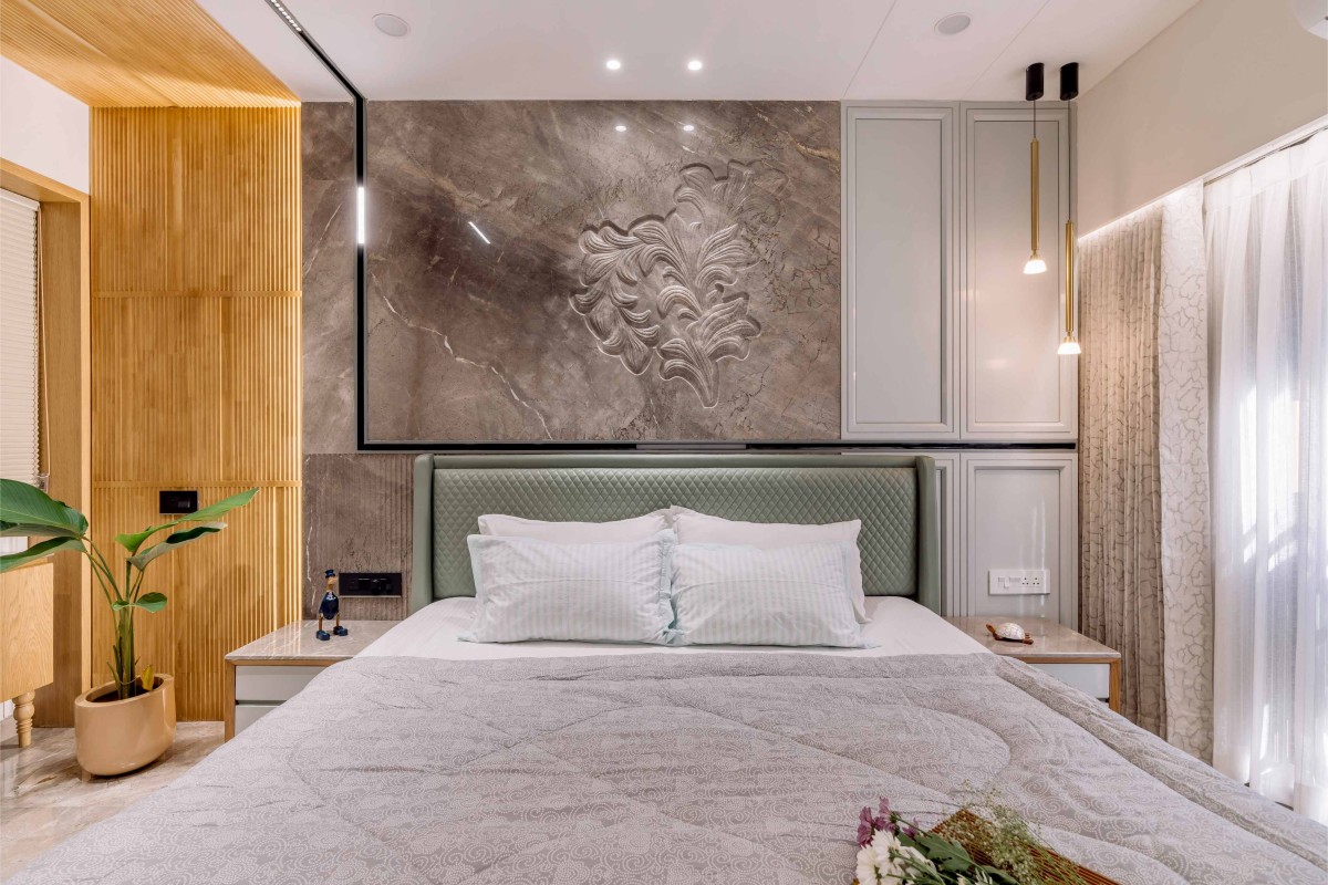 The bedroom is enhanced by a wooden panel that is thoughtfully designed for optimal functionality. The olive green bed, featuring custom-crafted intricate legs, is positioned against a marble wall, establishing a serene sanctuary. To add a touch of comfort, a blue sofa is situated near the TV unit, forming a welcoming and relaxing nook. The headboard, along with the bed's details and bedside tables, incorporates vertical grooves that foster a unified sense of spaciousness. A recessed wall and a storage console adjacent to the bed further enhance the room's practicality. The soft illumination from the lighting, combined with track lighting and a wooden ceiling, creates a seamless transition from the walls to the ceiling. Subtle grays and decorative elements complete the bedroom's aesthetic, enriching its overall appeal.