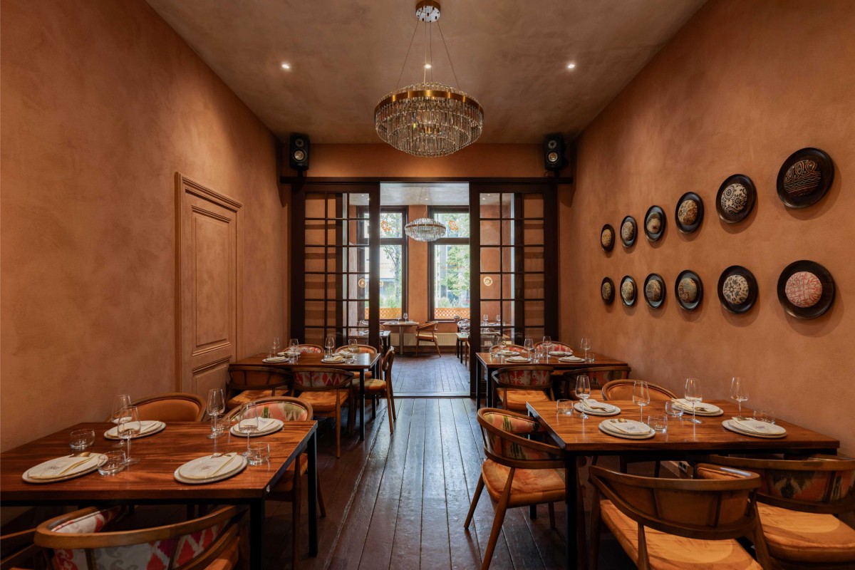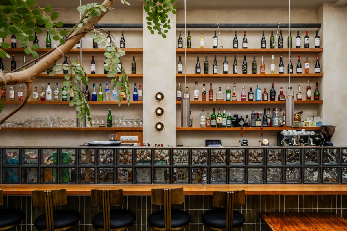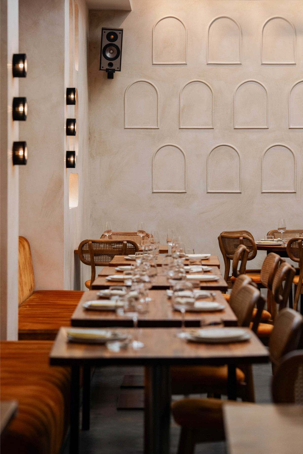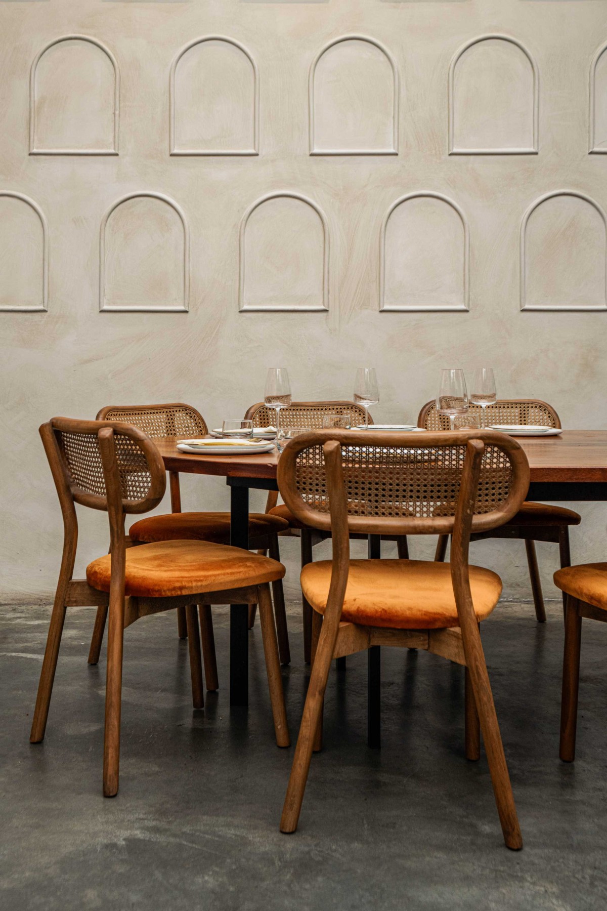 The interior bridges nostalgia and modern design sensibilities. Elegant chandeliers inspired by classic Indian glamour coexist with sleek, contemporary furniture in natural wood and cane. Upholstered seats in warm rust and ochre tones invite comfort, while polished concrete flooring adds a quiet, urban edge. Together, these elements create a layered aesthetic — refined yet rooted, sophisticated yet deeply human.