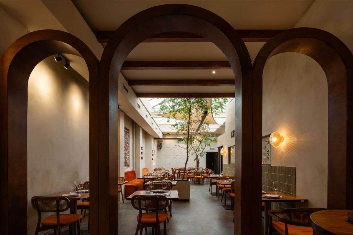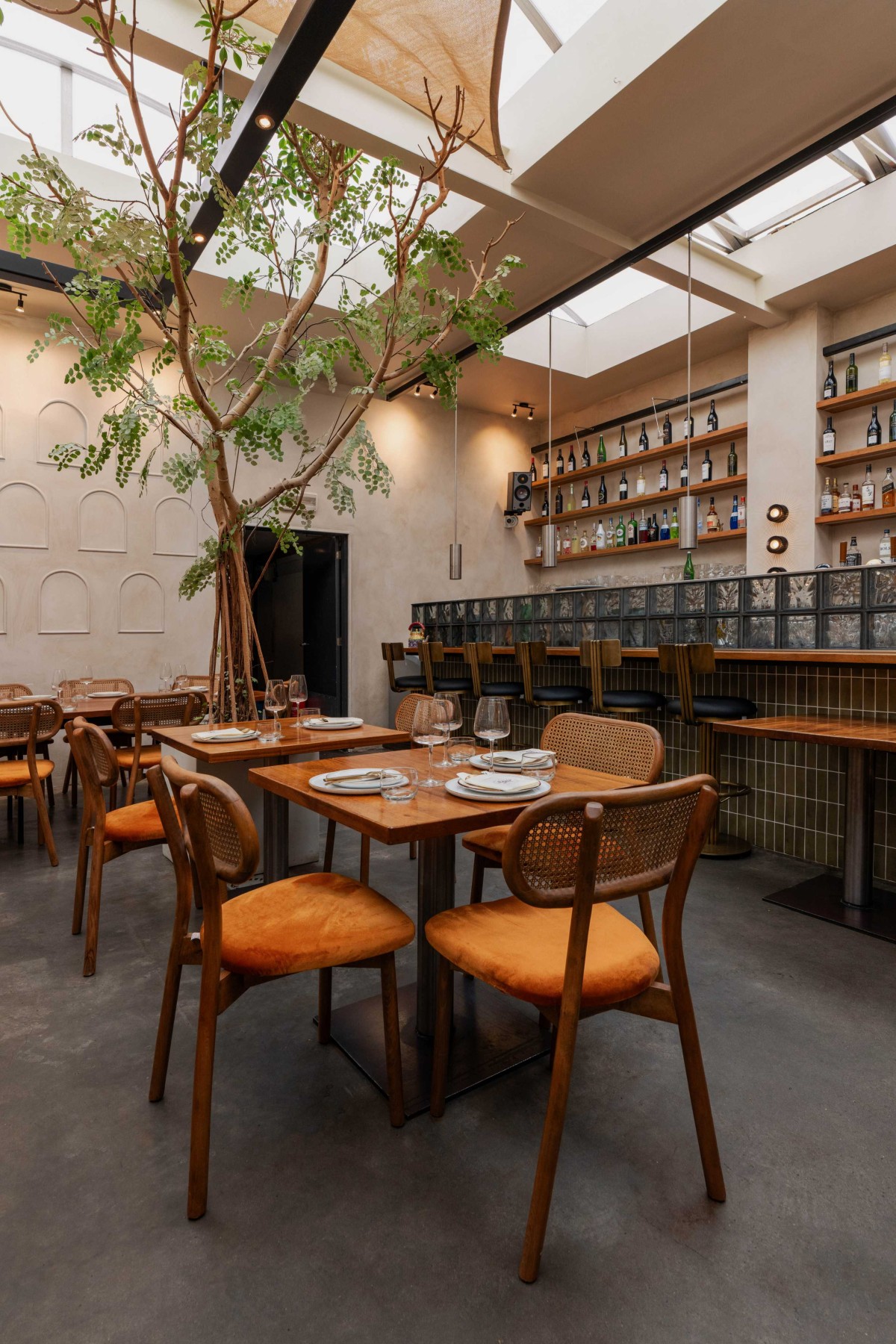 At the heart of the restaurant lies a skylit courtyard — an open, meditative space where a slender tree rises gracefully towards the light. The dappled sunlight streaming through fabric canopies evokes the gentle warmth of an Indian afternoon, transforming the act of dining into a sensory experience. For Studio Knest, this element became the soul of the design — a modern-day reinterpretation of the Indian courtyard, where nature and community seamlessly coexist.