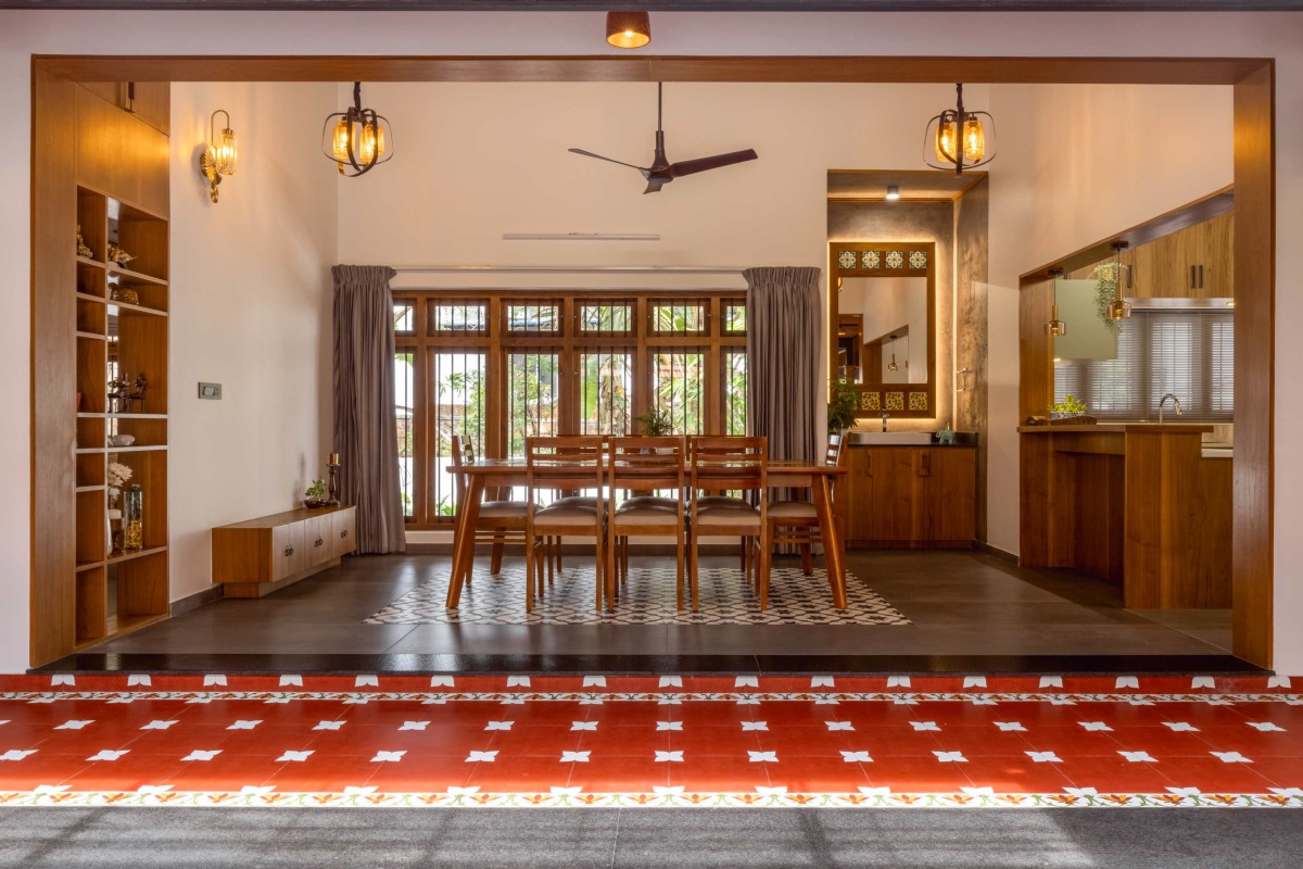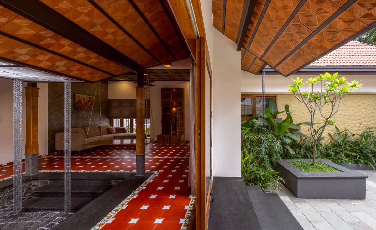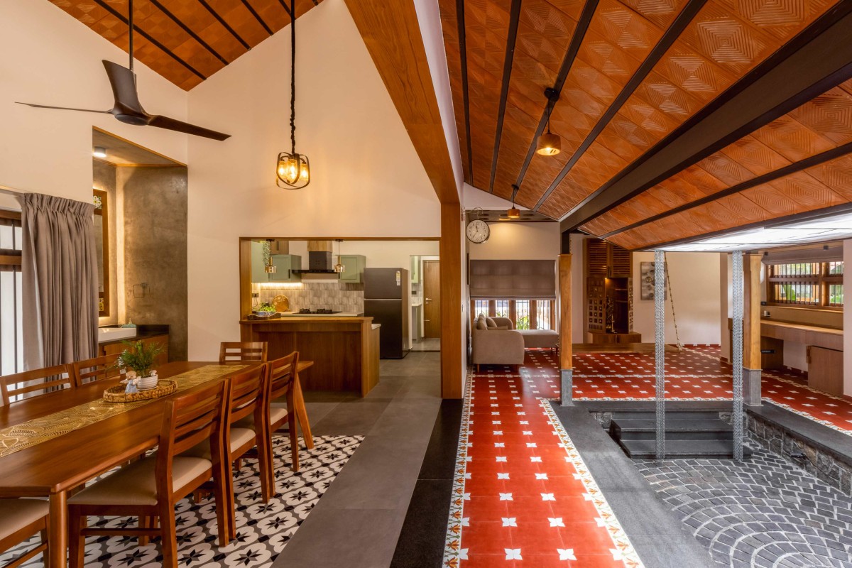 Large openings and cross-ventilation strategies ensure the house remains airy and cool throughout the year—a nod to Kerala’s humid climate. Filtered natural light gently illuminates the interiors, creating a bright and comfortable atmosphere without relying heavily on artificial sources.