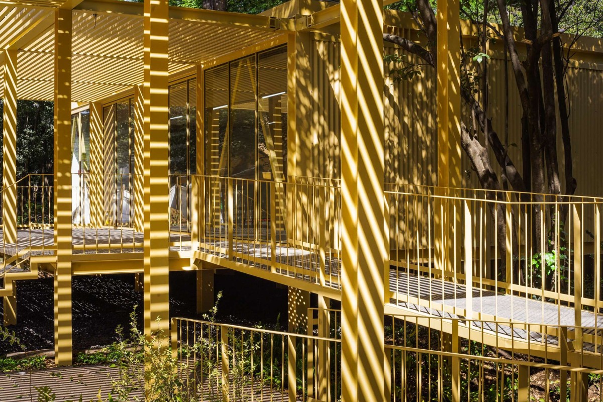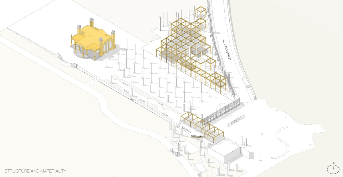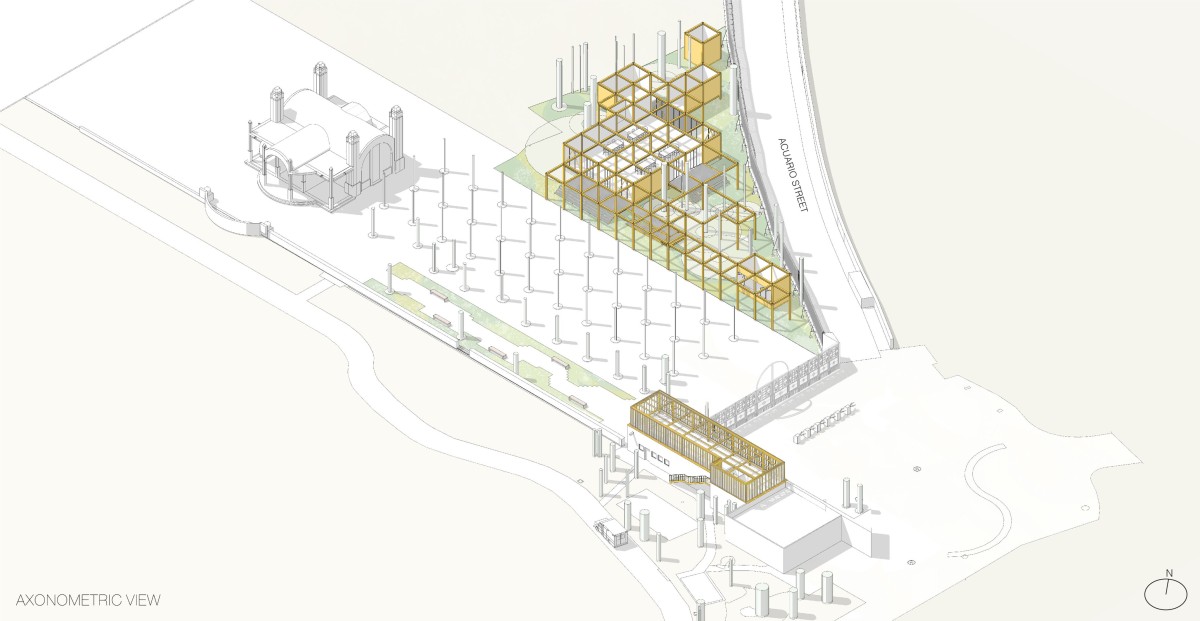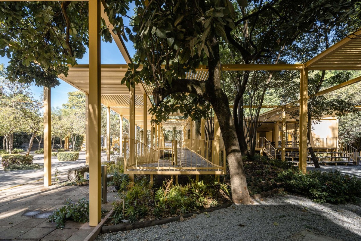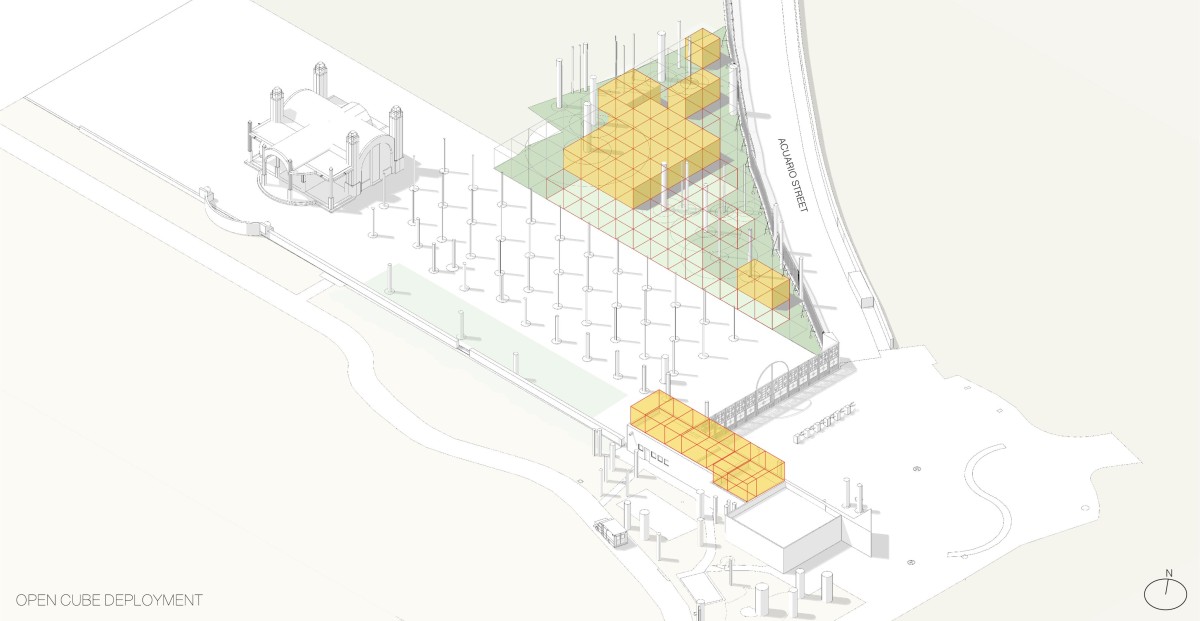 The architectural interventions are located at the entrance of the Chapultepec Zoo: at the north section the floating pavilion and at south, the expansion, complementing one another. Two main site conditions played an important role within the design intentions and strategies for the pavilion: the site presented an important number of trees to preserve, among them, one of the oldest ash trees within the zoo, and the site had to preserve its potential of introducing water to the underground. Based on that the project proposes open modular cubes to be used as building blocks, just as the artwork by Sol LeWitt. The open cubes are deployed naturally along the site extension aiming at defining and blurring the limits of the structure in its dialogue with its surroundings. 56 modules are grouped to accommodate walkways, corridors, stairs, ramps, an open amphitheater, a multipurpose space, a front desk and reception area, restrooms, machine room, among others. The main program components are elevated 90 centimeters from the ground level to ensure minimum building contact ensuring soil permeability.