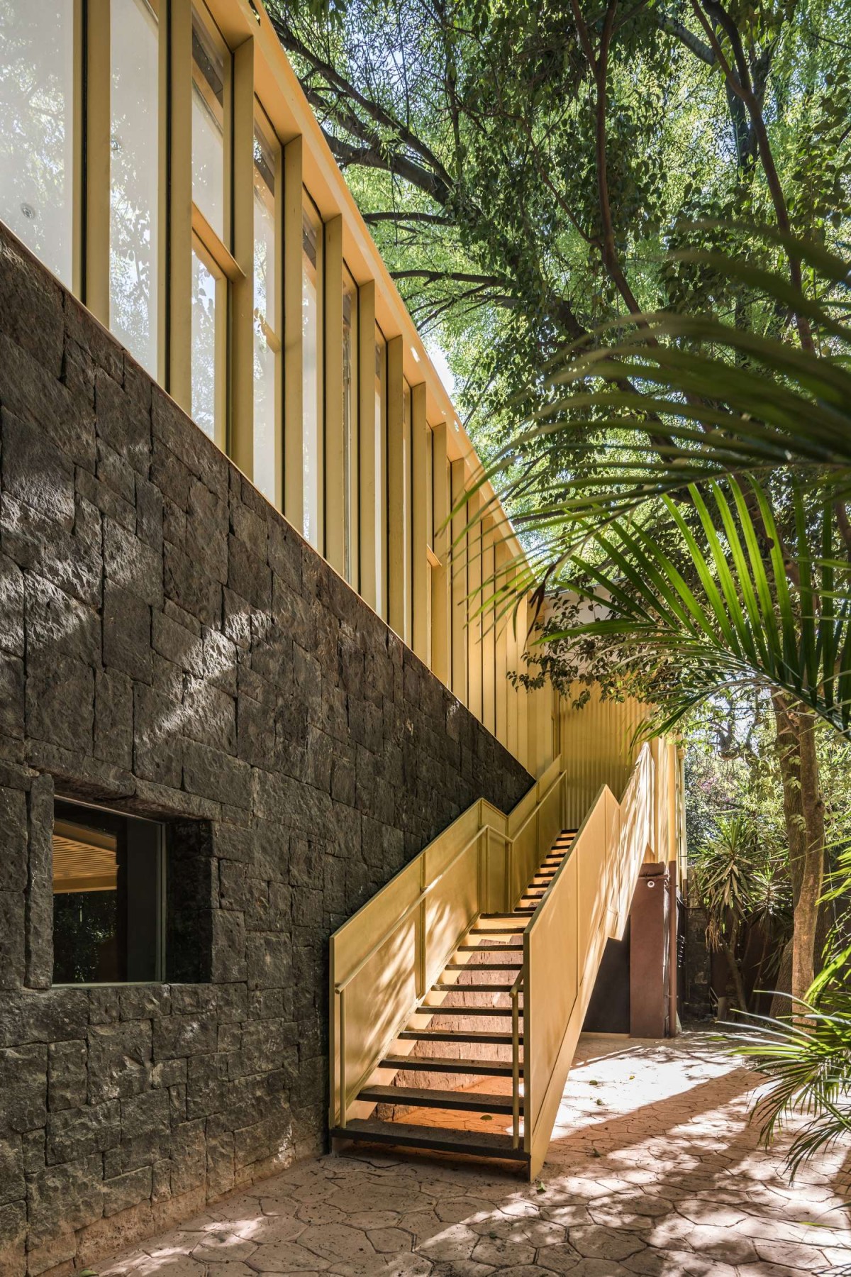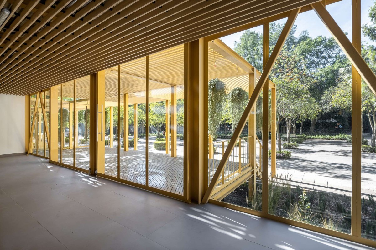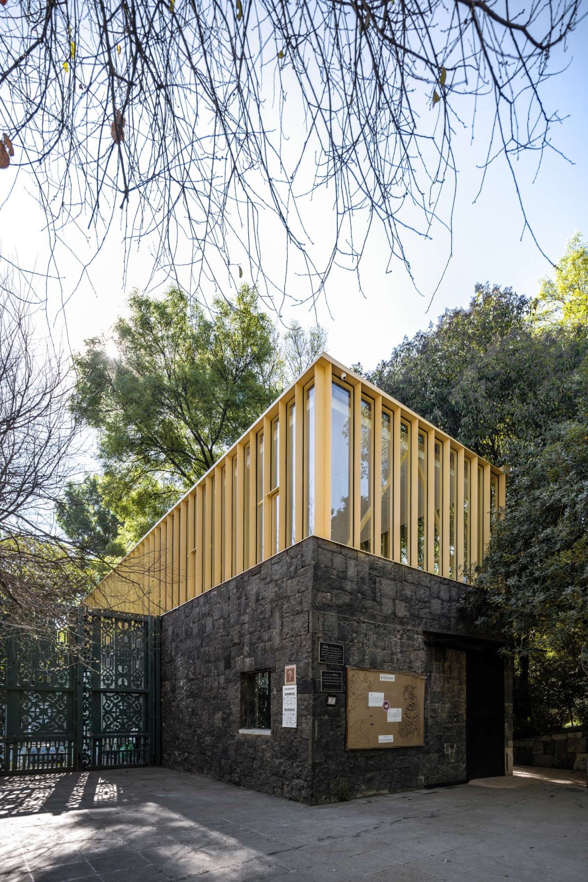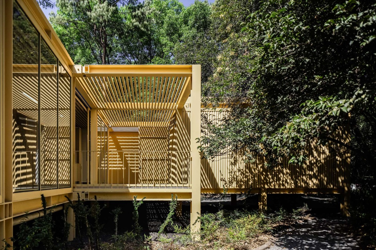 The expansion takes place on top of an historic stone building, modernizing the existing structure and adding a light structure on top of it. Both, the floating pavilion, and the expansion share the spirit of a yellow-steel structure, color that was taken from a heritage building located in between the two.