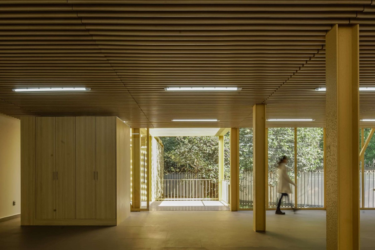 Light and shadow act as material components to articulate the space, wrapping the geometry and connecting exterior with interior, this effect is achieved through different ways to approach the modular cube: solid, translucent, empty, and striped.