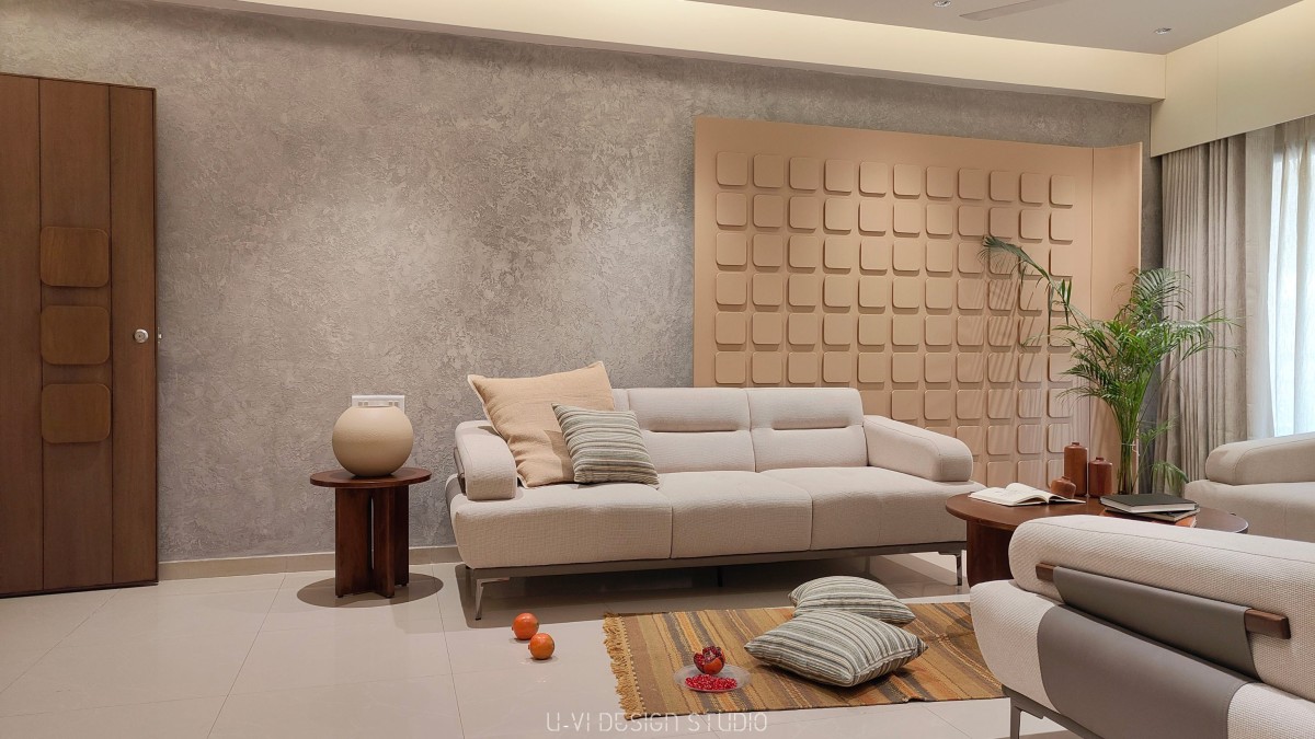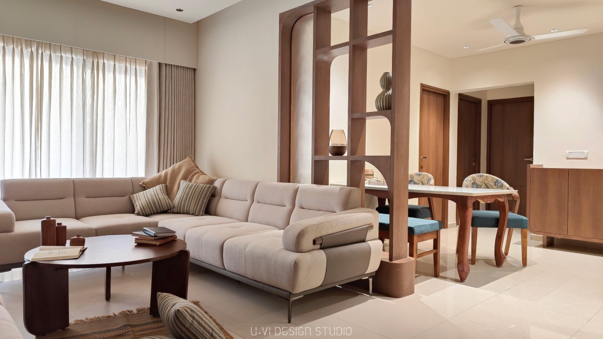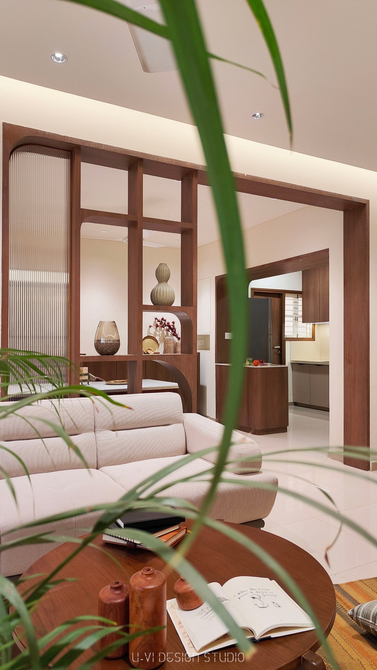A striking wooden partition with open shelving acts as a clever room divider between the living and dining areas This element is both functional, offering display space, and aesthetically pleasing, maintaining an open feel while delineating zones. Wooden coffee tables with interesting shapes contribute to the organic feel. Potted plants are strategically placed, bringing a touch of nature indoors.