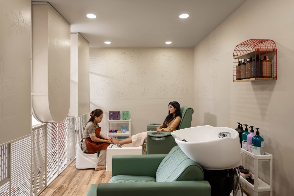 Materiality anchors the design narrative. The use of textured paint, designer tiles, and terrazzo not only adds visual richness but also ensures durability suited to the salon’s daily functions. Subtle design gestures — from integrated mirrors and furniture detailing to the curated display niches — express craftsmanship within constraint.