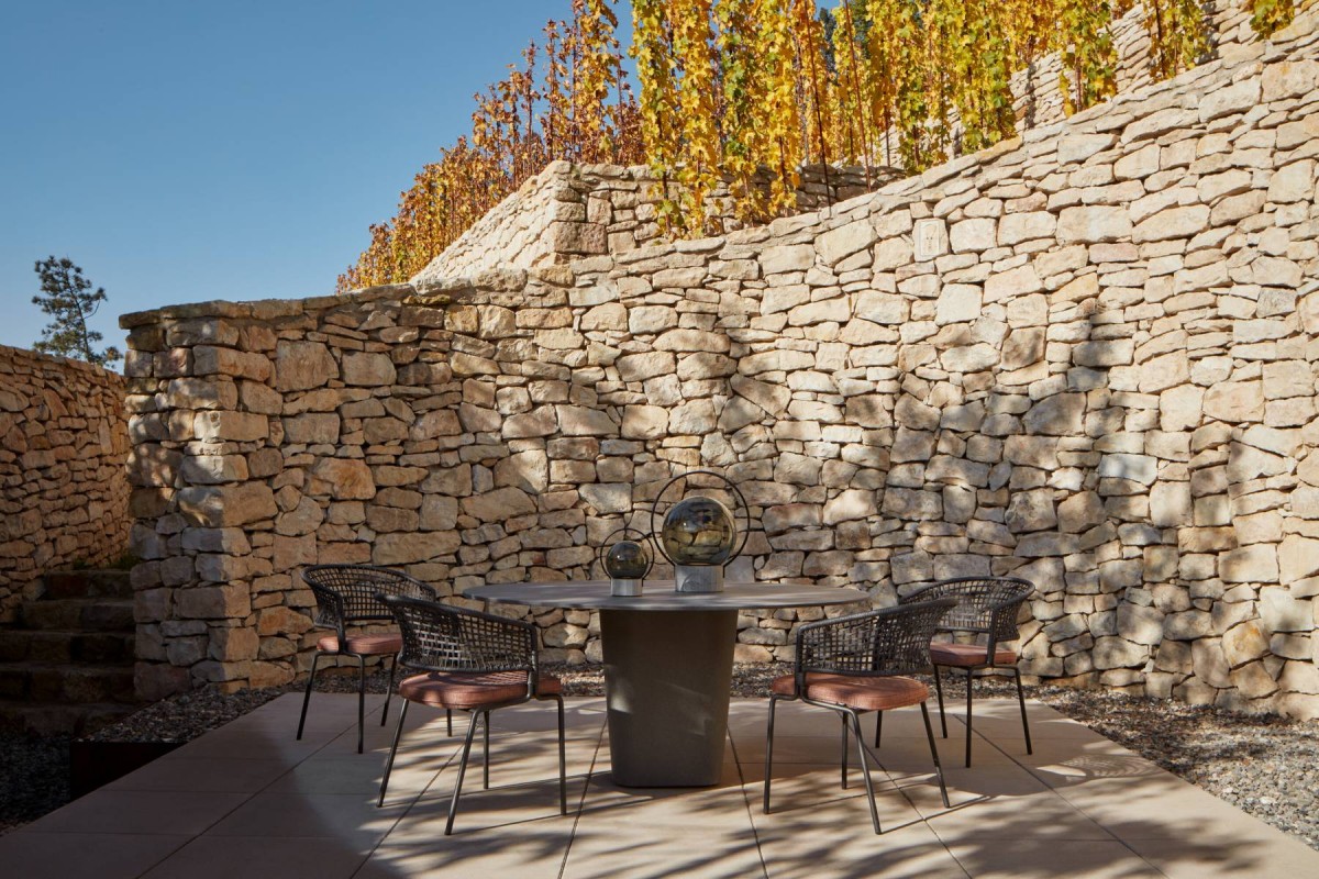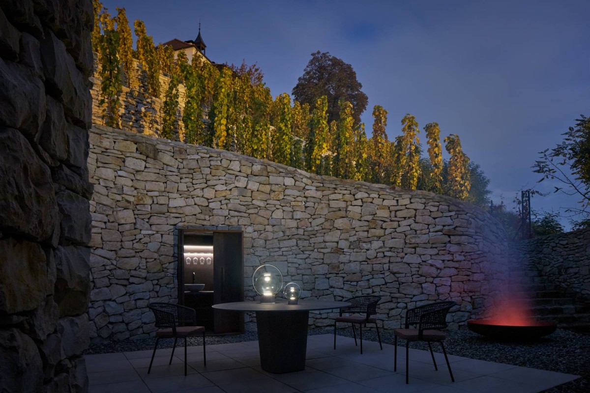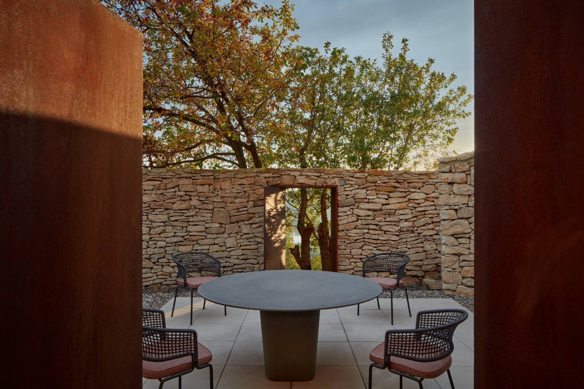 The Fibonacci patio is surrounded by indirect lighting facing the new stone walls, additionally has a split in two different functional levels, the lower one intended for necessary connections and the higher one as the wine tasting area centralised by a rounded table, which serves as the main space of gathering and socialisation.