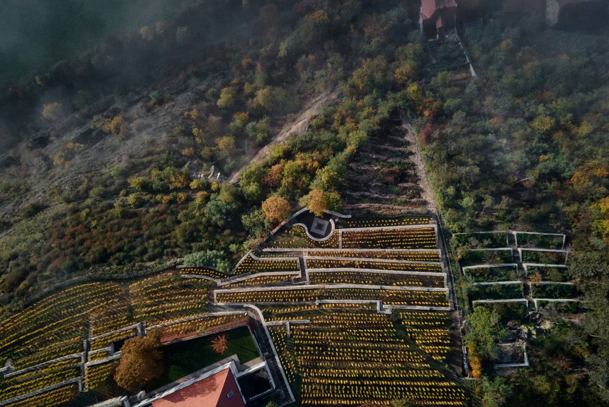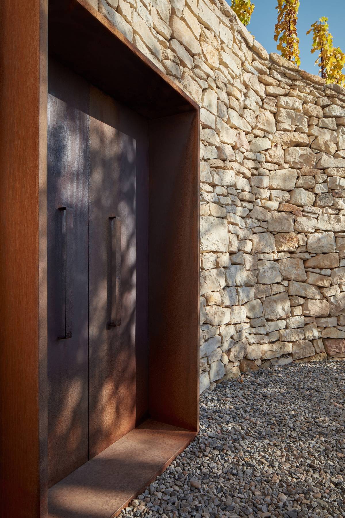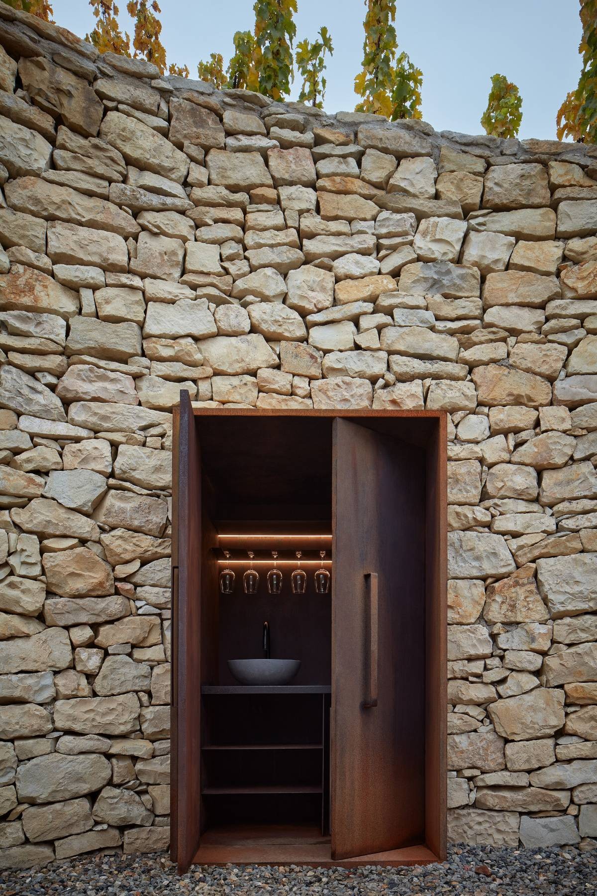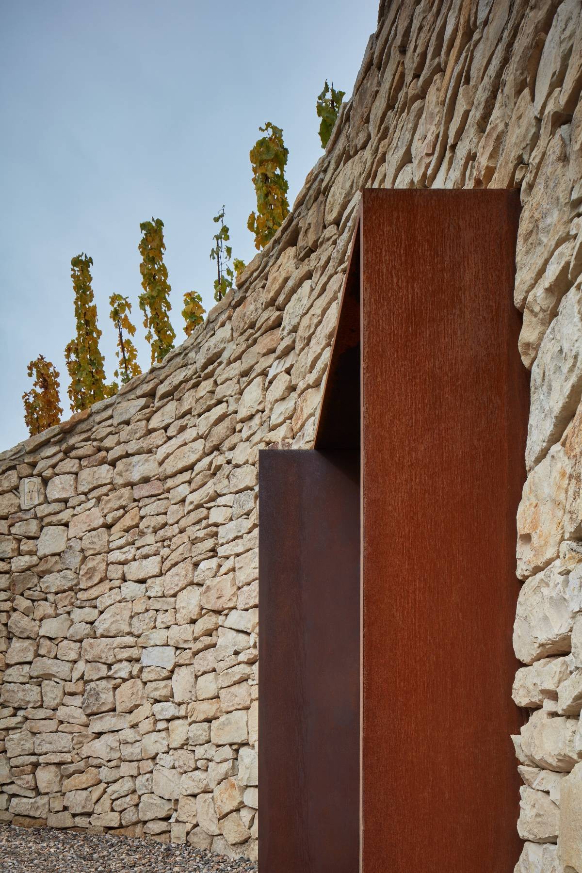 The overall intervention was driven by discovering and preserving the existing elements found on site. By framing one of them - an old oak tree with a door, a dominant feature of symbolism was established. While the doors are closed, his attention stays focused on the vineyards without the preeminent view to the city. On the other hand by opening the window, the relation with the city is established, and induces the future expansion of the vineyard. By mirroring the door feature on its axis, another corten door was created. The latter niche serves as a small wine cellar, opening for storing and serving the wine.