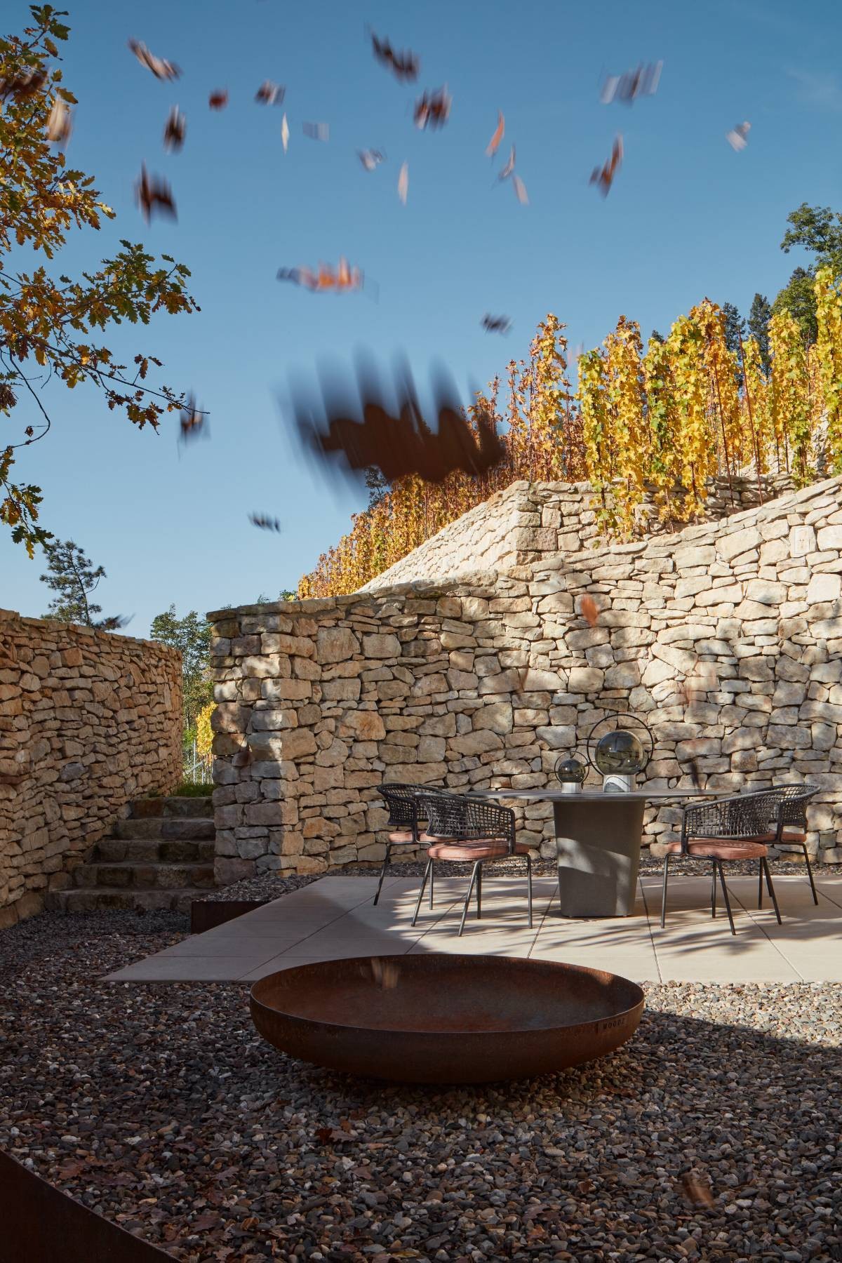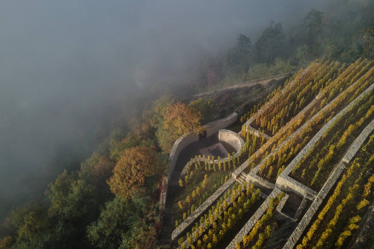 Forgotten in the terraced vineyard, a stone ruin with a curved space was discovered. Since the ruin was subtly integrated with the landscape, it became the basis of the intervention. The genius loci suggested the Fibonacci Spiral movement which was perfectly aligned with the existing ruin. By enhancing the walls of the spiral, a unique oasis of silence was outlined, as an answer to the problems of the noise pollution. A simple space, closed from the city, creates an ambiance which directs its users' focus back to the château and the slope of the vineyards rows.