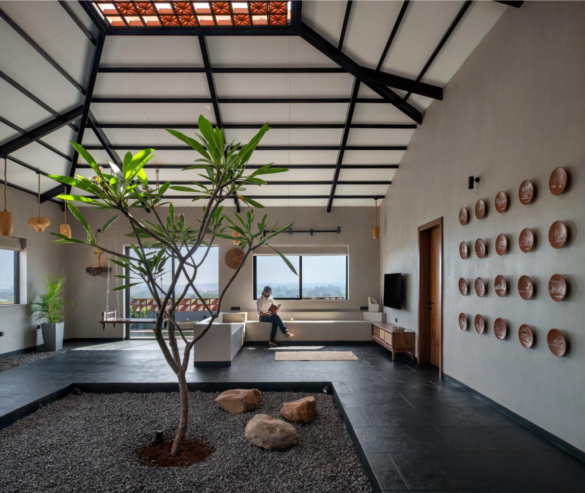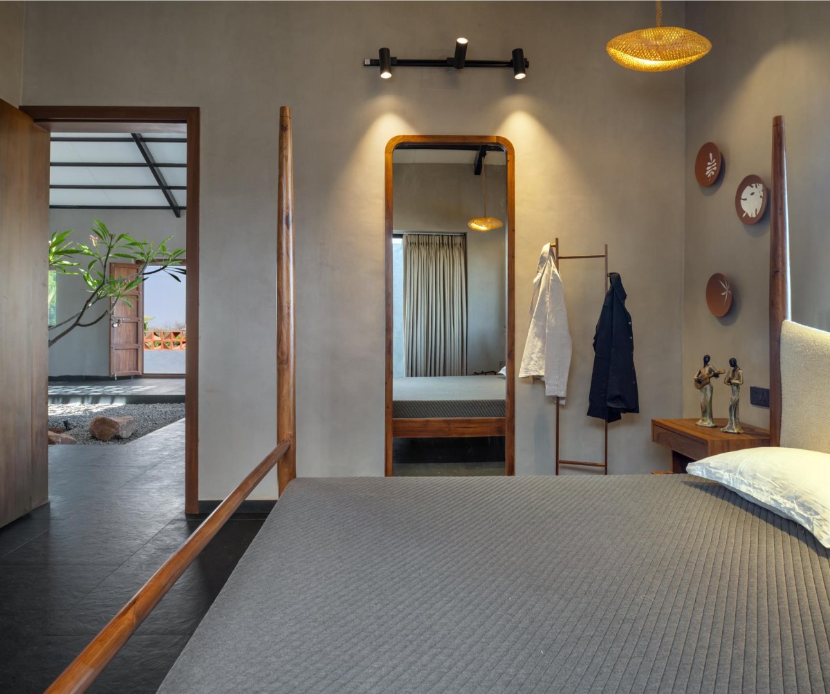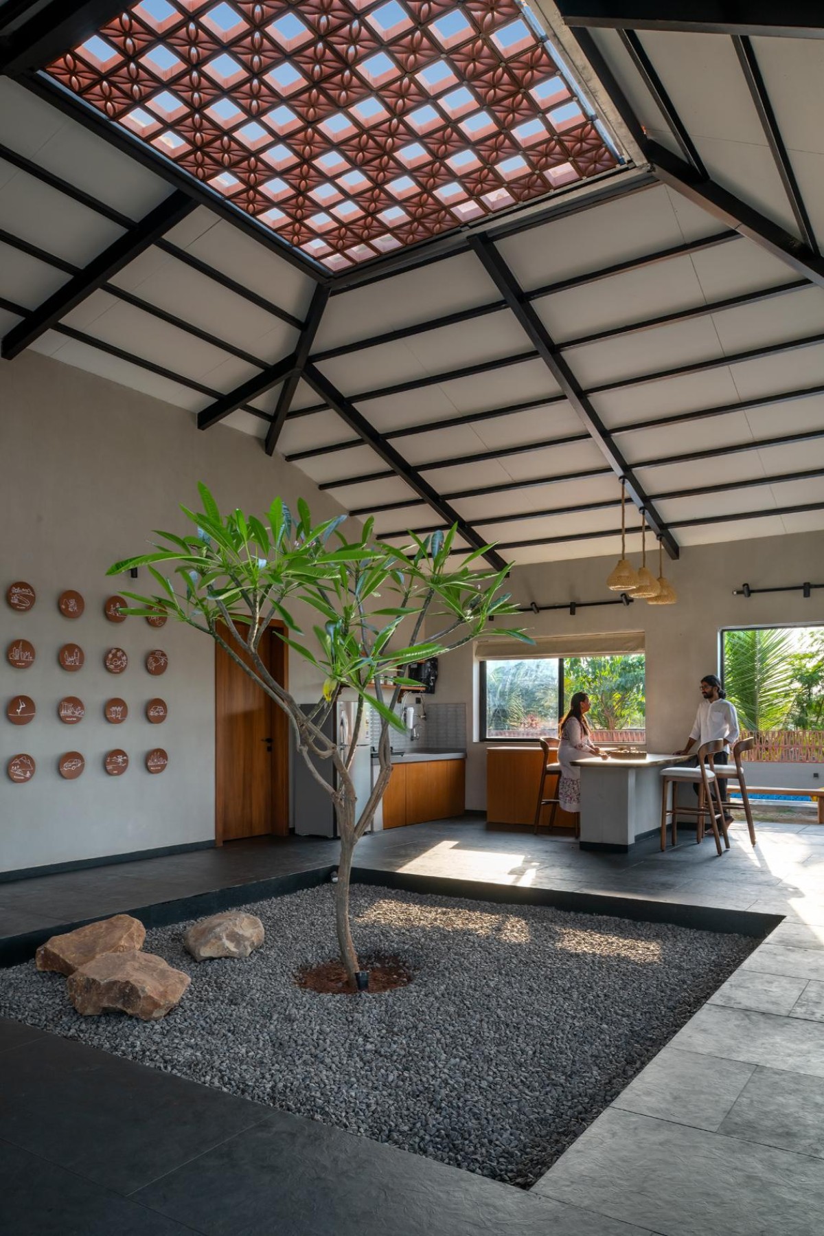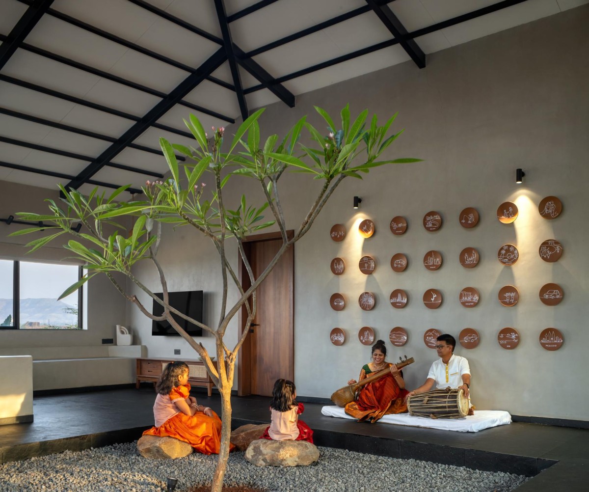 The entrance is marked by a grotto, creating a spiritual threshold that imparts positive energy to the home. Sustainability is central to the material palette: red bricks, Mangalore tiles, and an abundance of greenery both inside and out.