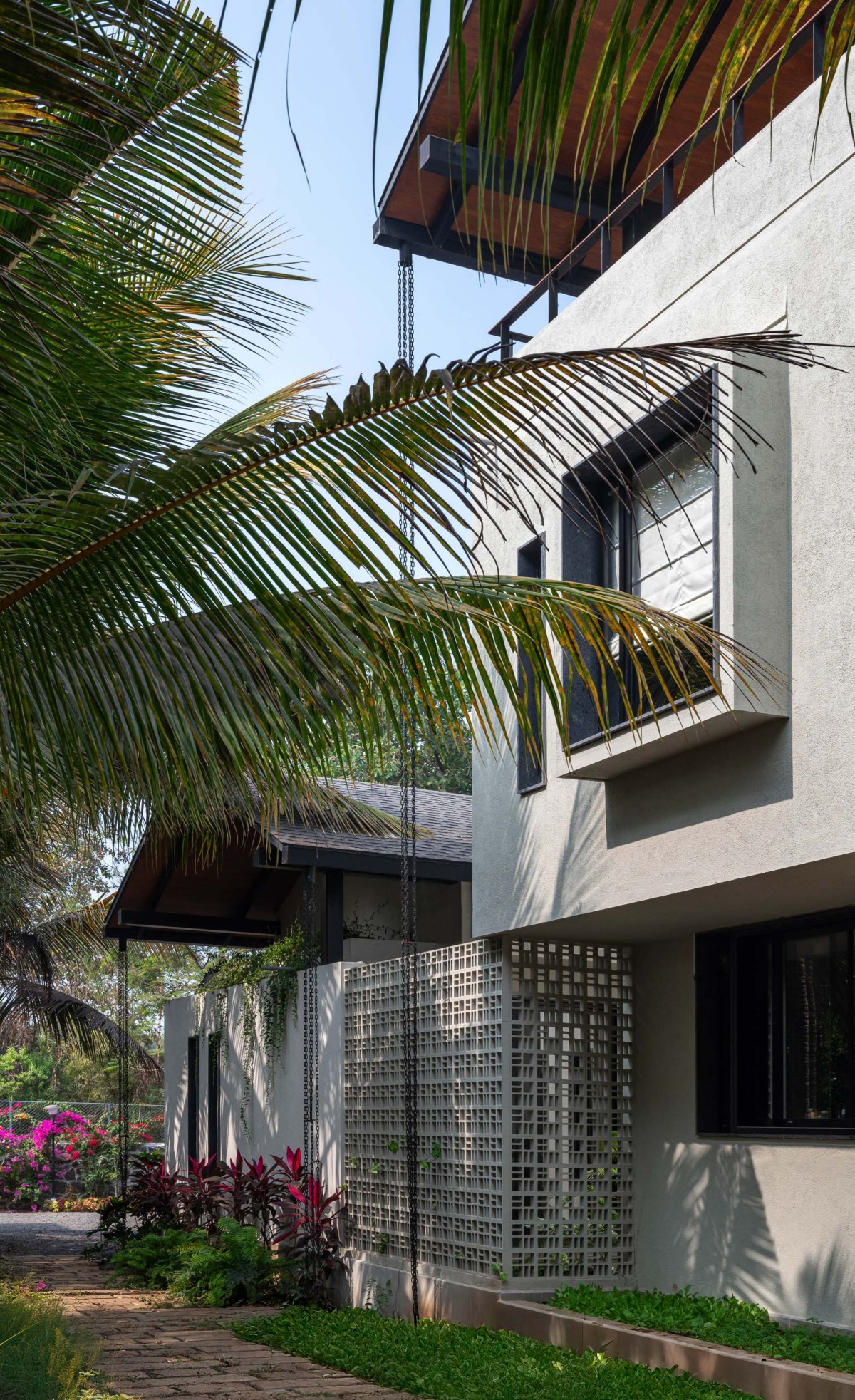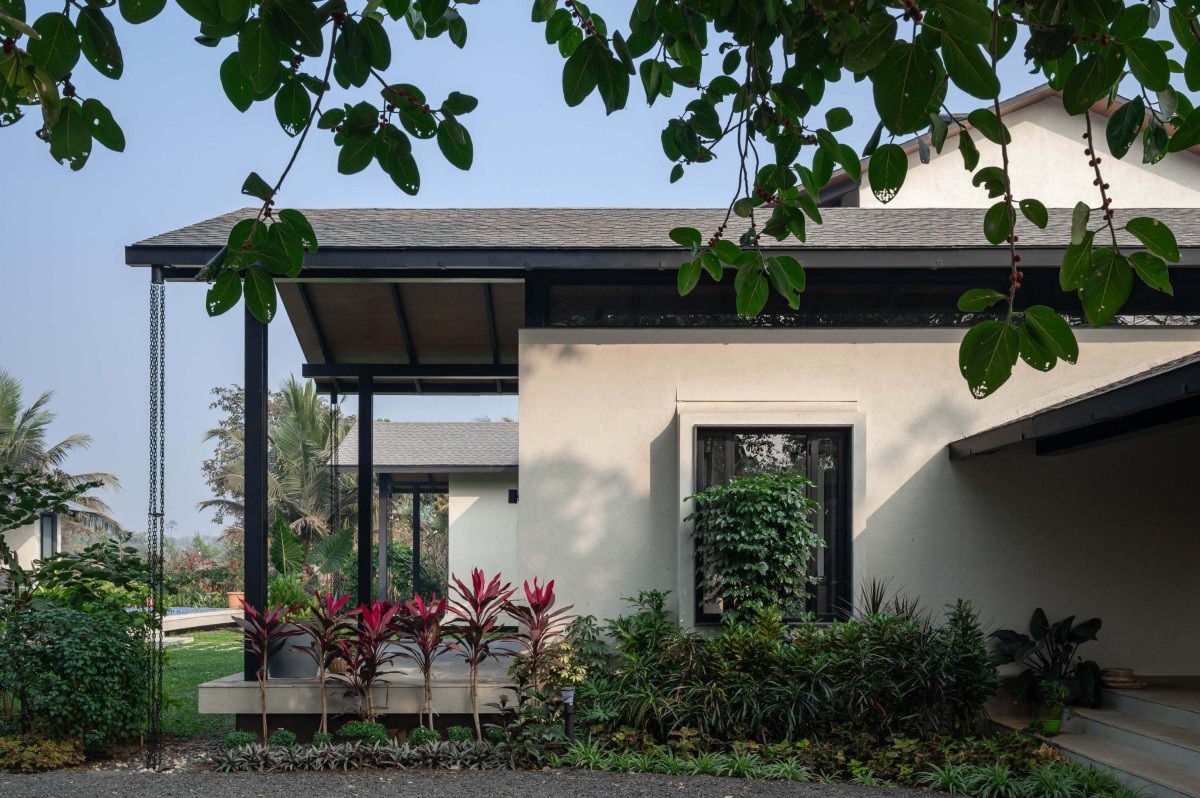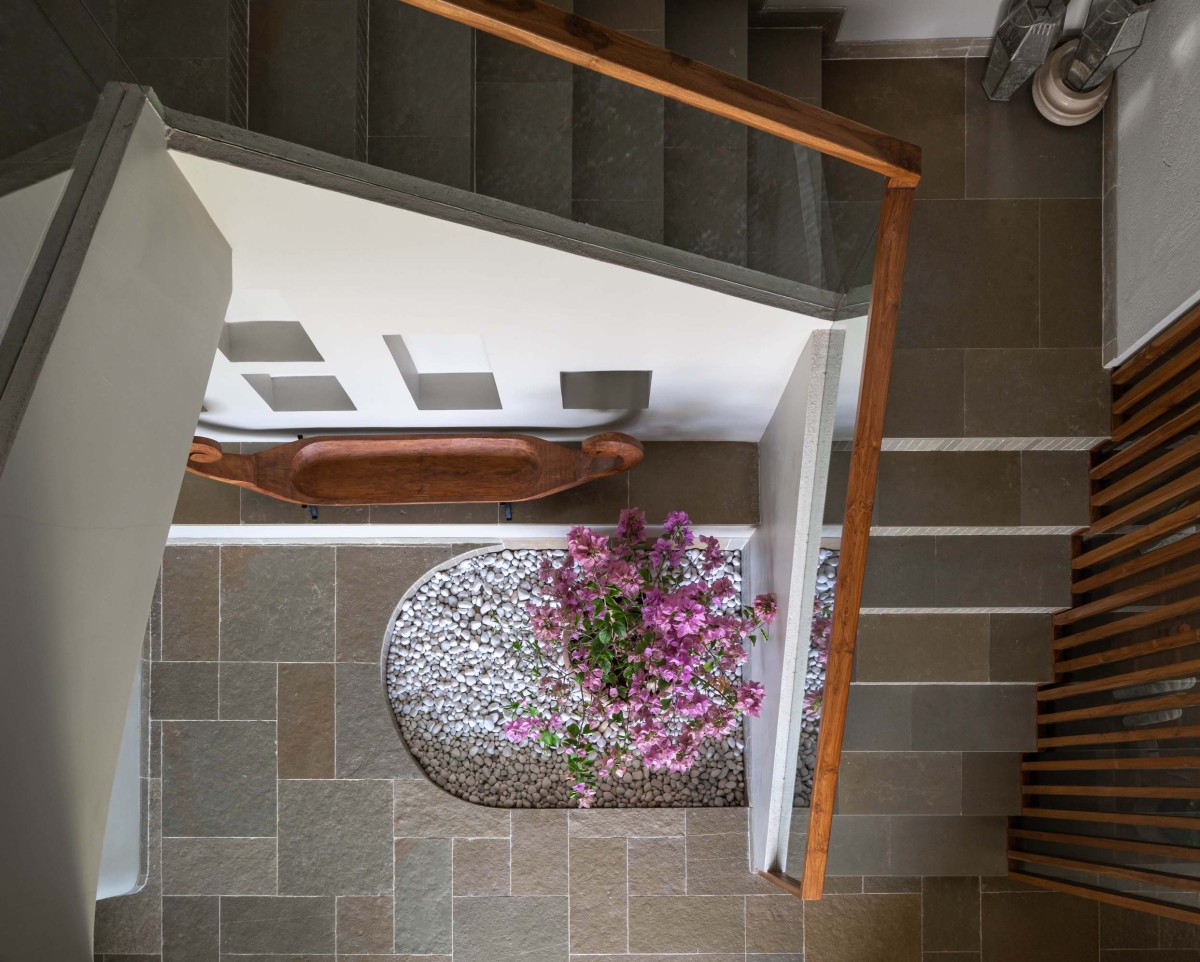 The house occupies the open western half of the 1 acre plot with the dense coconut grove to its east, preserving every tree that stood on the site before construction. The home is imagined as a three-sided open courtyard layout, with the pool house at a distance completing the forth side. The layout consists of two parallel wings with the living area and guest room on the west and the lower master bedroom in the east, connected by the semi-public spaces such as the covered verandas, kitchen and the staircase. Most of the public and private spaces open towards the north, facing pool house and lawn, drawing in the mellow, indirect light throughout the day.