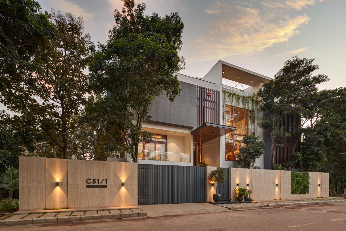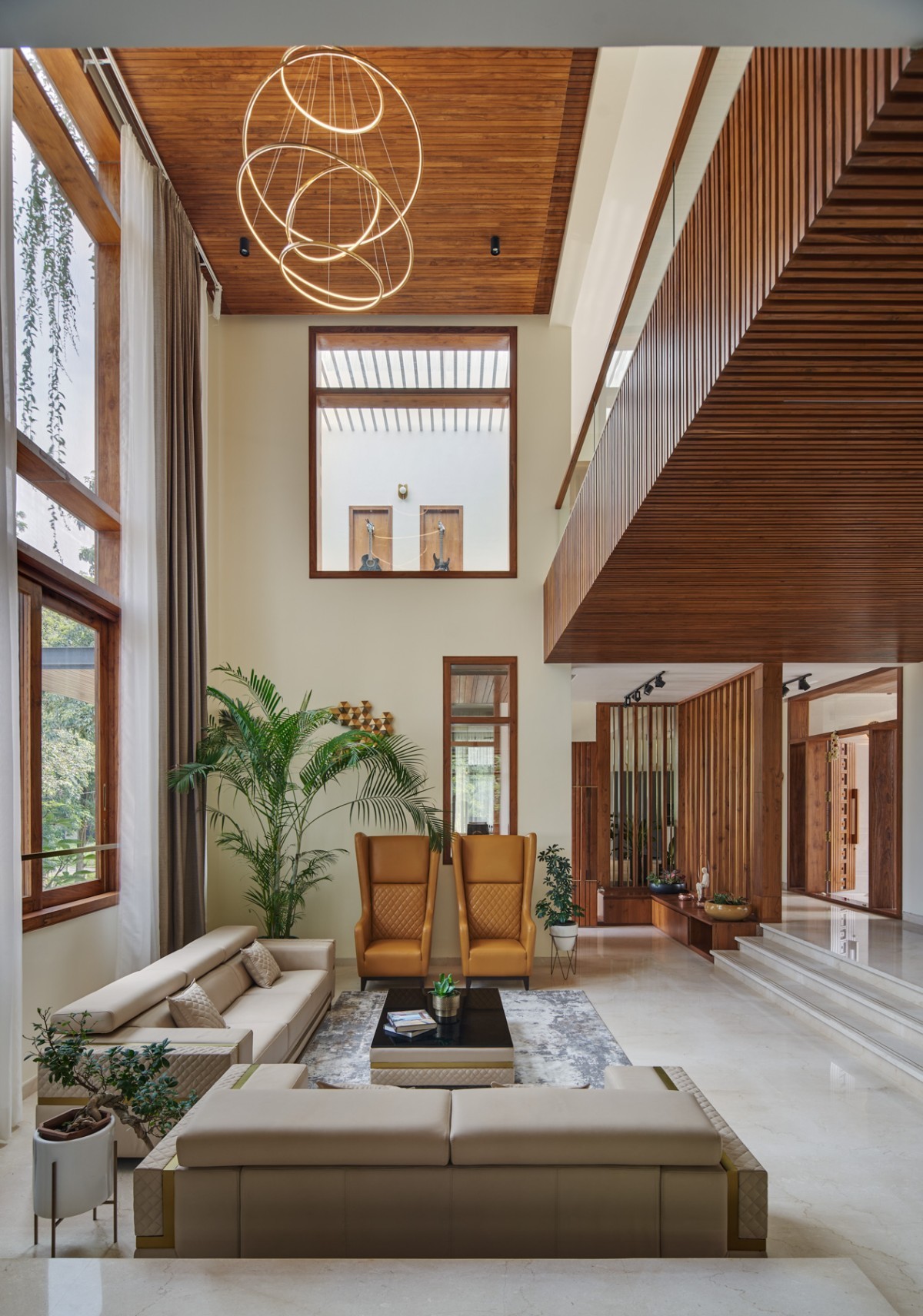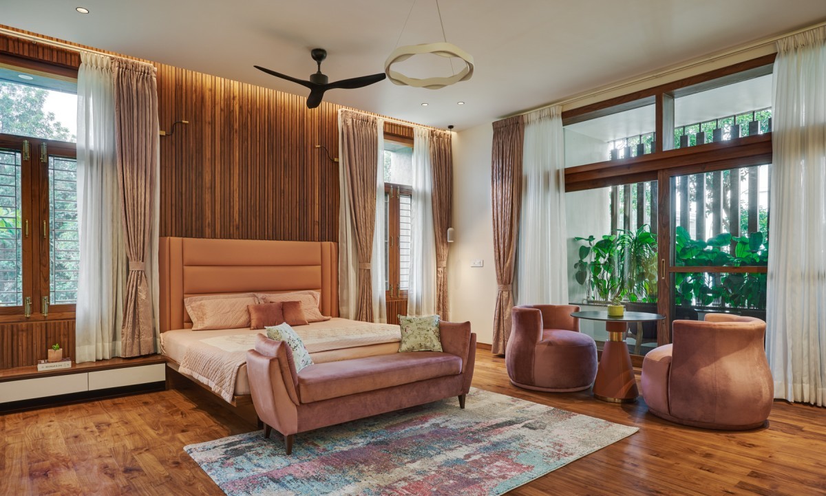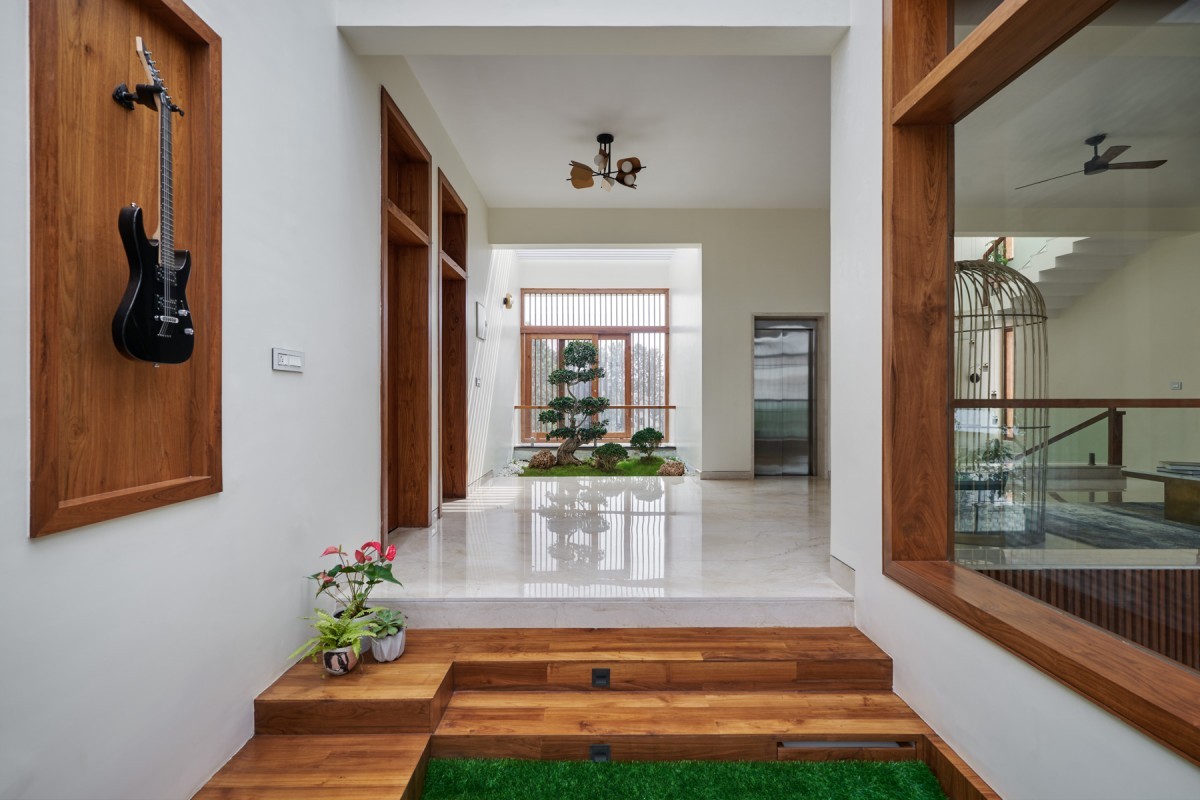 The Material palette's main components are concrete, wood, and marble. Throughout the house, a warm and delicate color tone has been maintained. Over the beautiful and delicate grey and white tones, the wood functions as the dominating and predominant tone. From the Foyer wall to the flamboyant ceilings over the hallways, the house's interiors include a fair number of timber features. This color palette, which includes some green, creates an intimate connection.