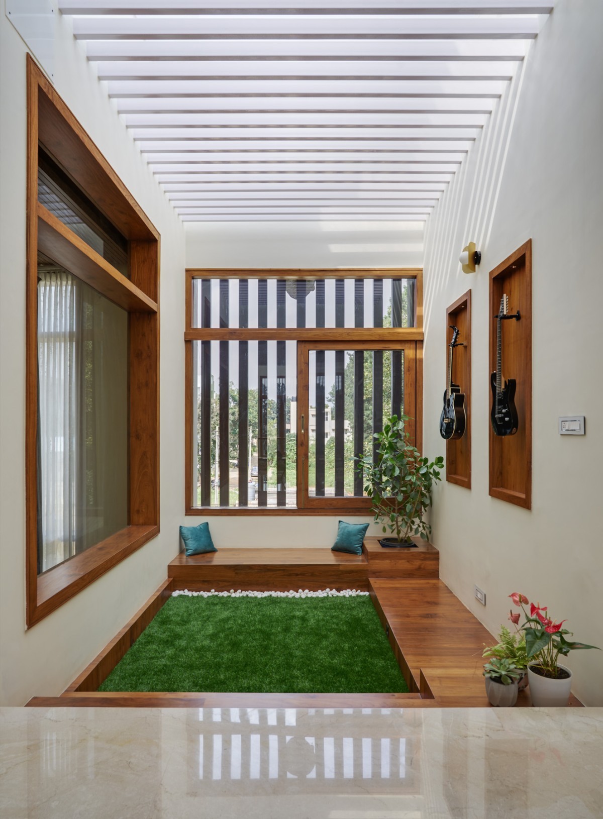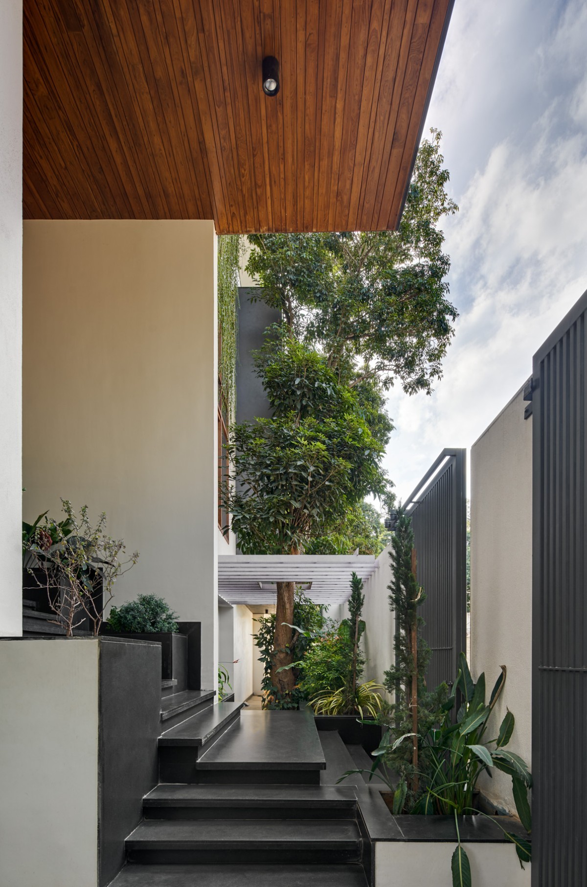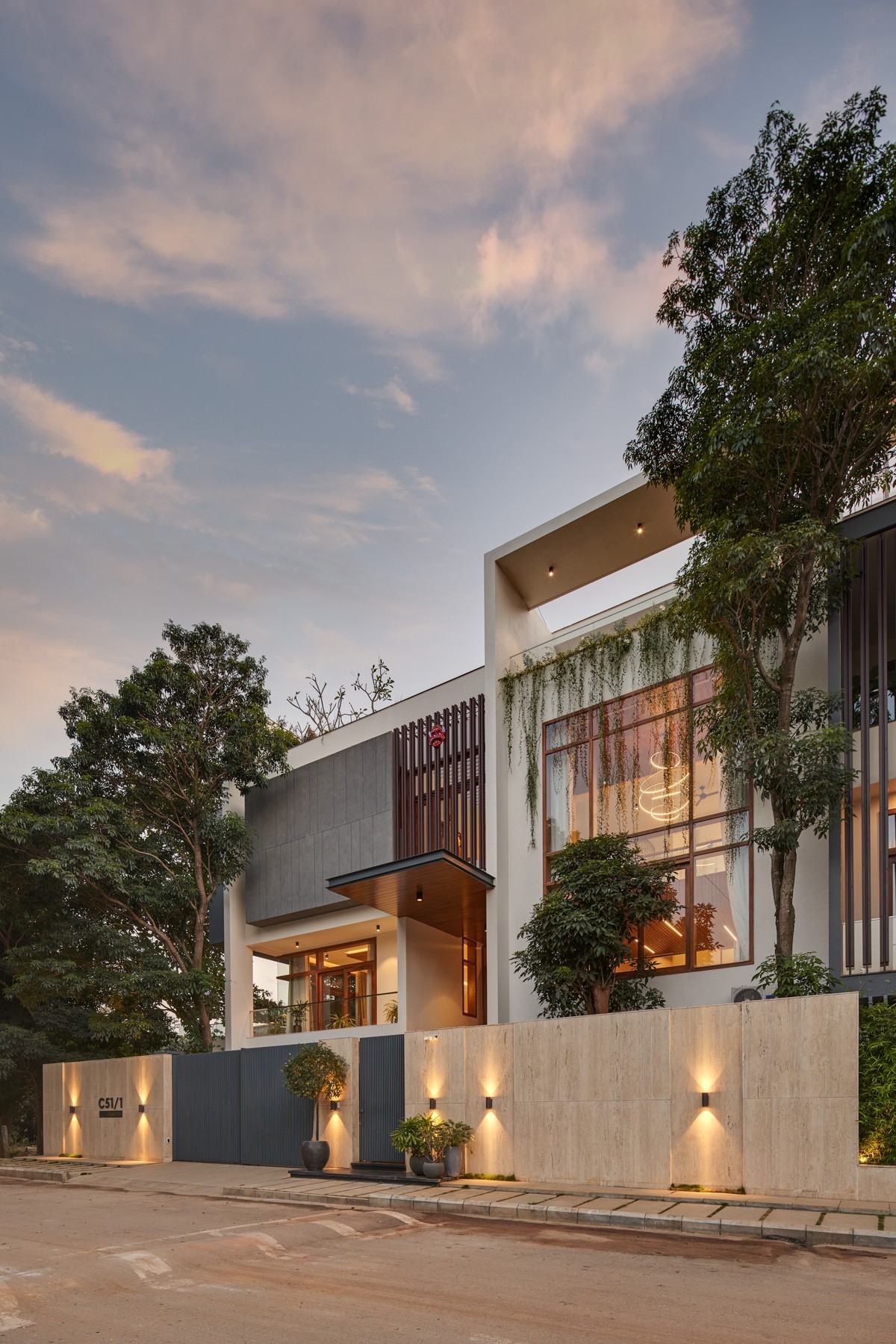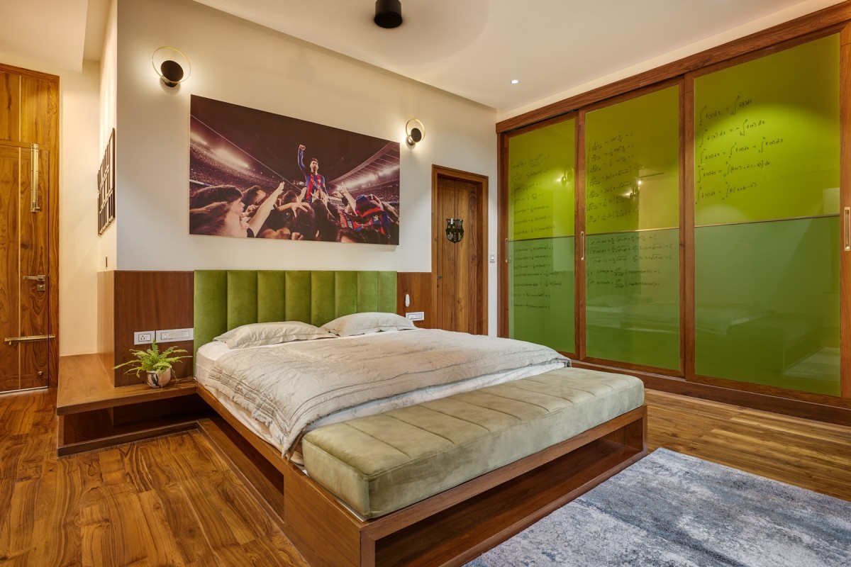 The Material palette's main components are concrete, wood, and marble. Throughout the house, a warm and delicate color tone has been maintained. Over the beautiful and delicate grey and white tones, the wood functions as the dominating and predominant tone. From the Foyer wall to the flamboyant ceilings over the hallways, the house's interiors include a fair number of timber features. This color palette, which includes some green, creates an intimate connection.