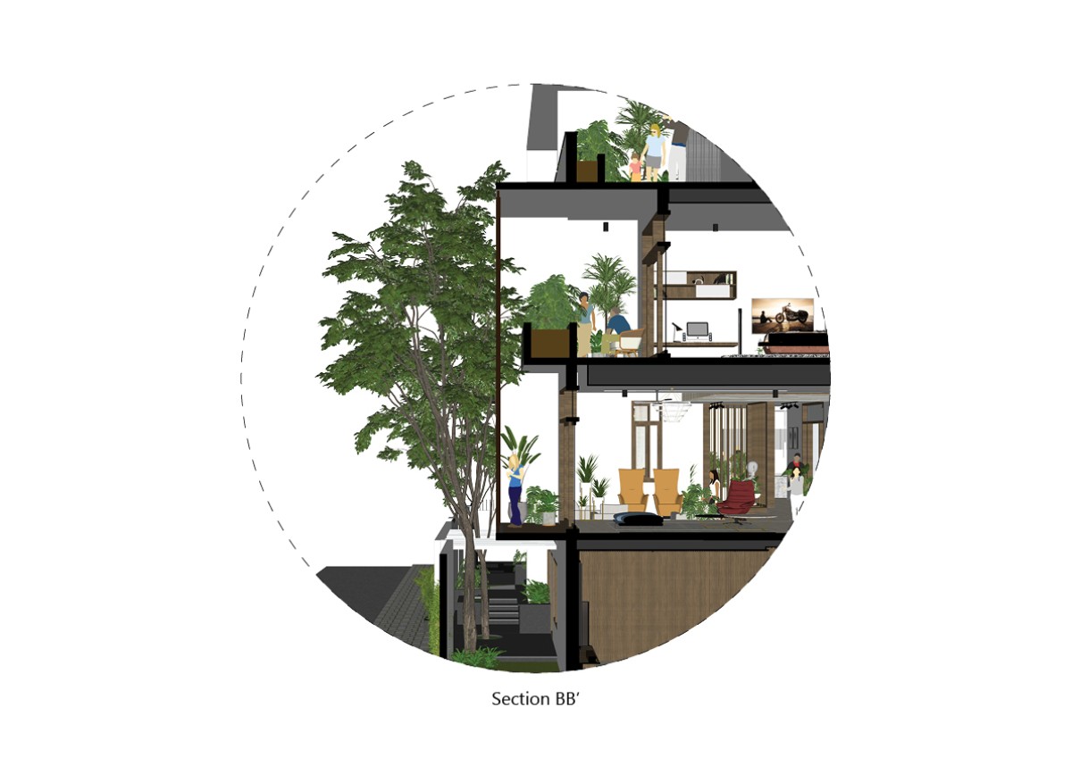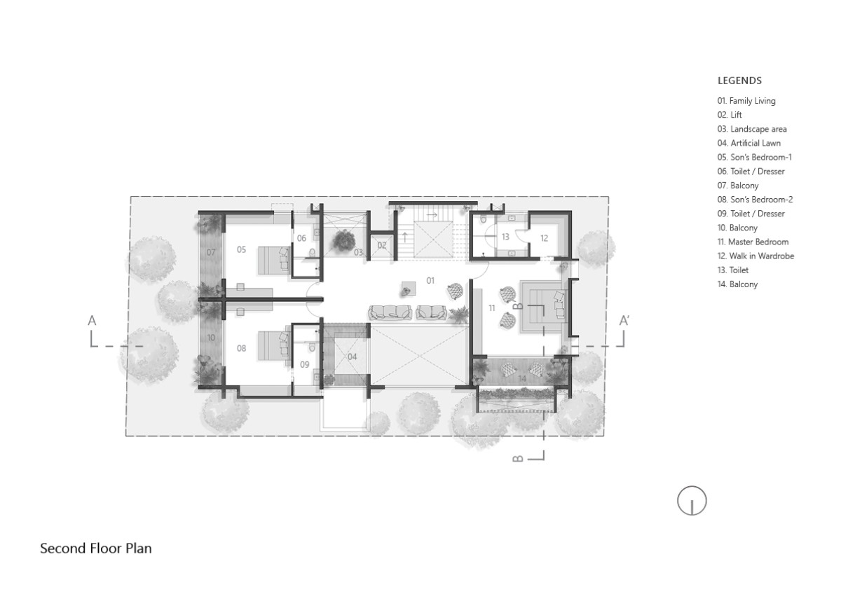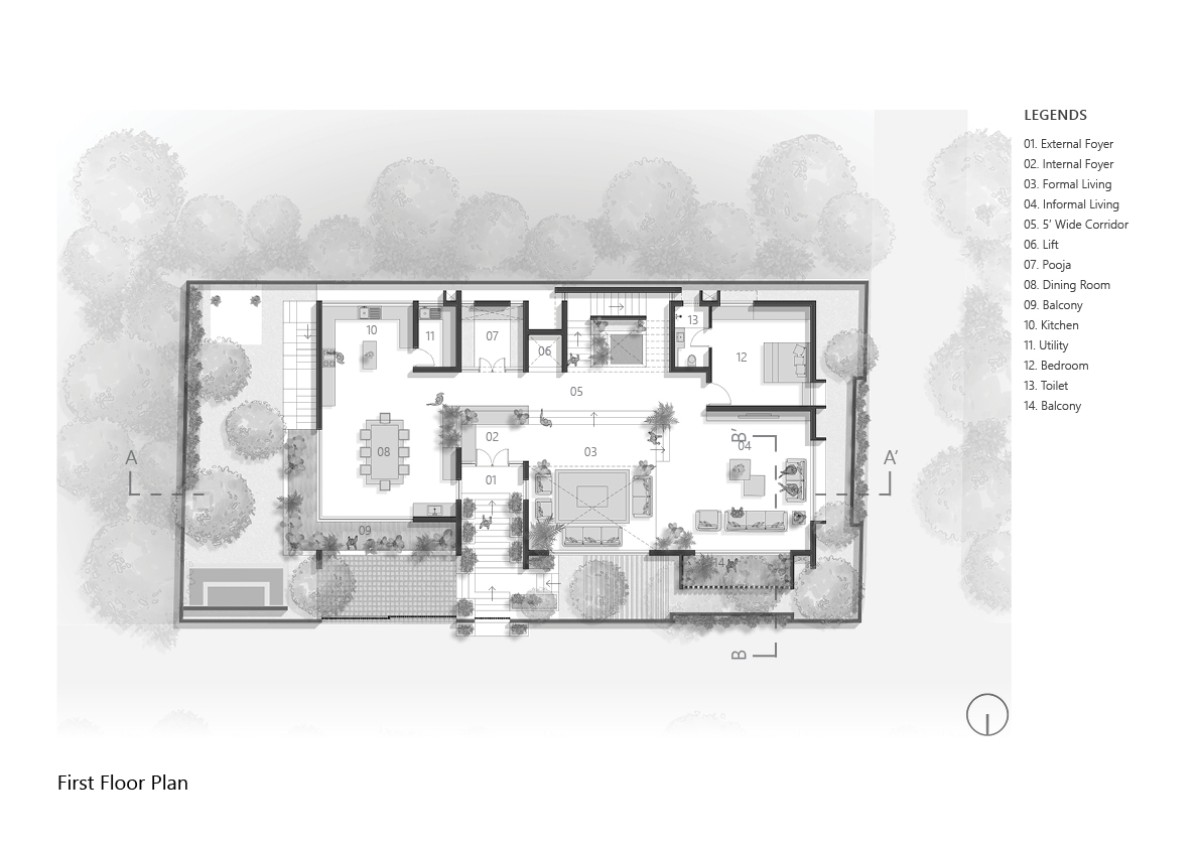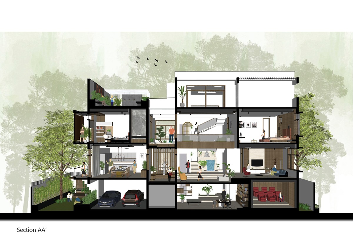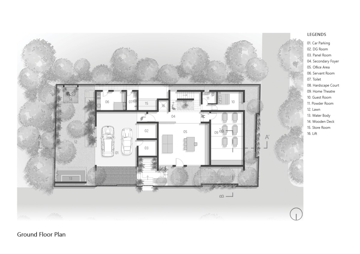 The Master of this project is the Floor Plan, which drives the whole design. On the outside, this design creates an L-shaped landscape on the north-eastern side, which attracts more wind and evening shade than sunlight. Around the inside, the layout is centered on a central water body on the first level, which serves as a vertical connection between all floors.
