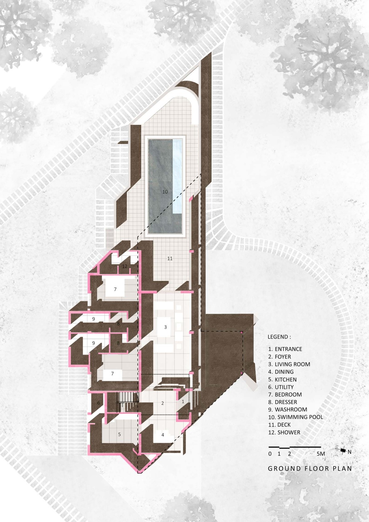 Through this interplay of geometric form, programmatic hierarchy, and environmental response, the design dissolves conventional binaries of front/back, inside/outside and transforms a neutral site into an architectural field of movement, orientation, and layered thresholds.