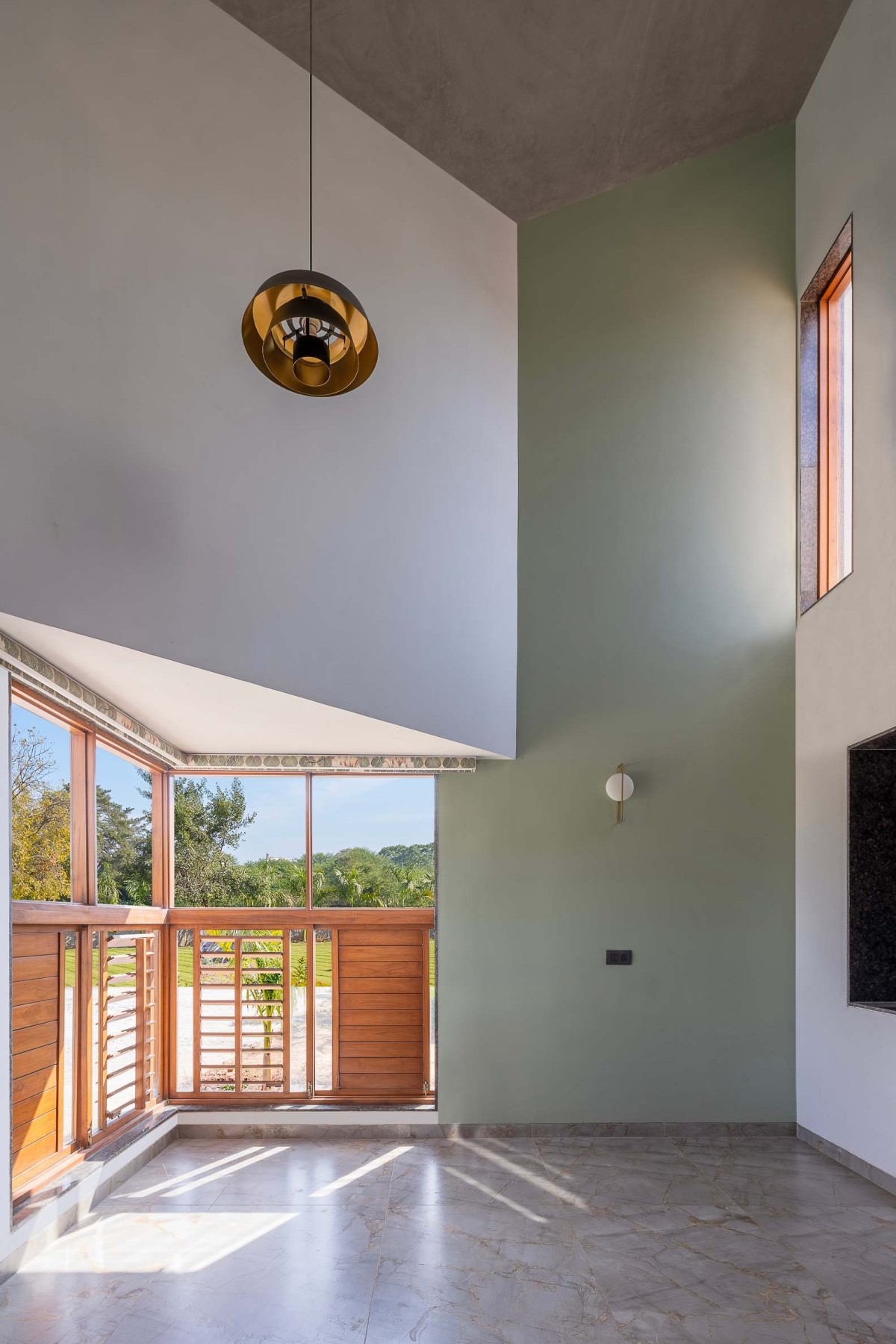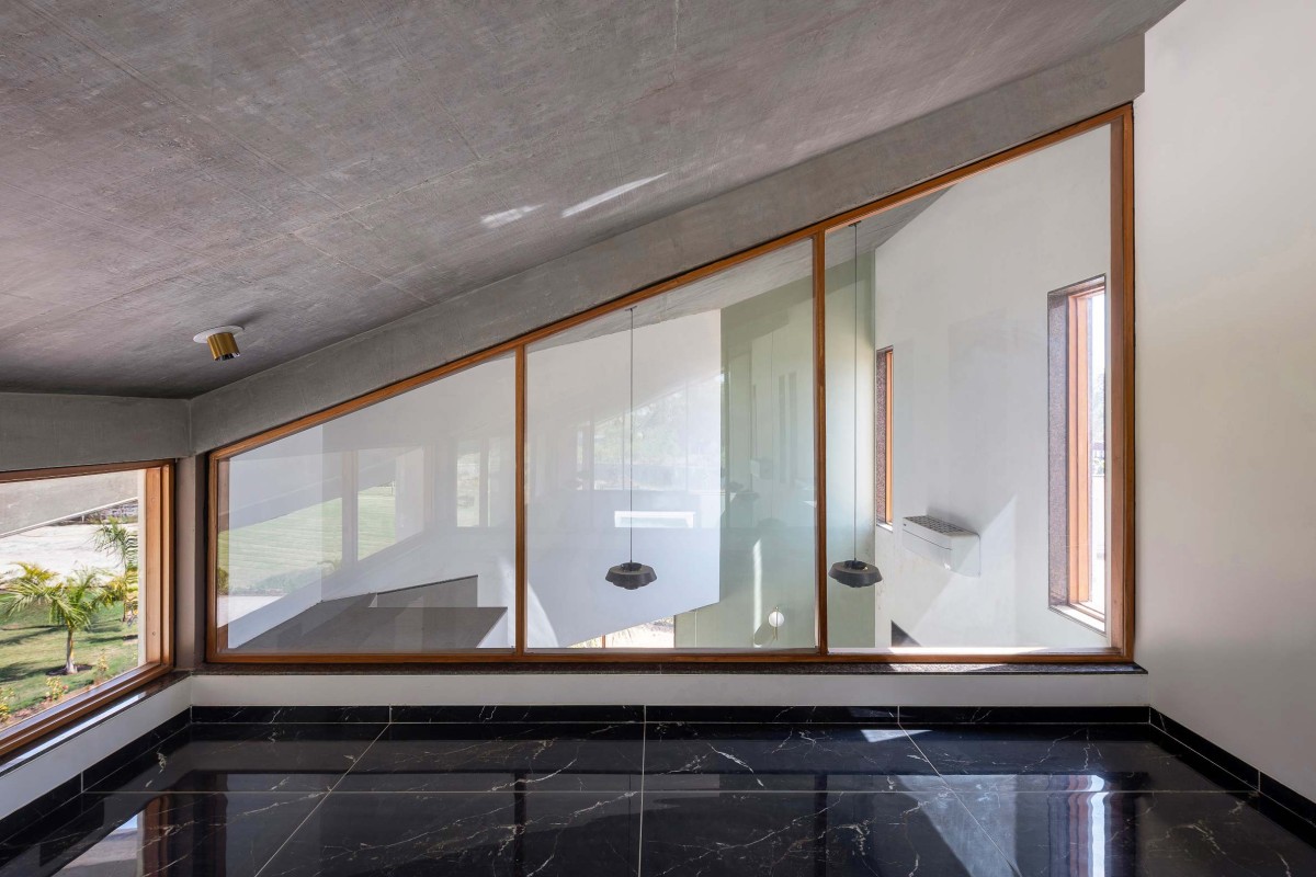 The Randheja House adapts this dual quality of the rhomboidal plan to unify its four elevations while allowing each side to address distinct programmatic and environmental conditions. On the east side, the scheme’s angled geometry choreographs the arrival sequence, guiding entrants toward the drop-off point and principal entry into the house. To the north, the roof slopes steeply downwards to frame the vista, intensifying views of the garden and embedding the landscape within the interior experience. On the south, a jacket-like façade folds around the structure, shielding it from the harsh summer sun while enclosing service areas at the rear and on the terrace. Its sculptural treatment restores architectural presence to what might otherwise be a utilitarian elevation.