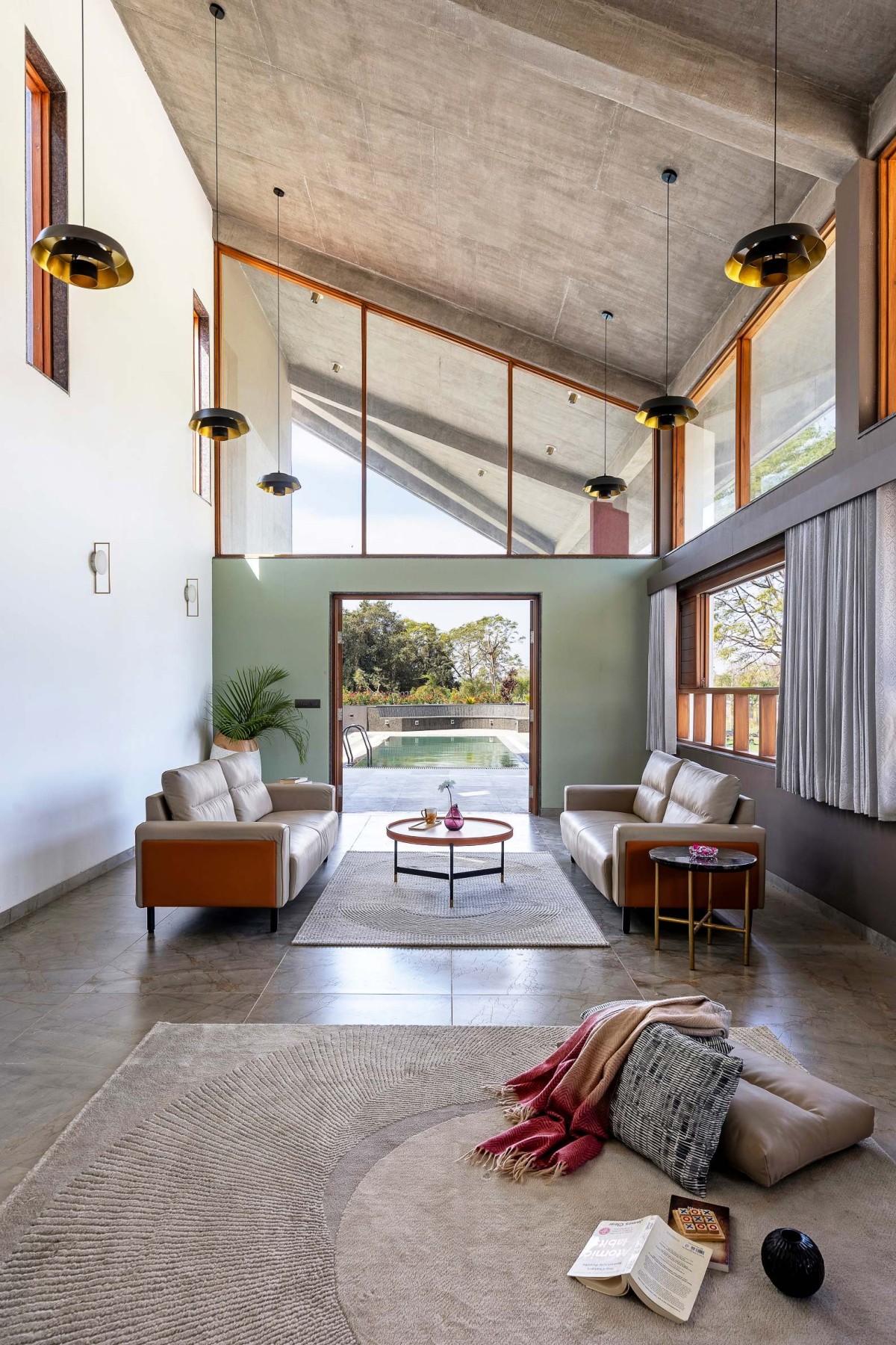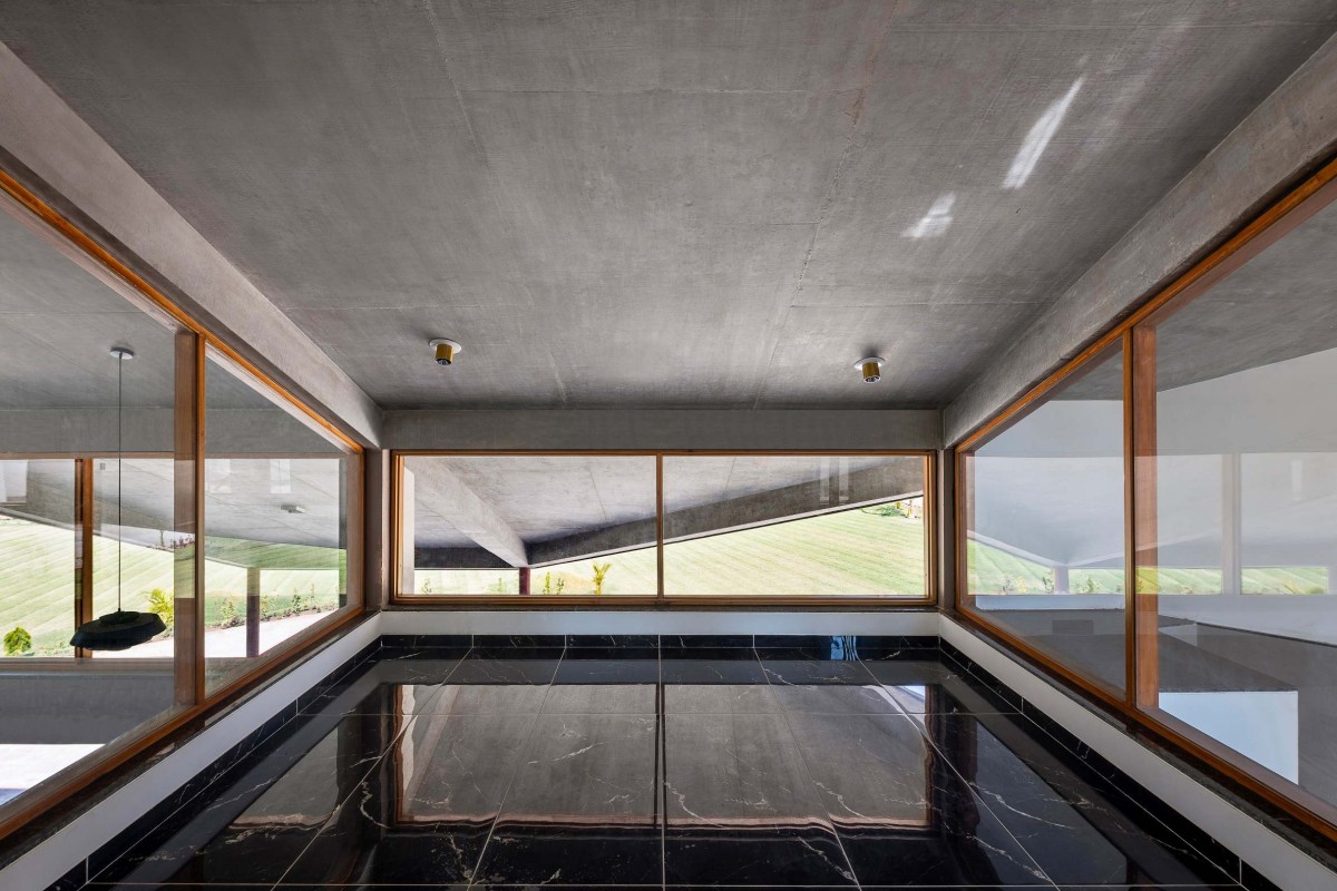 On the west, the living room projects out toward the pool, sheltered from above by the cantilevered beak of the roof. The roof’s chamfered edge runs parallel to the pool deck, producing a shared geometry that marks the project’s spatial climax—an open release from enclosed interiority into the surrounding landscape.