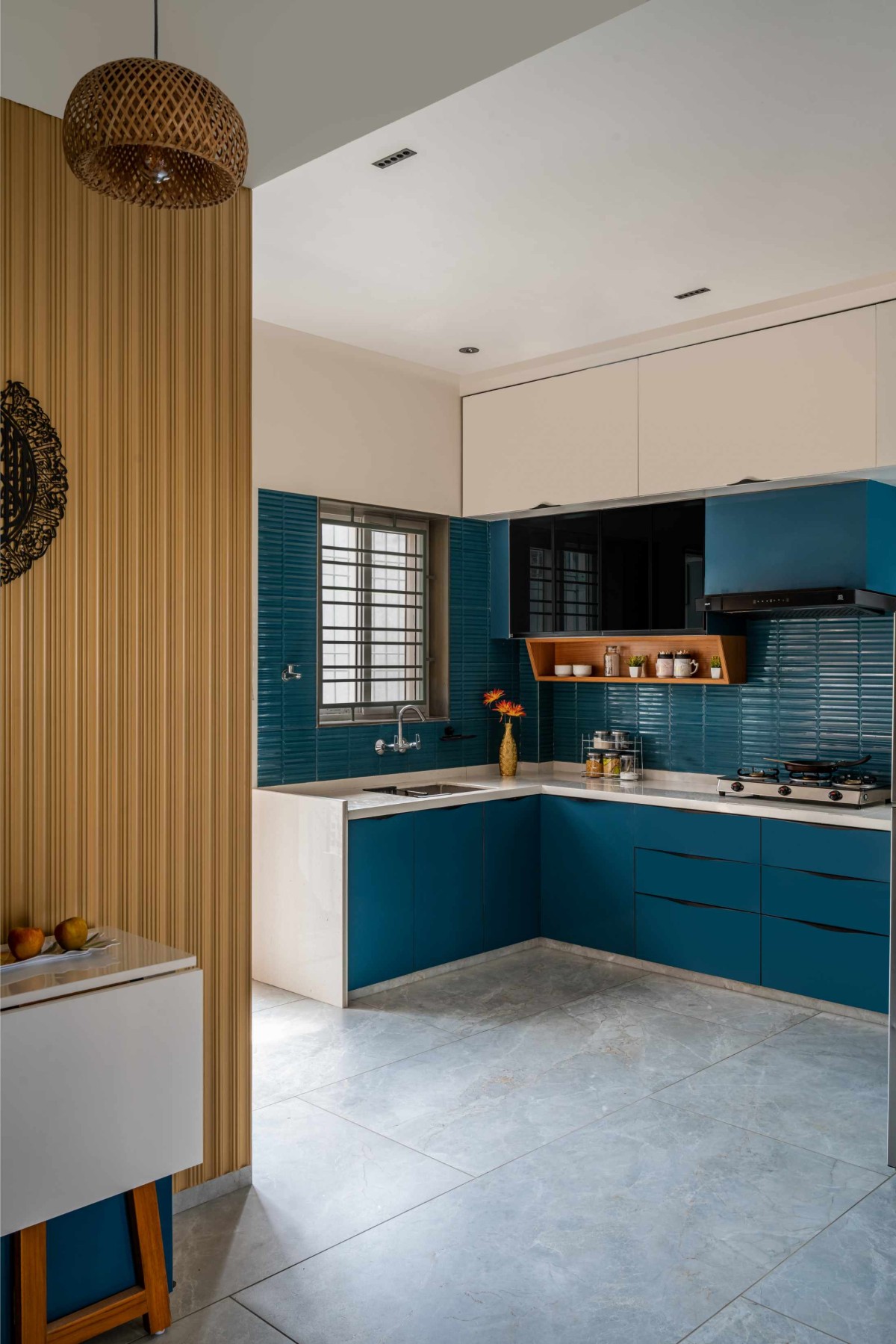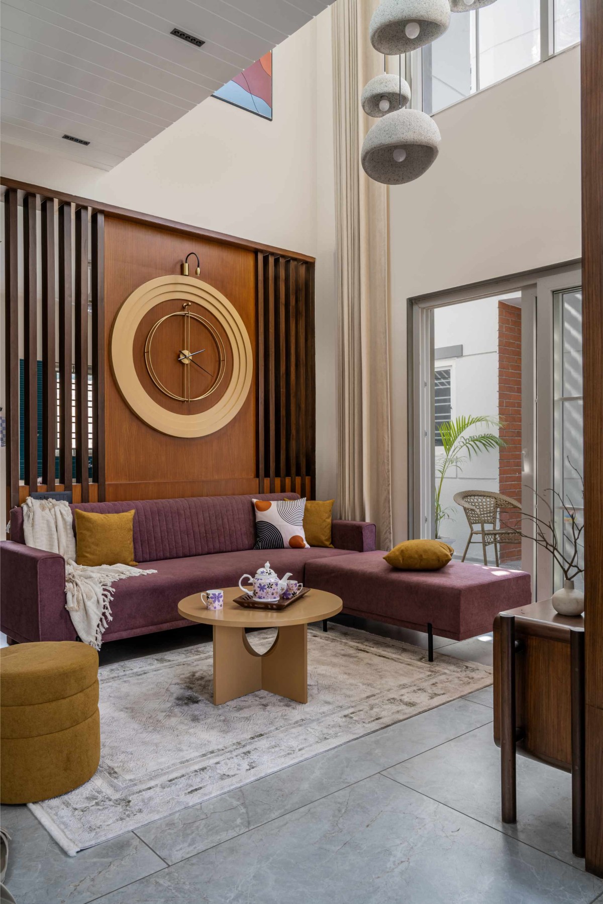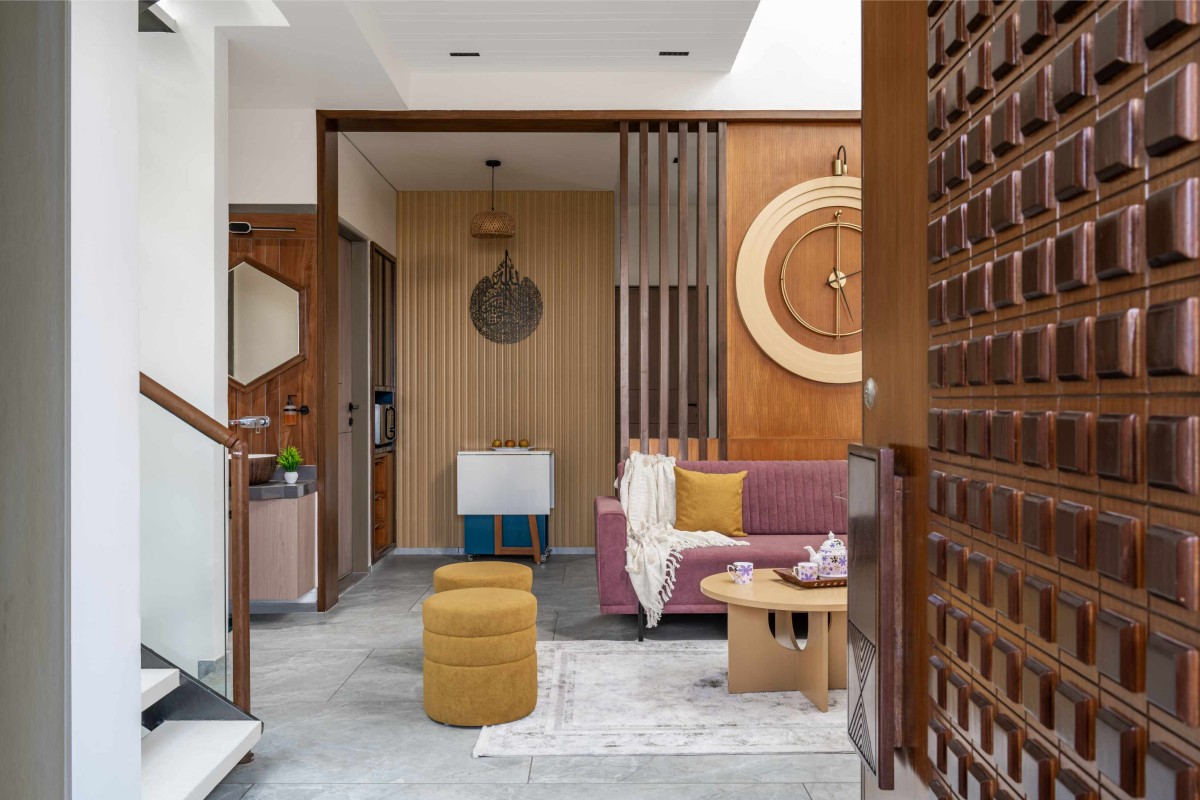 The entrance design exudes simplicity and elegance, with a welcoming aesthetic. As one enters the drawing room, the eye is drawn to a wooden partition and mustard yellow fluted paneling. Wooden partitions separate the kitchen and drawing room, while wooden fins create openness between the two spaces.