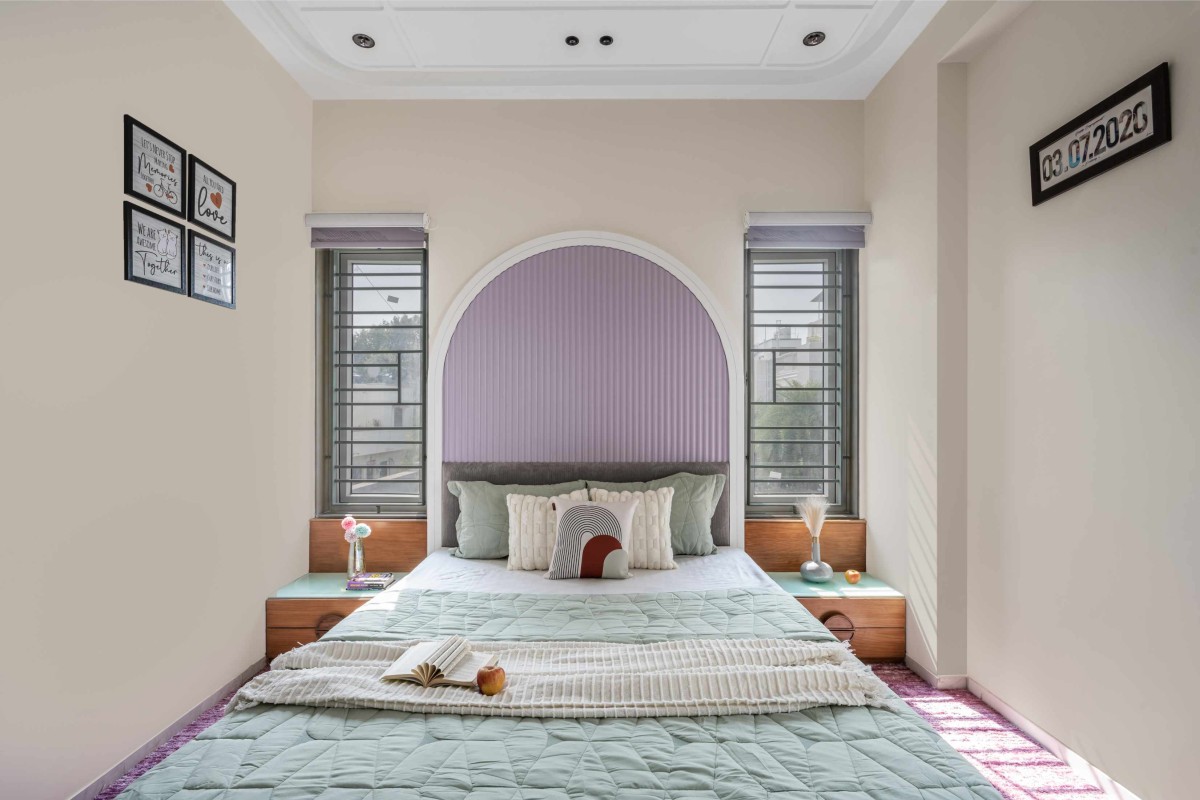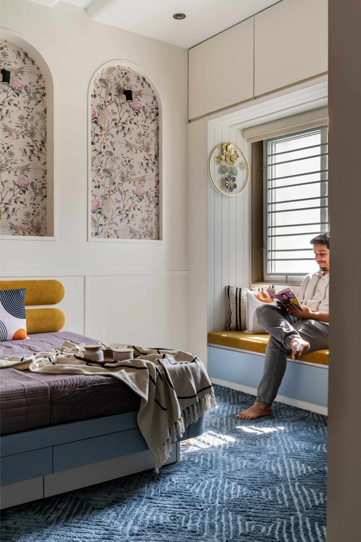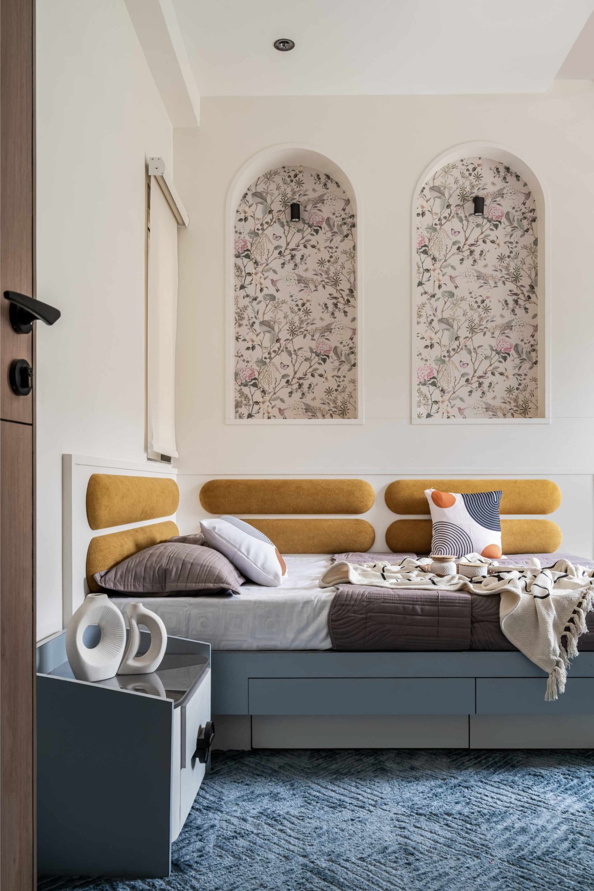 The parents’ bedroom exudes a seamless blend of modern luxury and simplicity. Beige walls and floral wallpaper in arched frames create an elegant and peaceful look, while the pastel yellow bedback establishes a calming atmosphere. A small seating area by the window provides a direct view of outdoor activities.