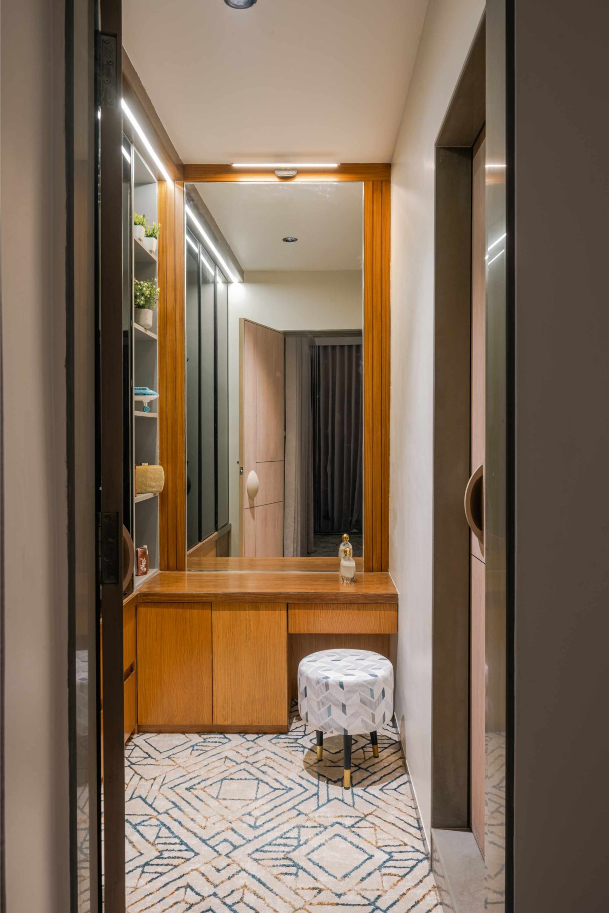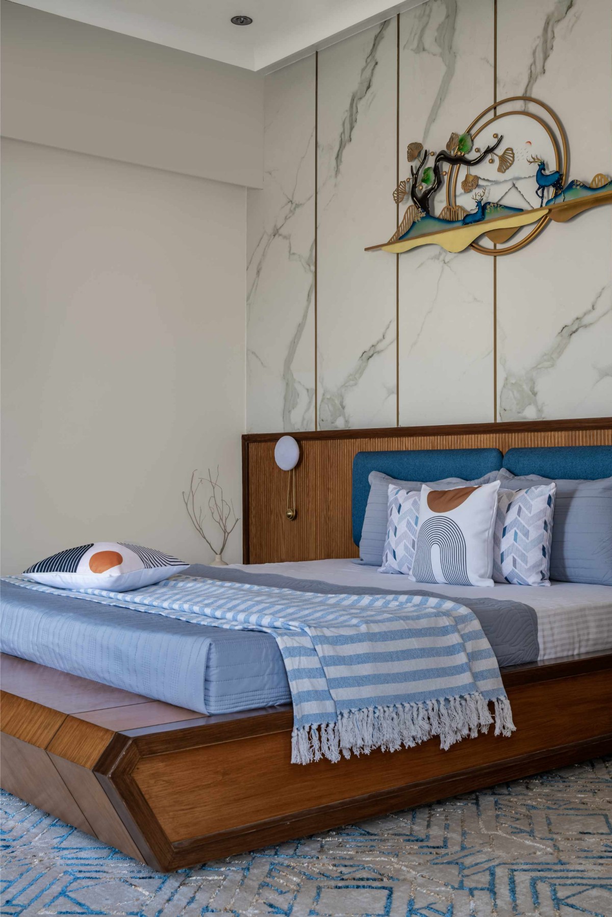 In the master bedroom, brown teak wood finishes and soft beige tones create a soothing atmosphere. The bed, custom-designed for the room, features a teak wood veneer finish. Subtle brass inlays in the white tile paneling and elements bring elegance and warmth to the room, harmonizing with the metal artifacts.