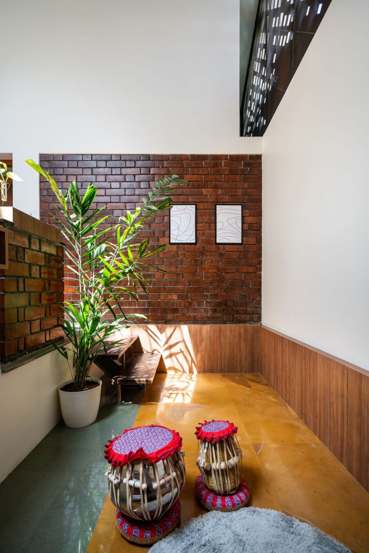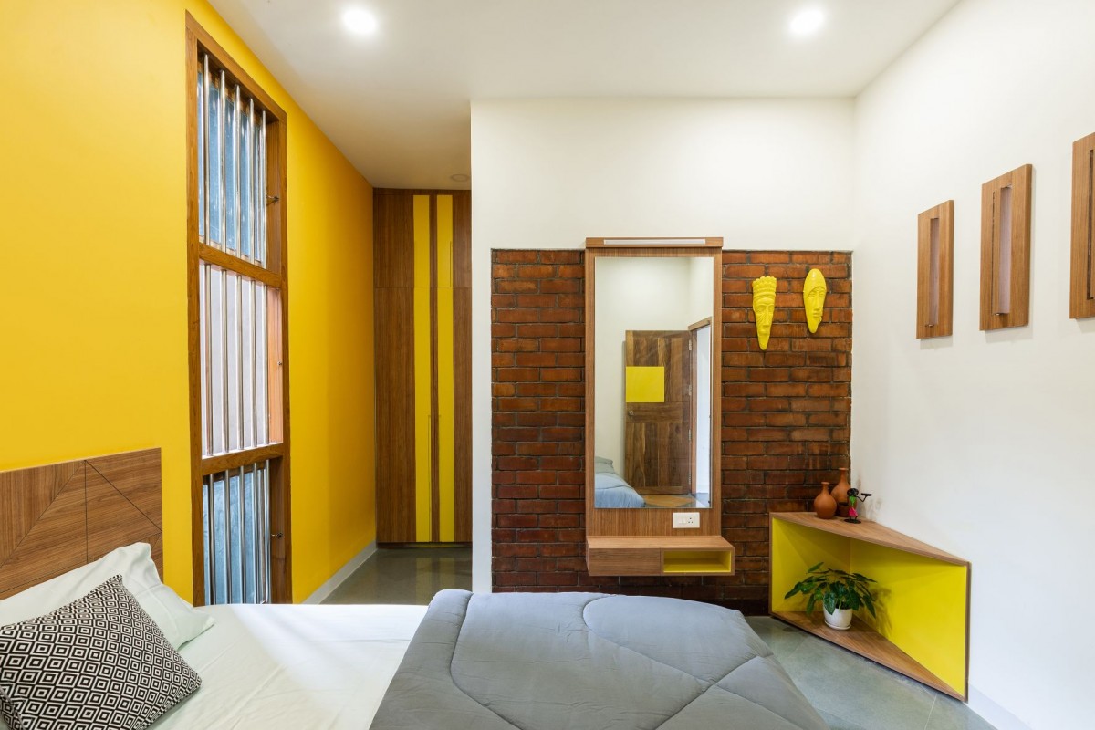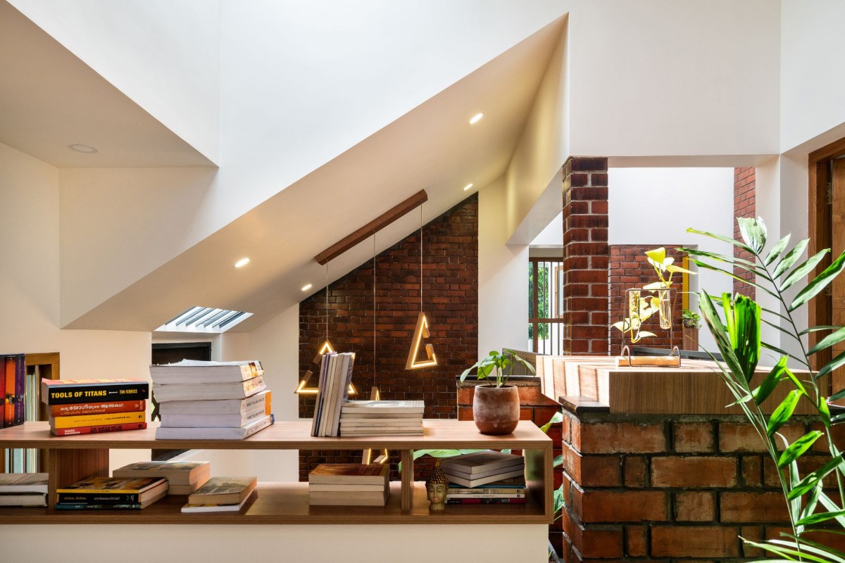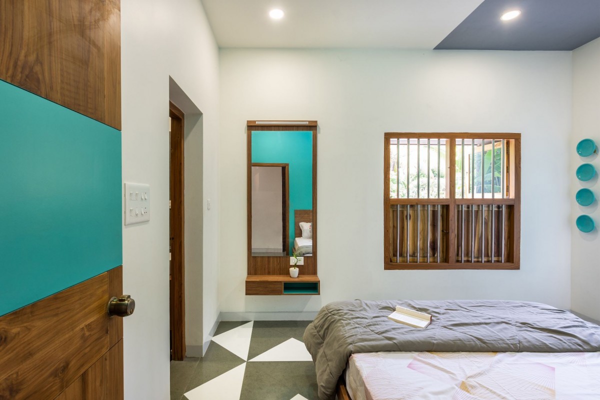 House Dyuthi evokes a bohemian aesthetic essence in terms of having a base color for each space, low height furniture, flooring patterns and abundance of indoor plants. Indoor plants help to reduce the stress level and keeping a clean indoor air by absorbing toxins. Bedrooms have inbuilt bed coat with storage units, side table, wardrobe and mirror unit that follow a base color and consistent wooden finish. We also took the opportunity to explore customized hanging and wall mount lights which reflect the same design philosophy.