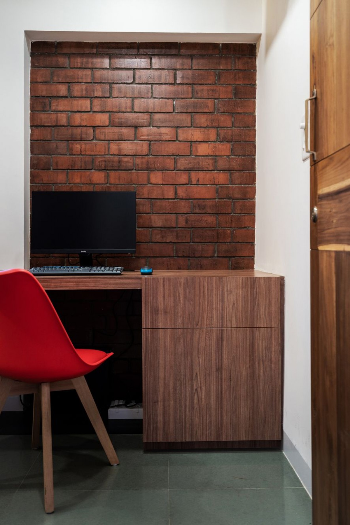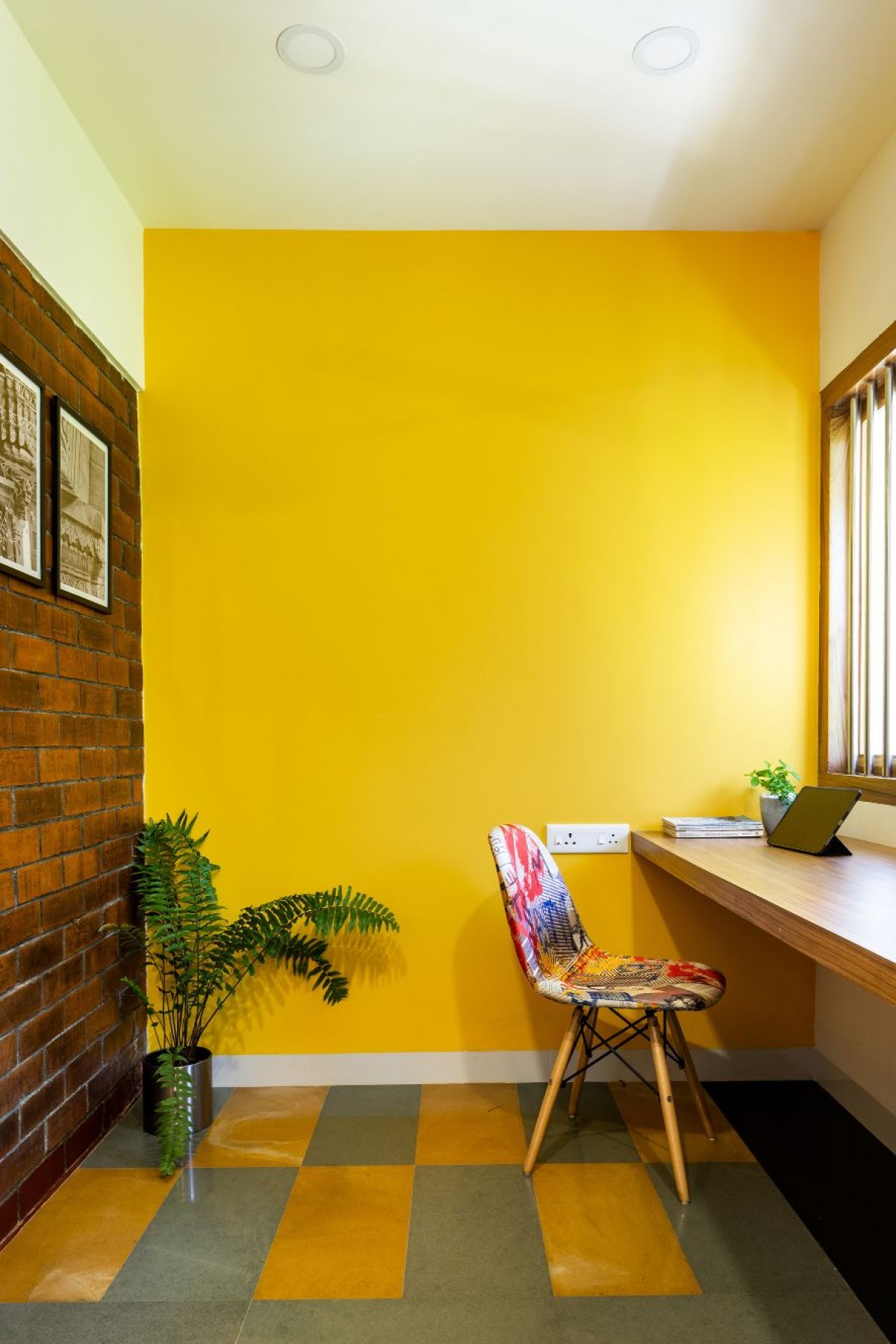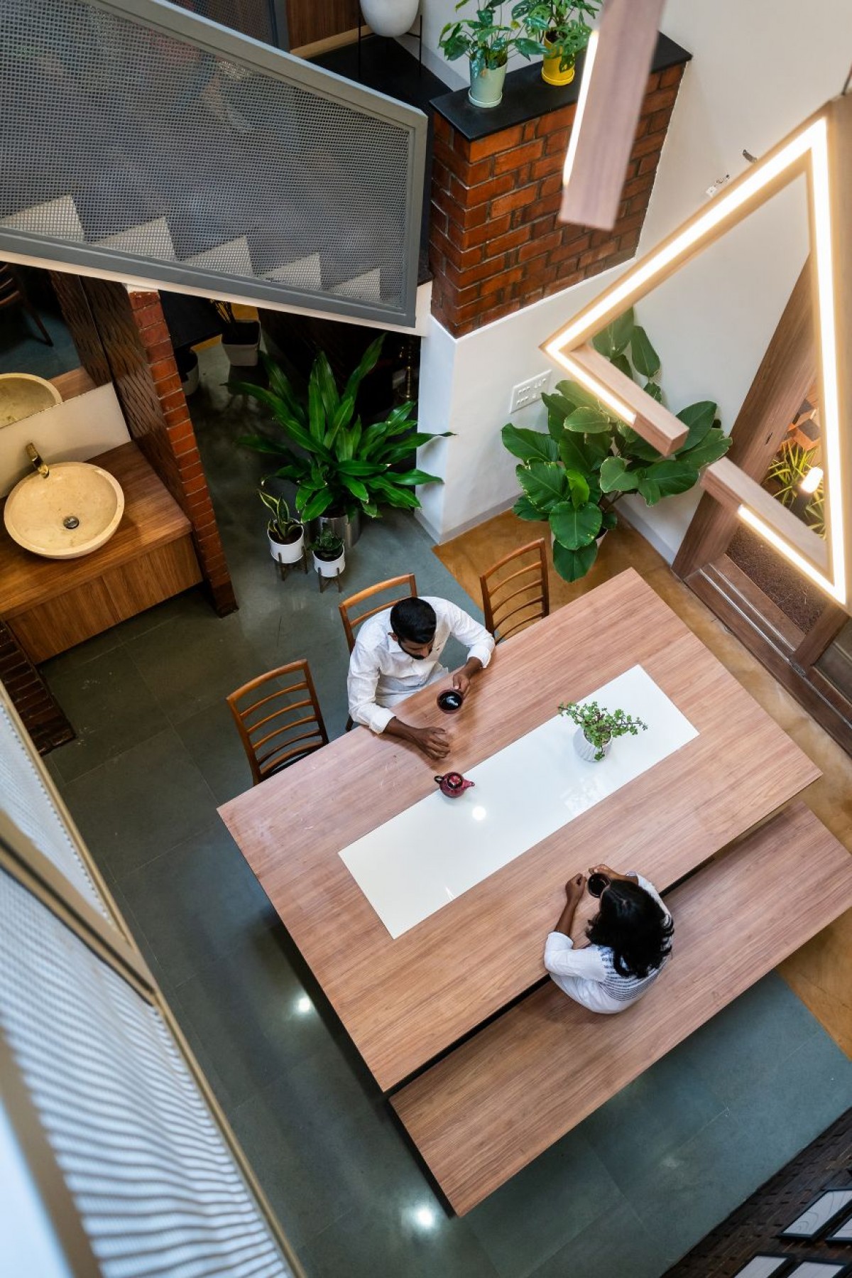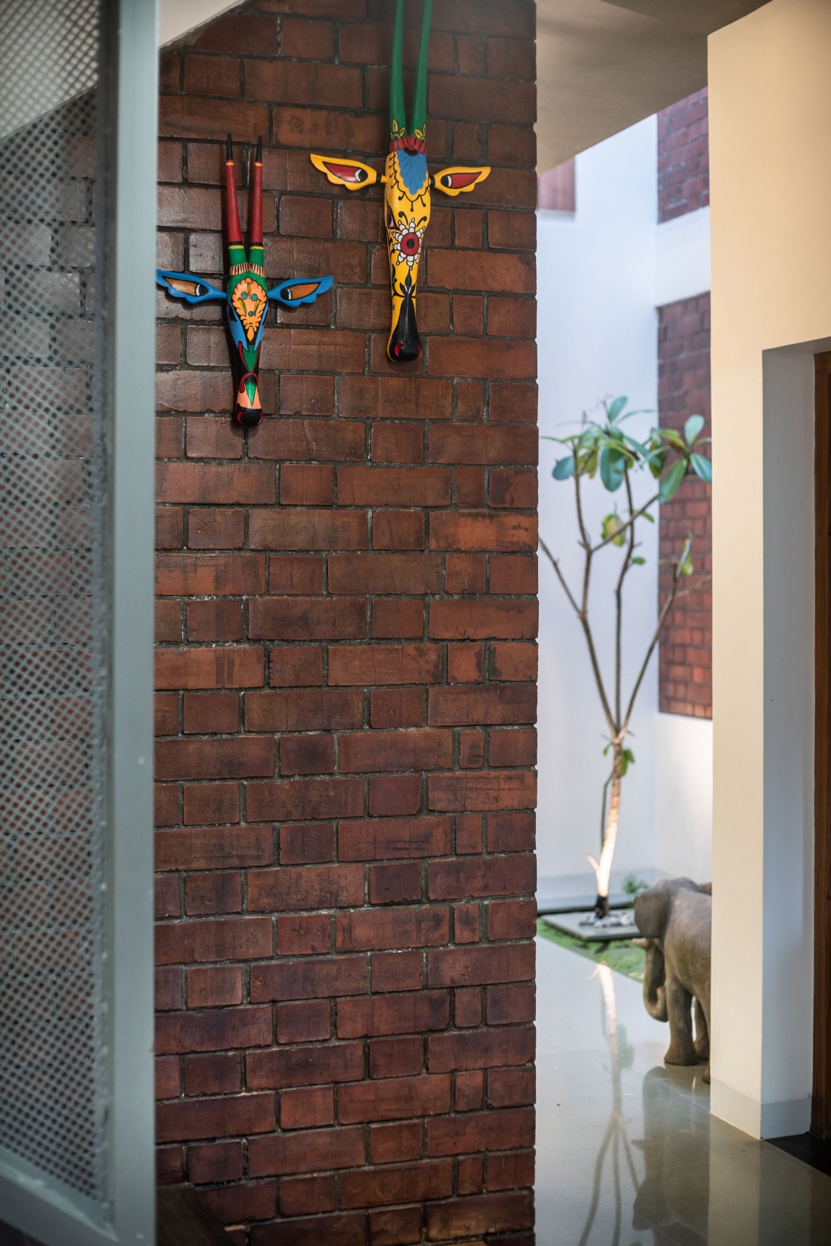 House Dyuthi evokes a bohemian aesthetic essence in terms of having a base color for each space, low height furniture, flooring patterns and abundance of indoor plants. Indoor plants help to reduce the stress level and keeping a clean indoor air by absorbing toxins. Bedrooms have inbuilt bed coat with storage units, side table, wardrobe and mirror unit that follow a base color and consistent wooden finish. We also took the opportunity to explore customized hanging and wall mount lights which reflect the same design philosophy.