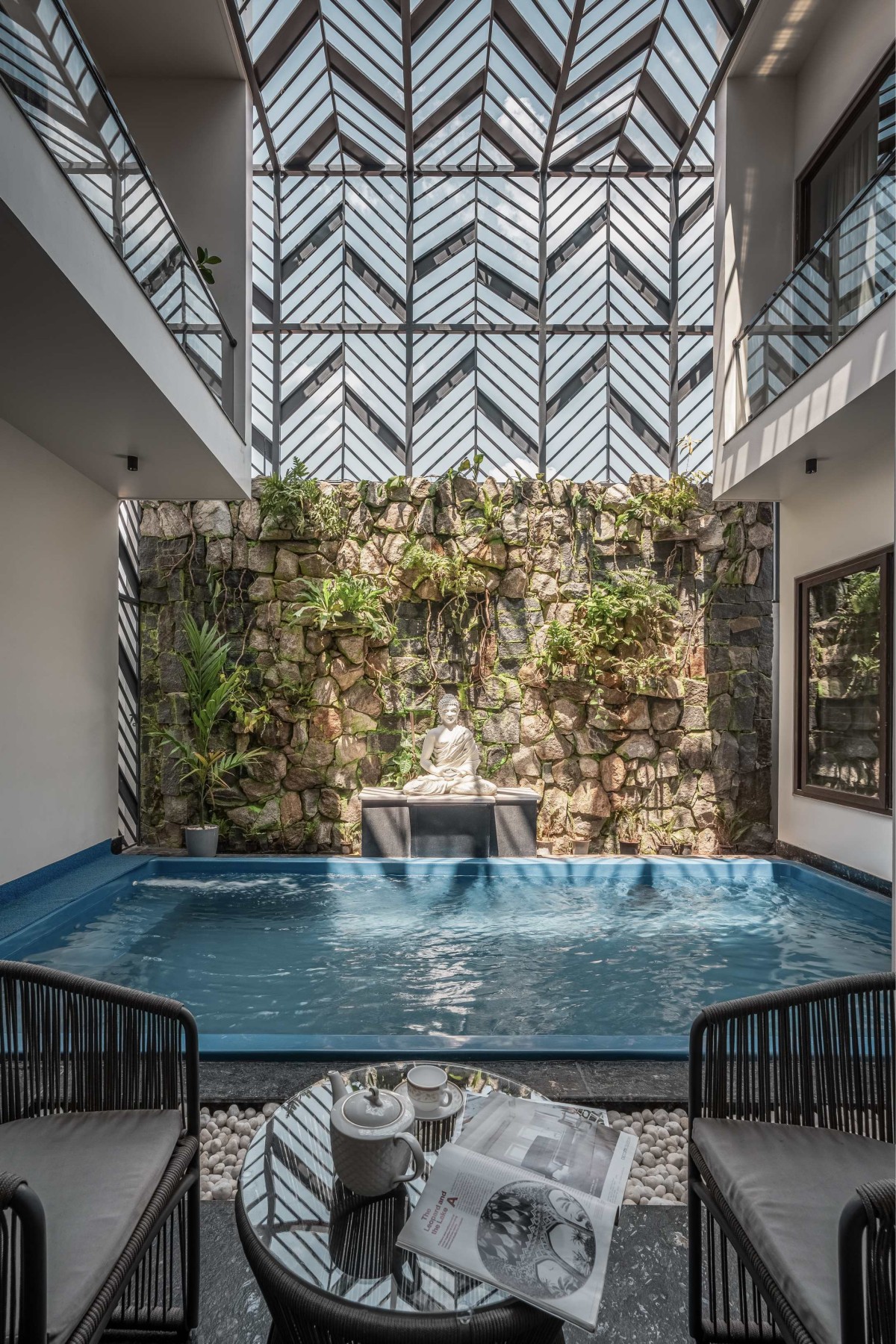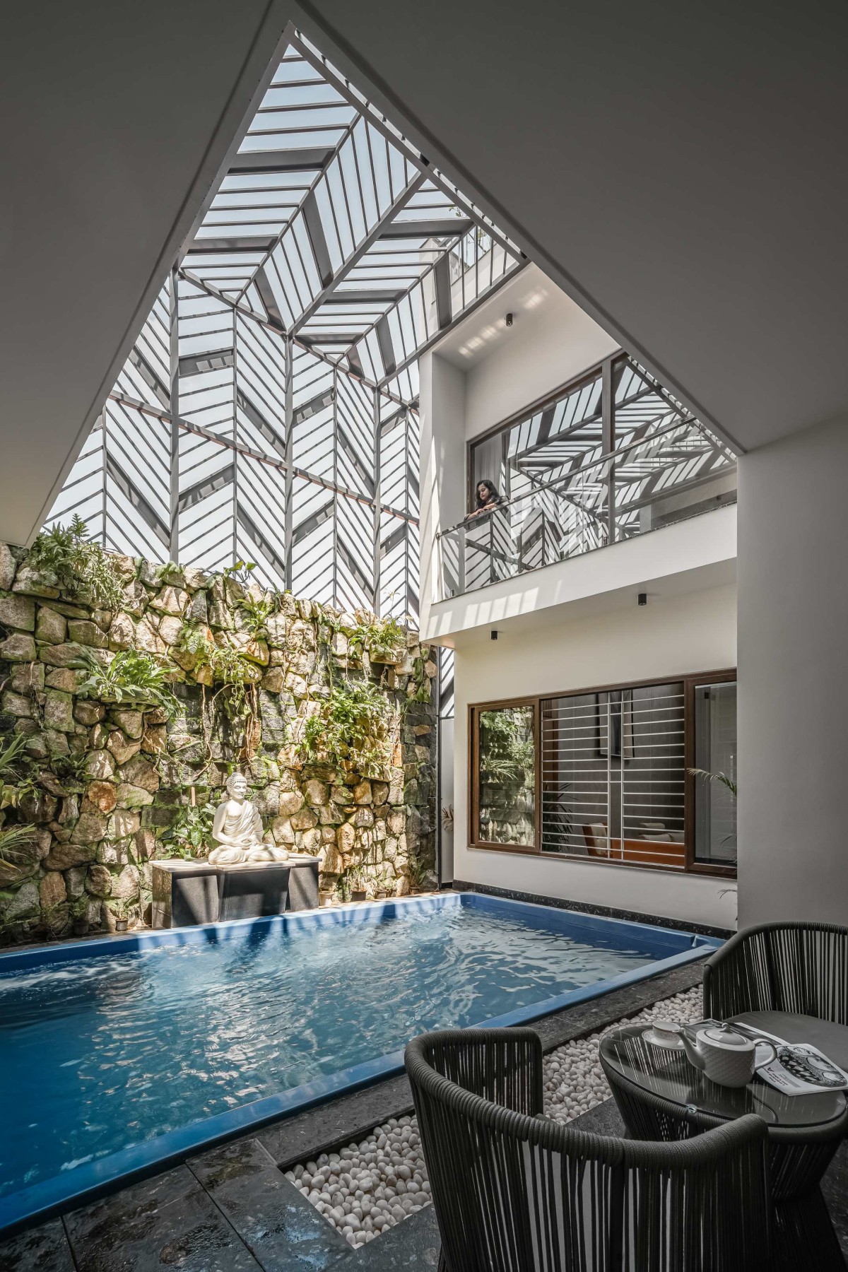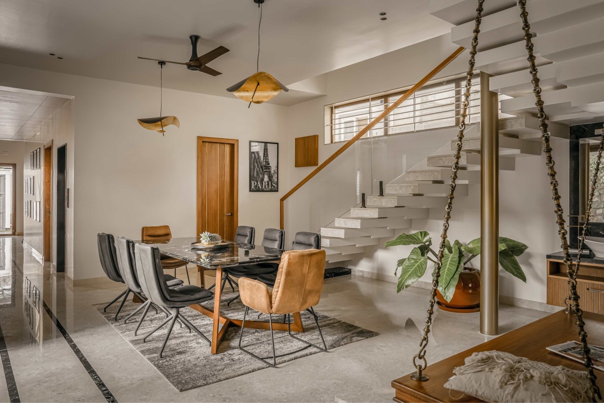 At the heart of the plan is a central courtyard, a quiet retreat that visually and spatially connects the living and dining areas, as well as the primary bedrooms above. The planning was done considering two courts, one being a sunken living area that aligns with the level of the landscape and swimming pool, inspired by traditional Kerala dual-courtyard concepts.