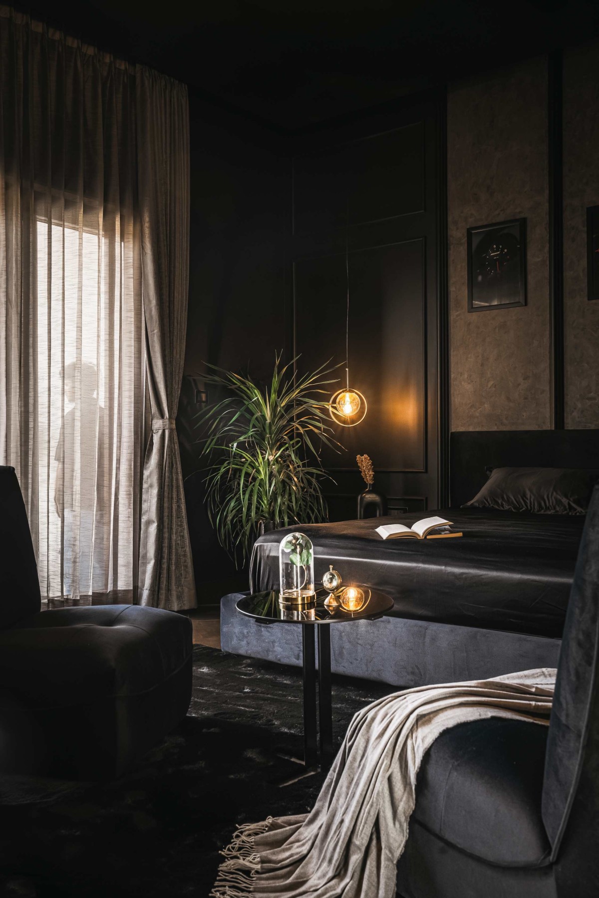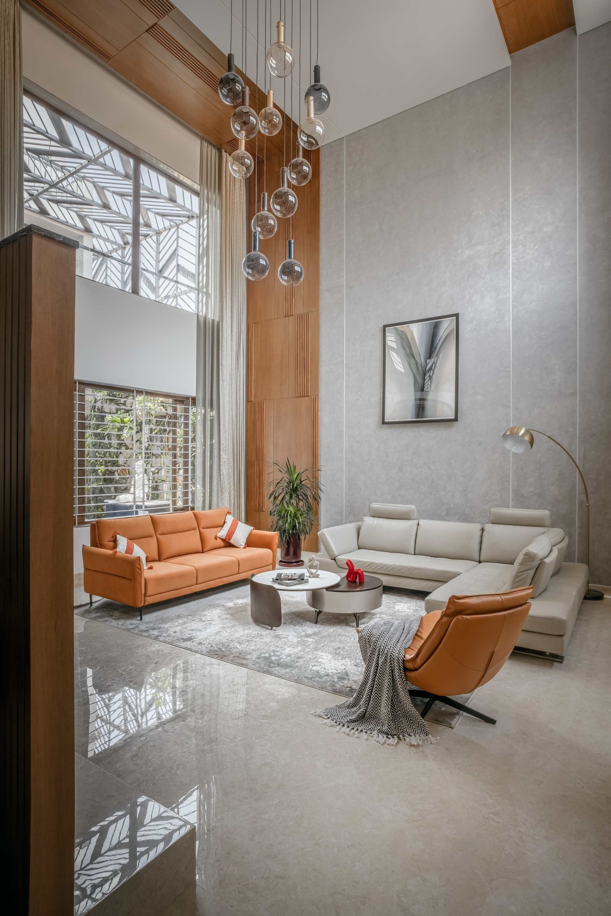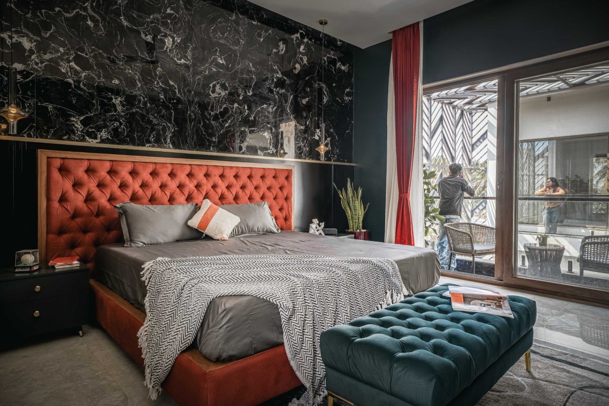 At the heart of the plan is a central courtyard, a quiet retreat that visually and spatially connects the living and dining areas, as well as the primary bedrooms above. The planning was done considering two courts, one being a sunken living area that aligns with the level of the landscape and swimming pool, inspired by traditional Kerala dual-courtyard concepts.