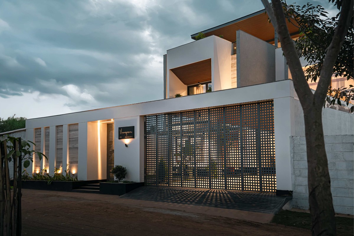 Dusk light exterior view of House Neeranjanam by Architecture + Swath
